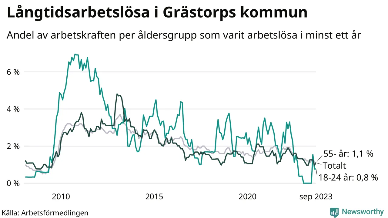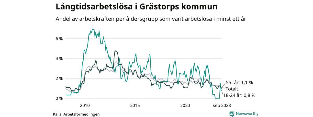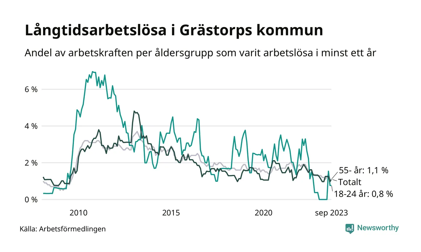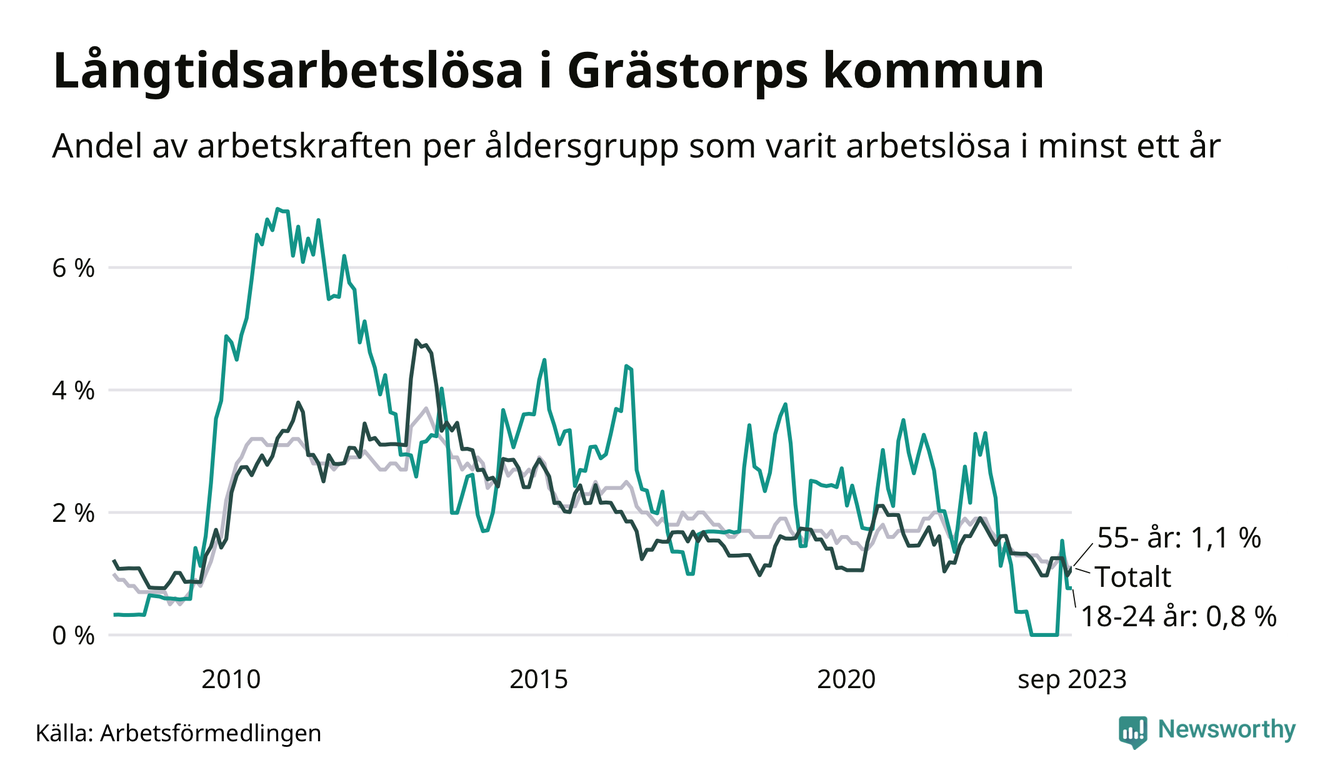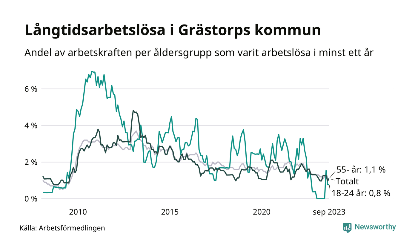 Av de 30 personerna som varit arbetslösa i mer än ett år i Grästorps kommun är åtta personer mellan 55 och 651 år och två är mellan 18 och 24 år. För den äldre gruppen är andelen arbetslösa 1,1 procent medan den i den yngre gruppen är 0,8 procent. Även i riket som helhet är långtidsarbetslösheten högre i gruppen äldre.