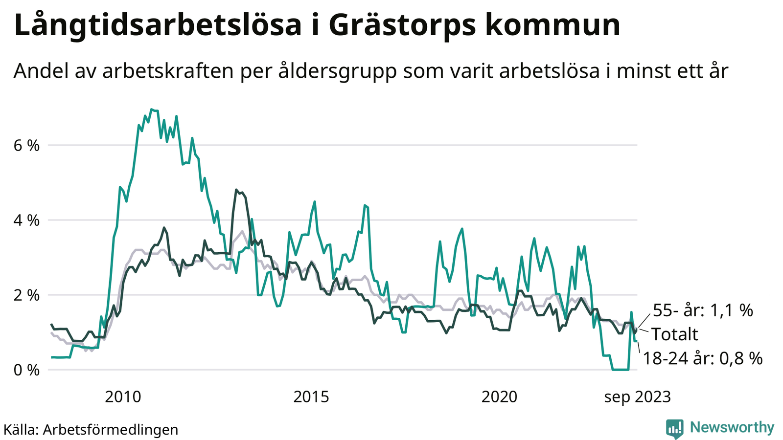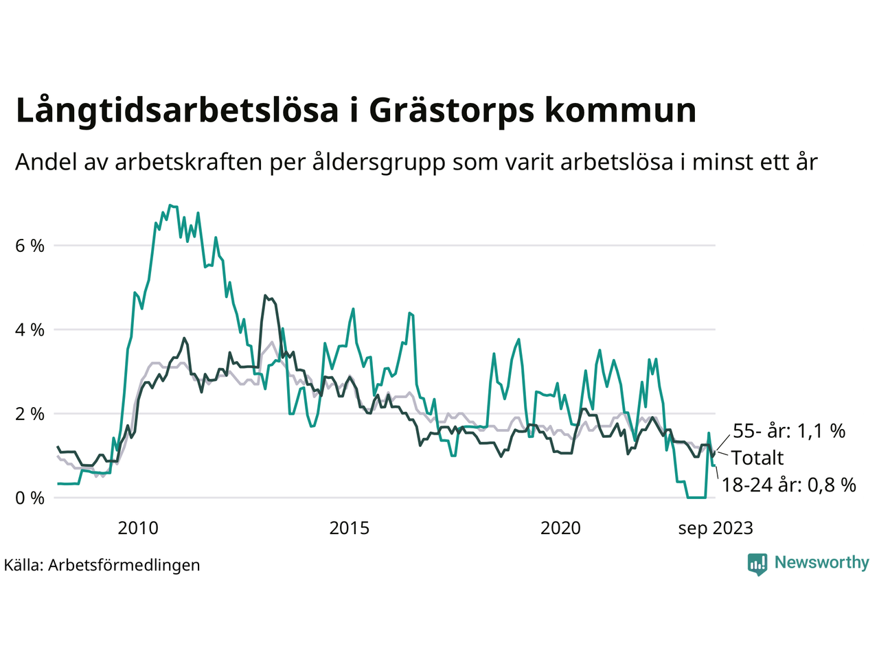 Graf: Andel arbetslösa uppdelat i åldersgrupper i Grästorp