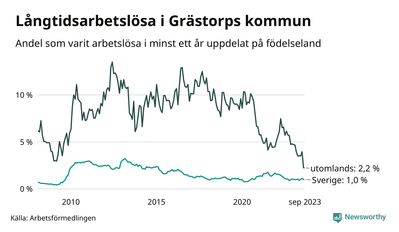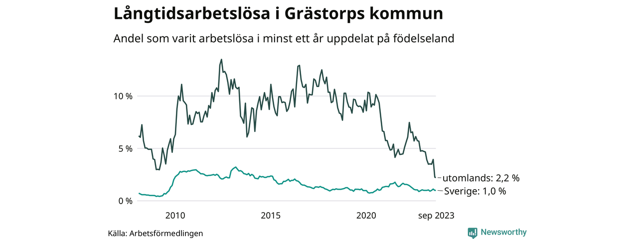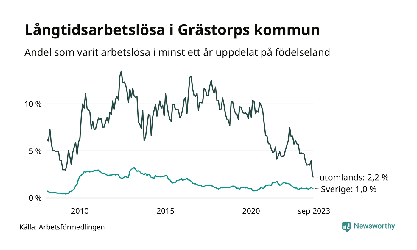 I september hade 30 Grästorpsbor varit arbetslösa i minst ett år, vilket är lika många som månaden innan. 30 personer motsvarar 1,1 procent av arbetskraften i kommunen – andelen långtidsarbetslösa är 0,3 procentenheter lägre än samma månad för ett år sedan. Grästorp tillhör de kommuner med lägst andel långtidsarbetslösa i hela landet just nu.