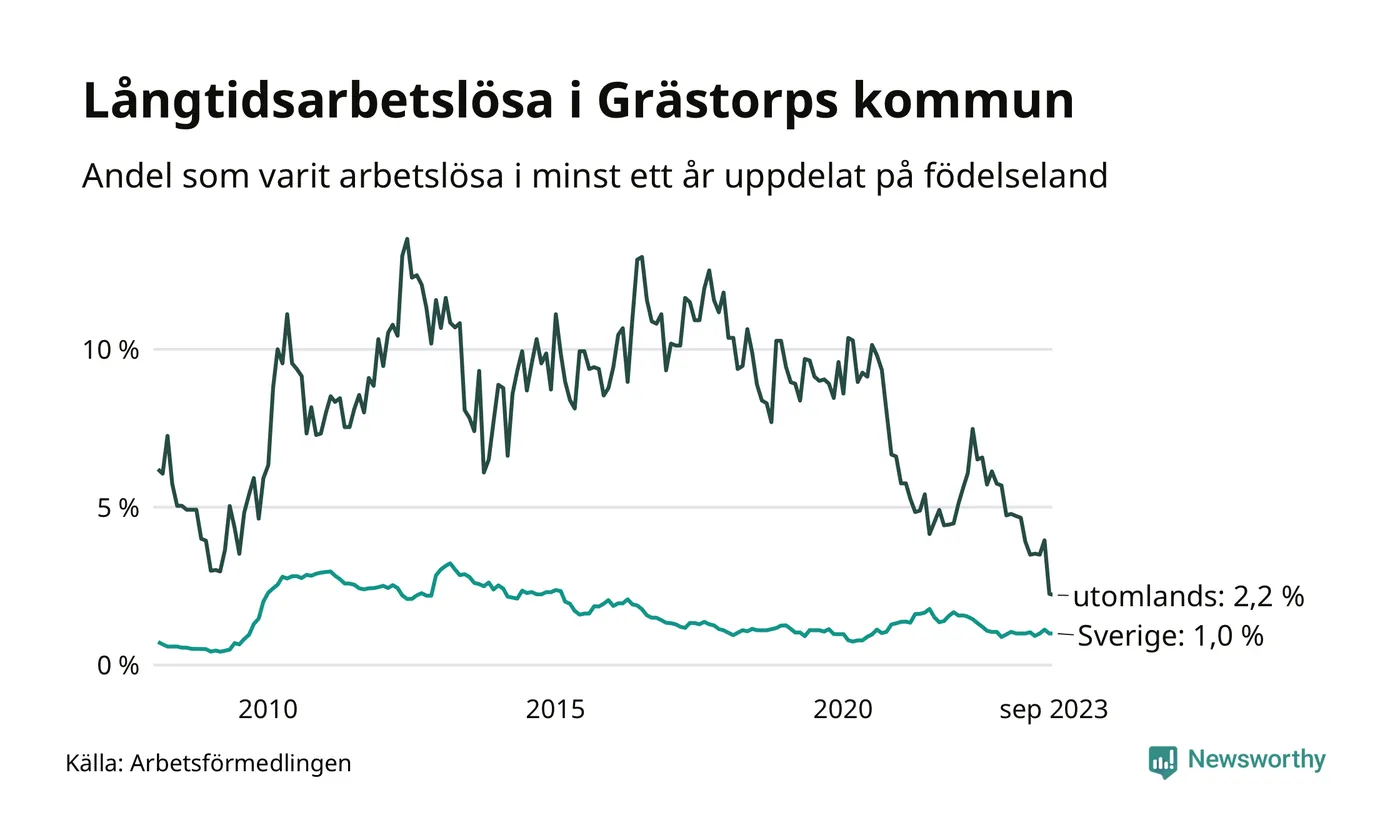 25 av de långtidsarbetslösa i Grästorp är födda i Sverige, medan fem är födda utomlands. Det innebär att långtidsarbetslösheten bland Sverigefödda är 1,0 procent, medan den är dubbelt så hög – 2,2 procent – bland födda utomlands. Även i riket som helhet är arbetslösheten högre bland utrikesfödda.