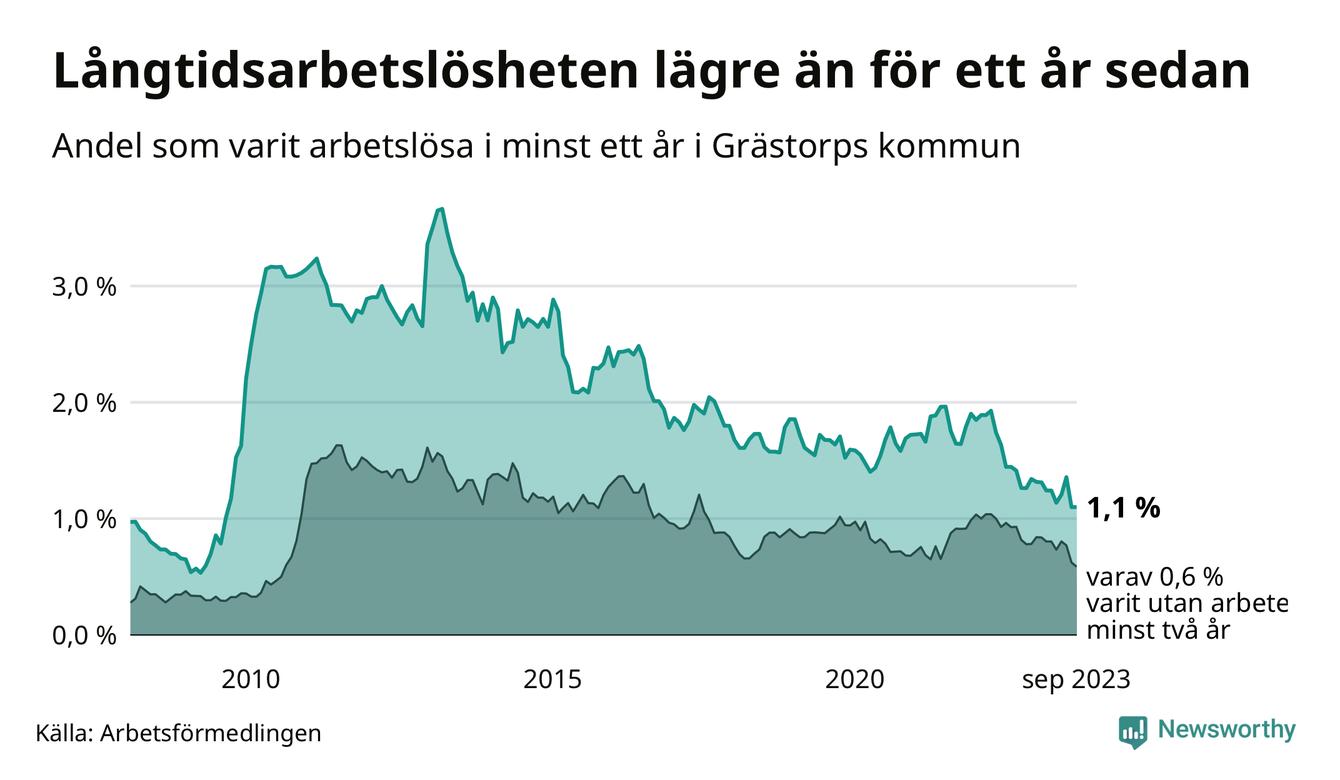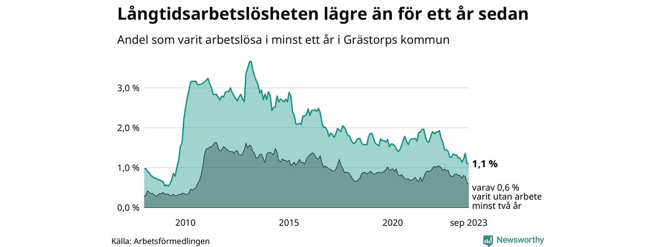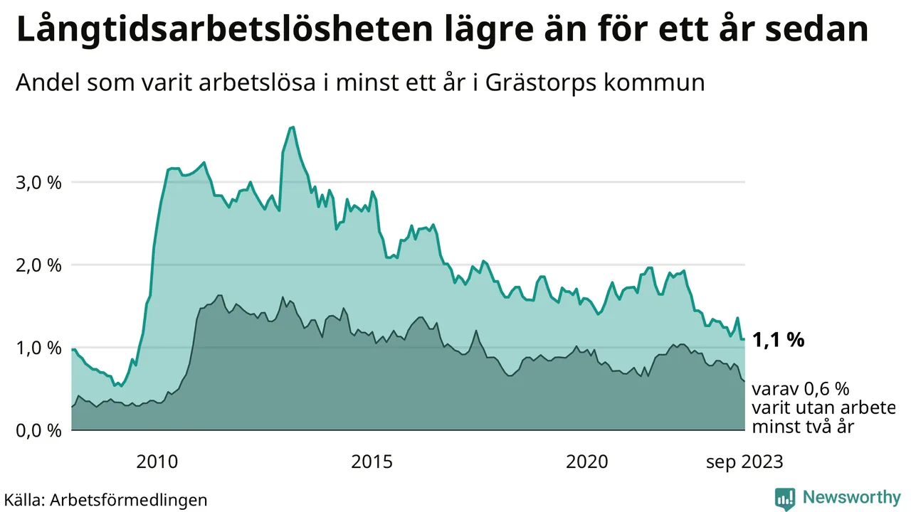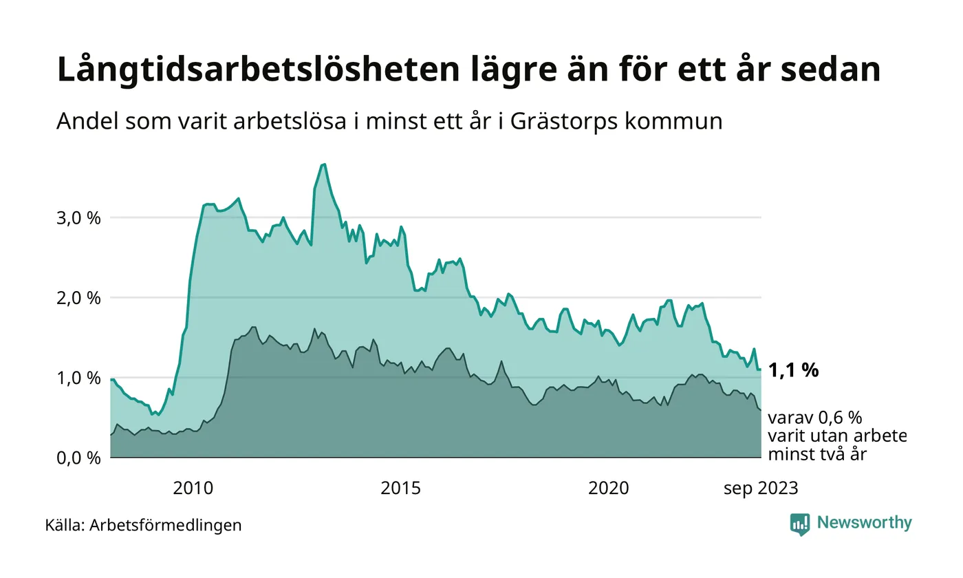 Andelen som varit utan arbete i minst ett år i Grästorp var lägre i september jämfört med samma månad för ett år sedan. Det visar Arbetsfömedlingens senaste månadsstatistik.