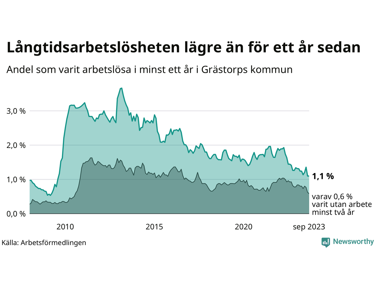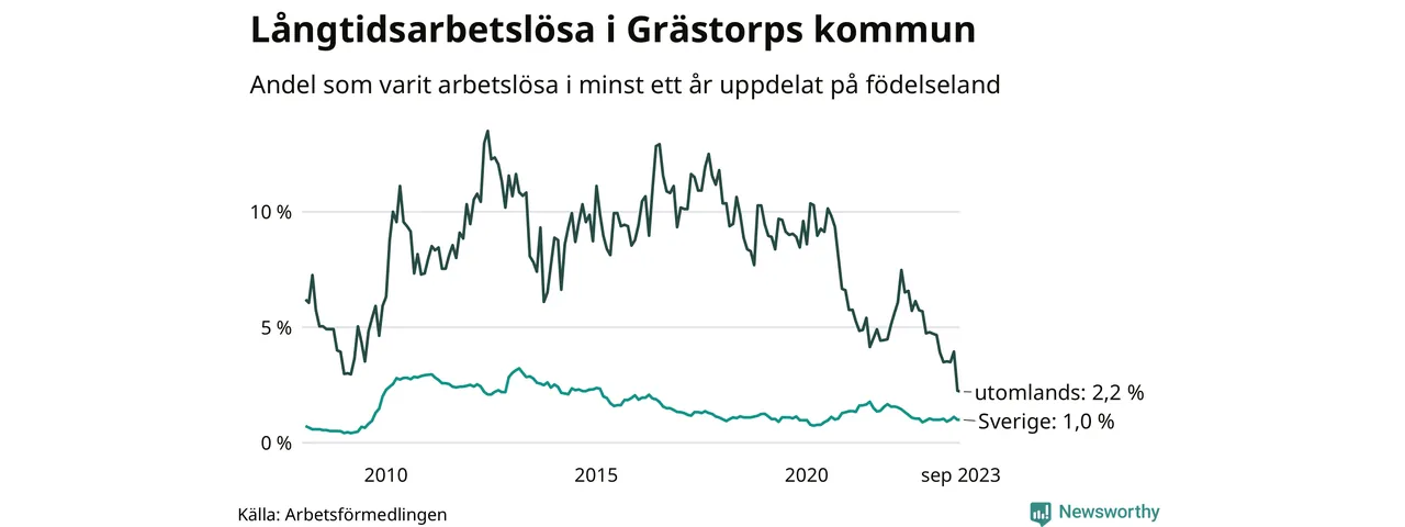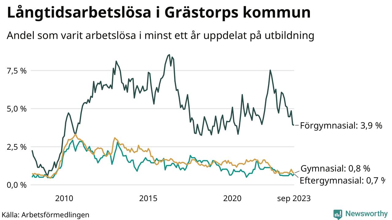 Andelen som varit utan arbete i minst ett år i Grästorp var lägre i september jämfört med samma månad för ett år sedan. Det visar Arbetsfömedlingens senaste månadsstatistik.