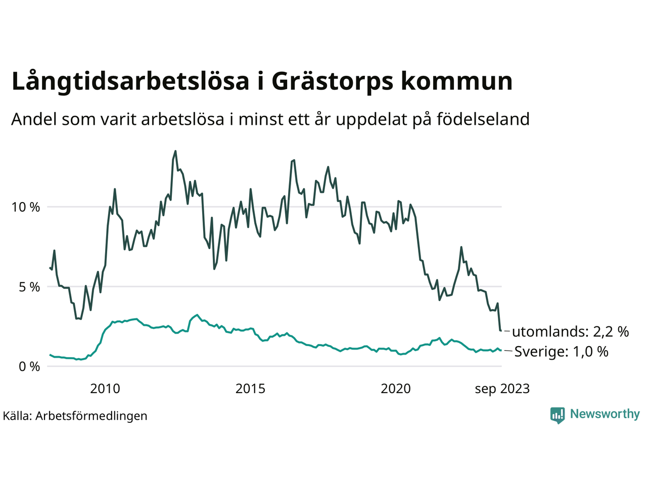Graf: Andel arbetslösa uppdelat på födelseland i Grästorp