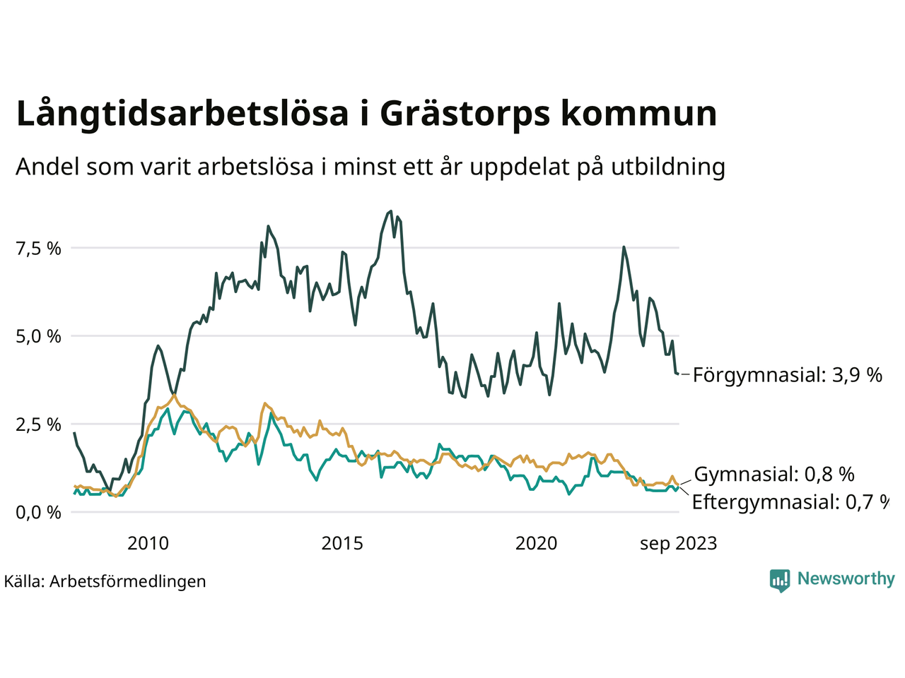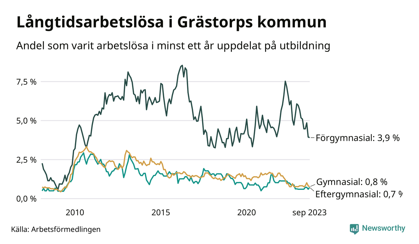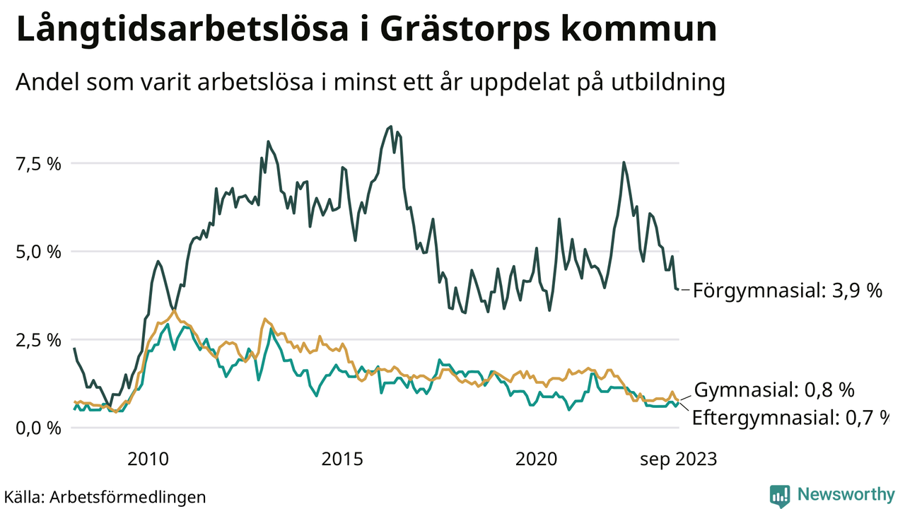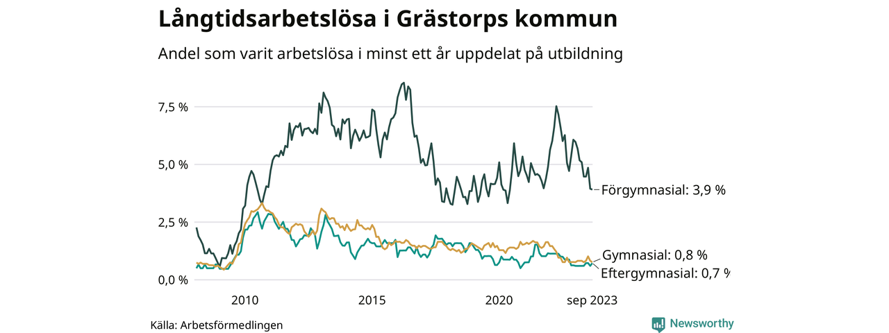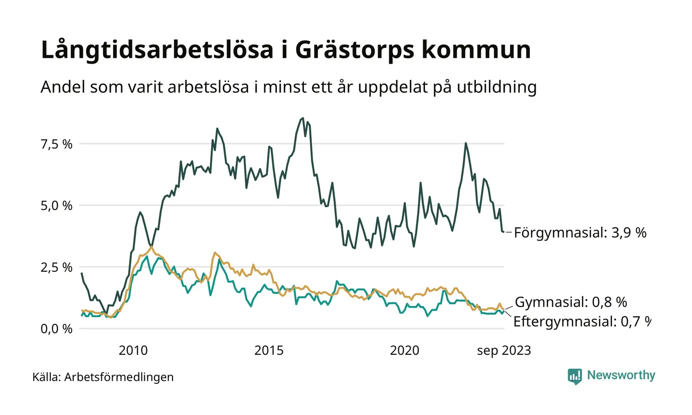 Graf över andel långtidsarbetslösa i Grästorp uppdelat på utbildningsnivå