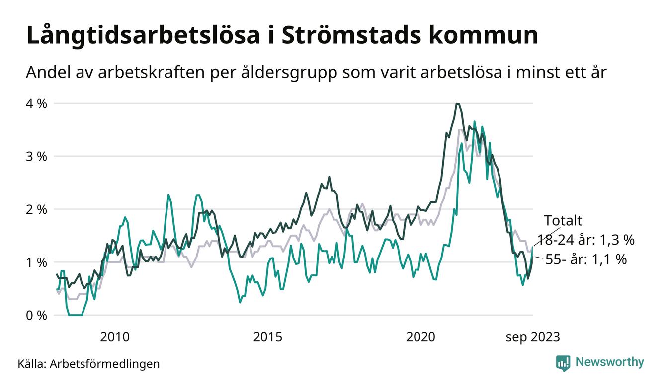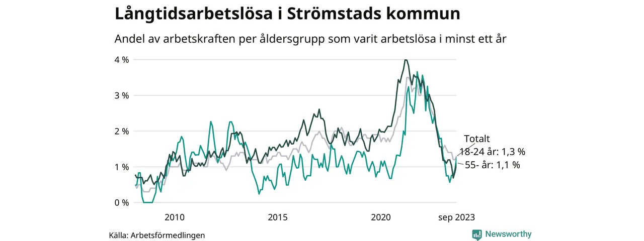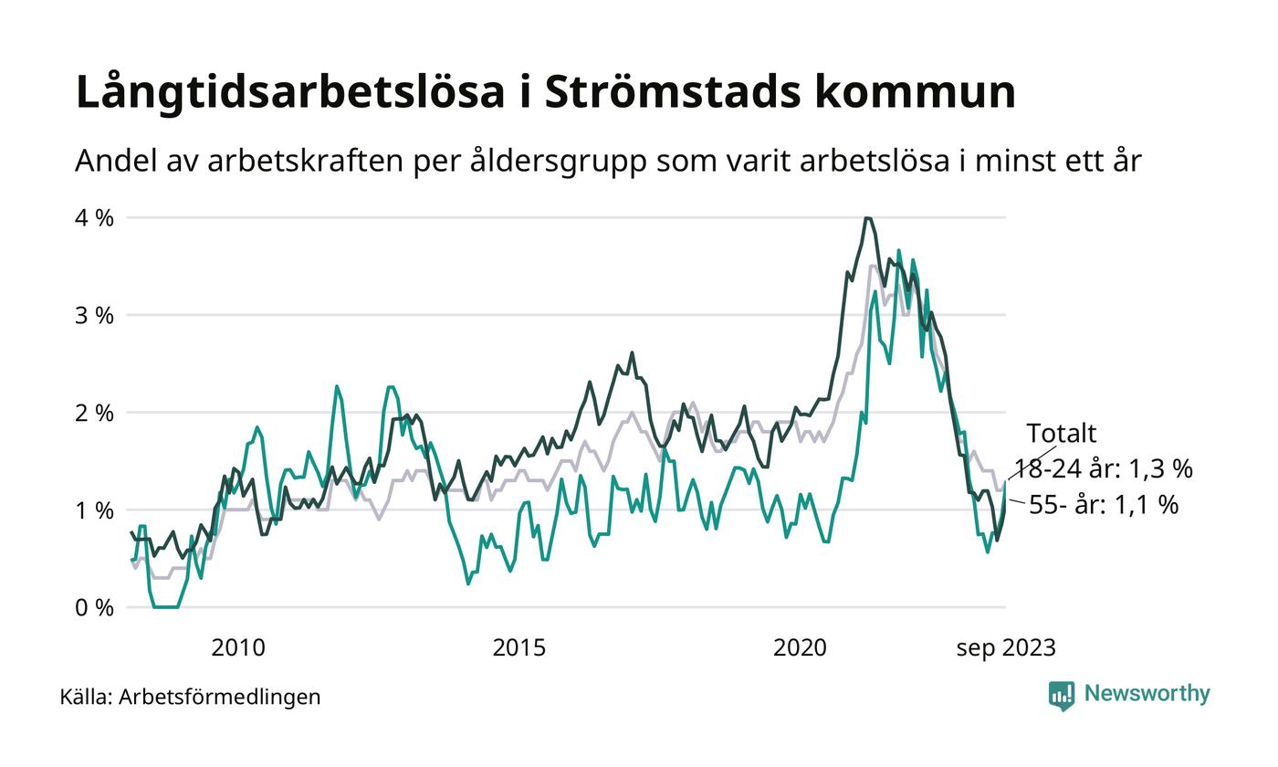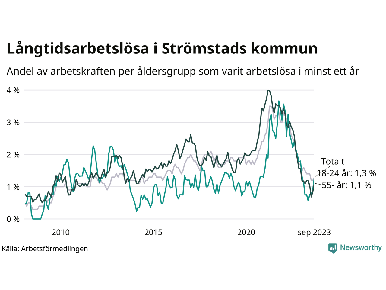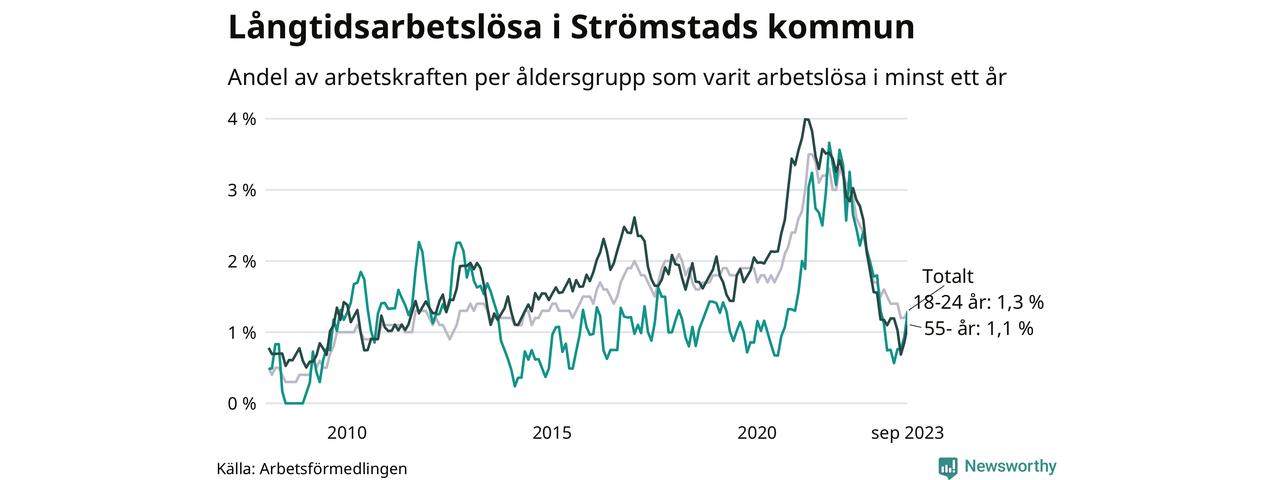 Av de 72 personerna som varit arbetslösa i mer än ett år i Strömstads kommun är 13 personer mellan 55 och 651 år och sju är mellan 18 och 24 år. För den yngre gruppen är andelen arbetslösa 1,3 procent medan den bland yngre gruppen är 1,1. I riket som helhet är andelen långtidsarbetslösa högre i den äldre gruppen.