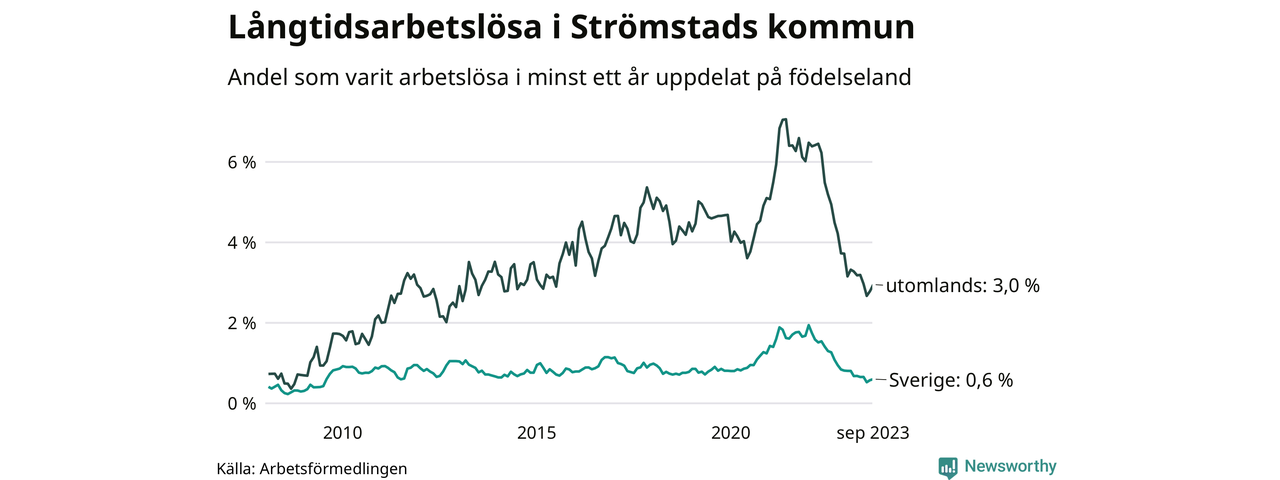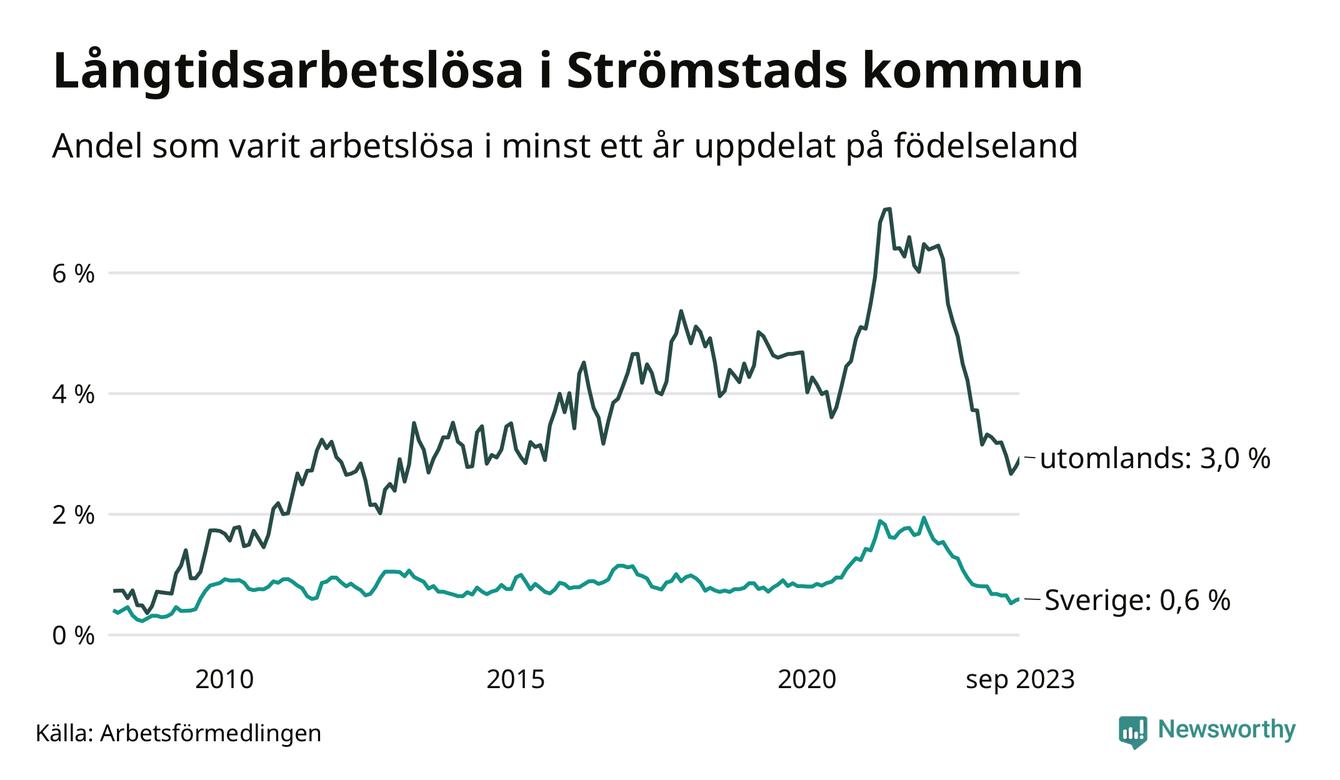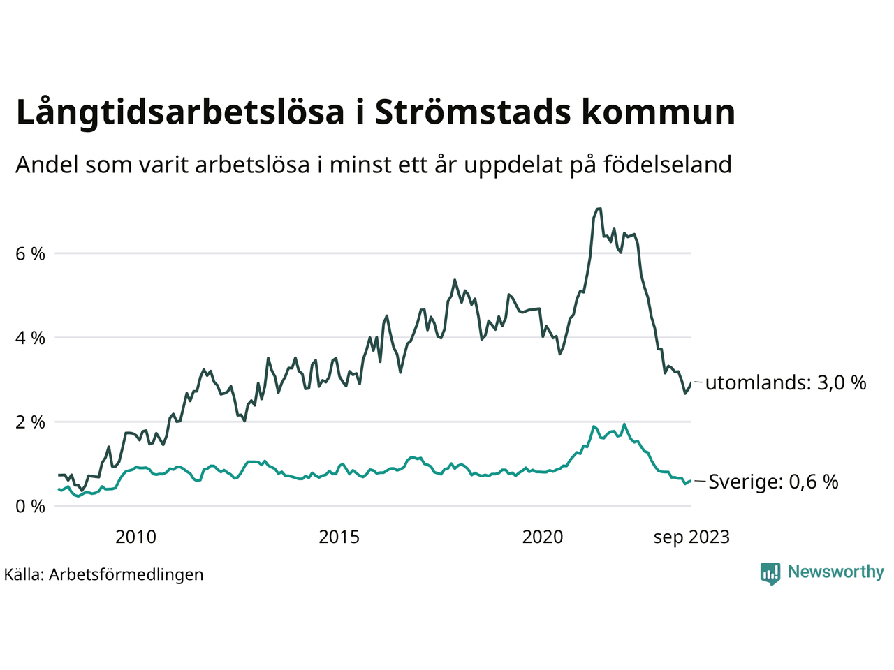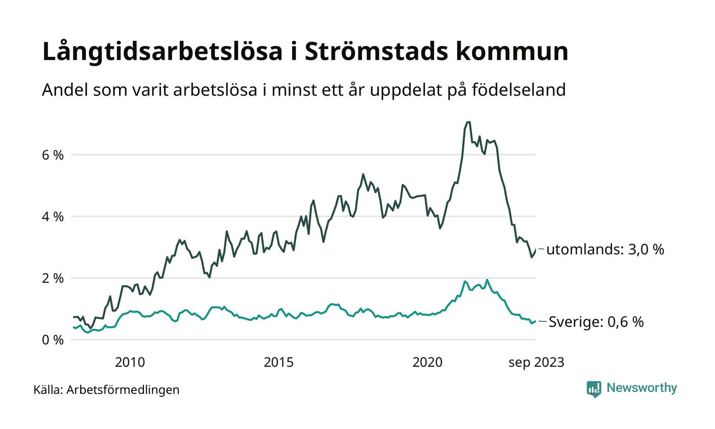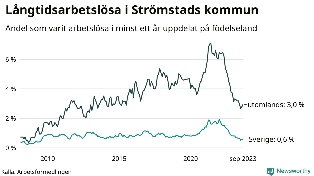 23 av de långtidsarbetslösa i Strömstad är födda i Sverige, medan 49 är födda utomlands. Det innebär att långtidsarbetslösheten bland Sverigefödda är 0,6 procent, medan den är fem gånger så hög – 3,0 procent – bland födda utomlands. Även i riket som helhet är arbetslösheten högre bland utrikesfödda.