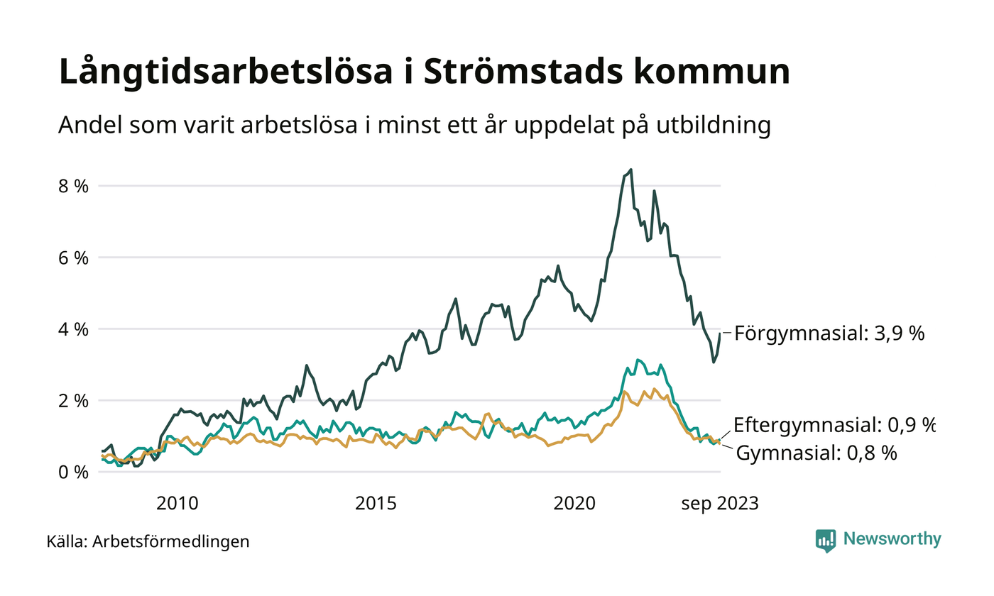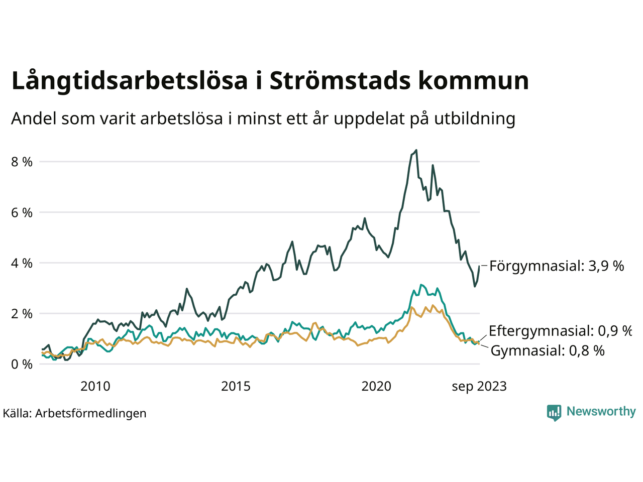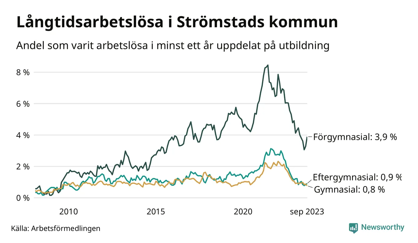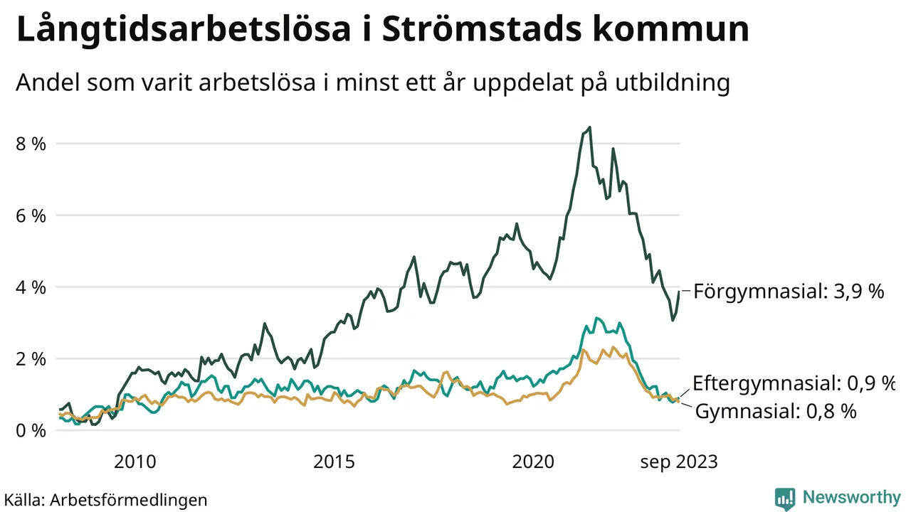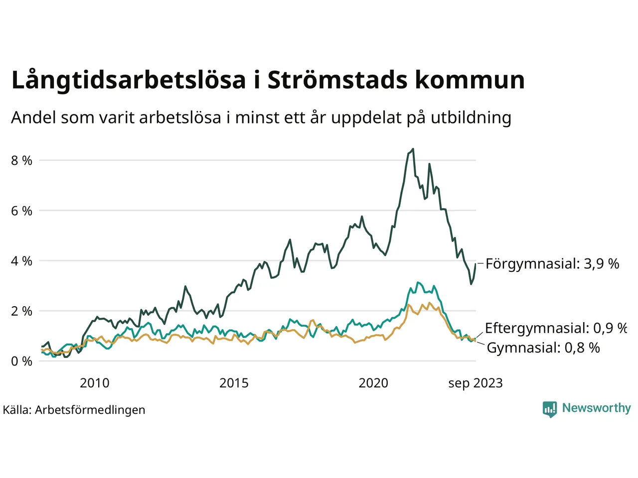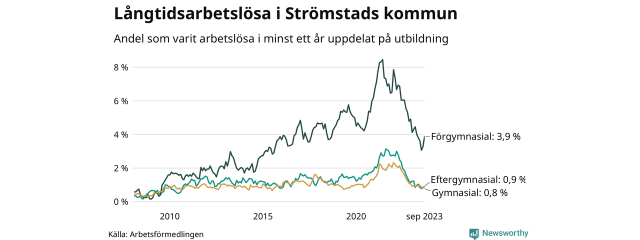 Graf över andel långtidsarbetslösa i Strömstad uppdelat på utbildningsnivå