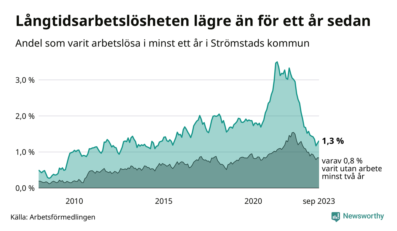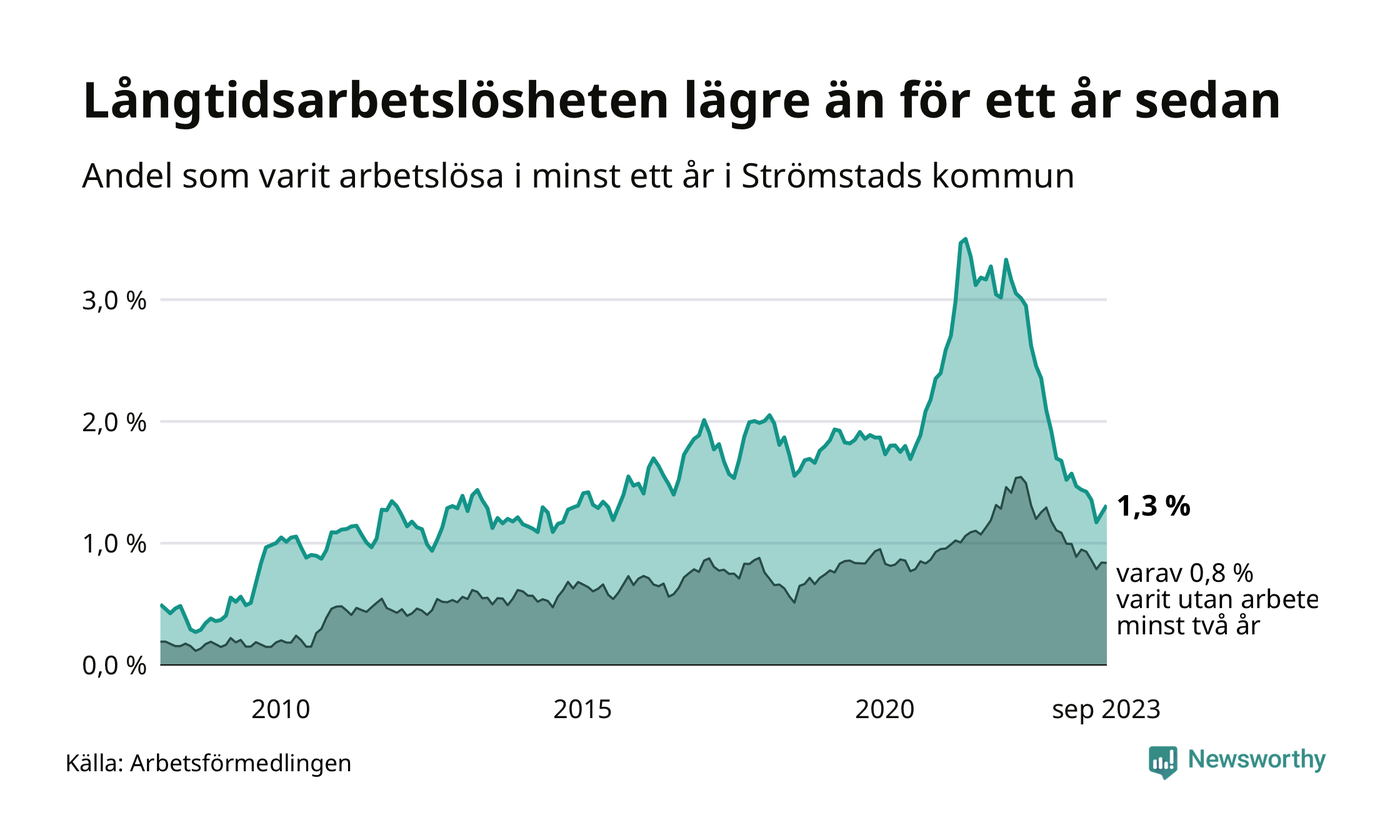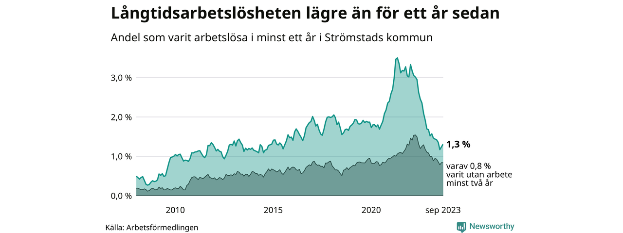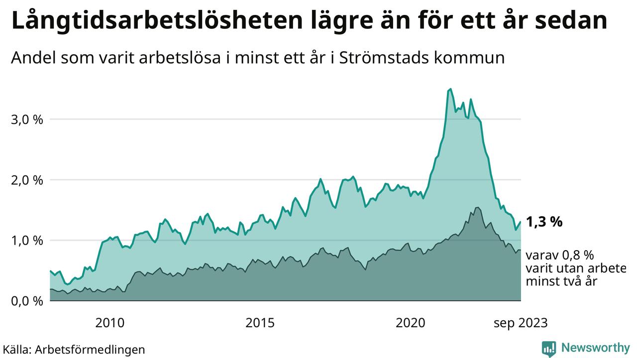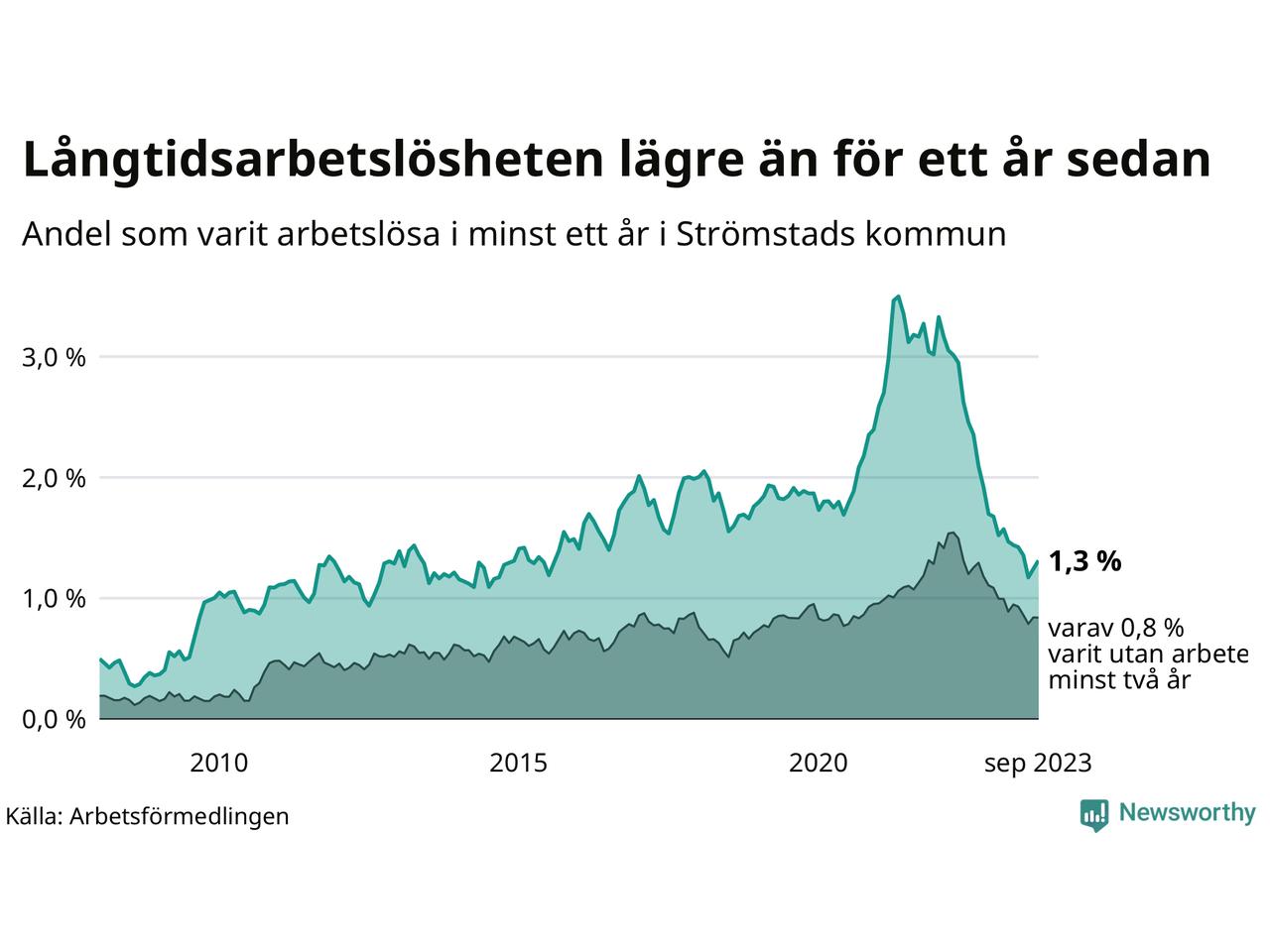 I september hade 72 Strömstadsbor varit arbetslösa i minst ett år, vilket är fyra fler än månaden innan. 72 personer motsvarar 1,3 procent av arbetskraften i kommunen – andelen långtidsarbetslösa är 0,8 procentenheter lägre än samma månad för ett år sedan.