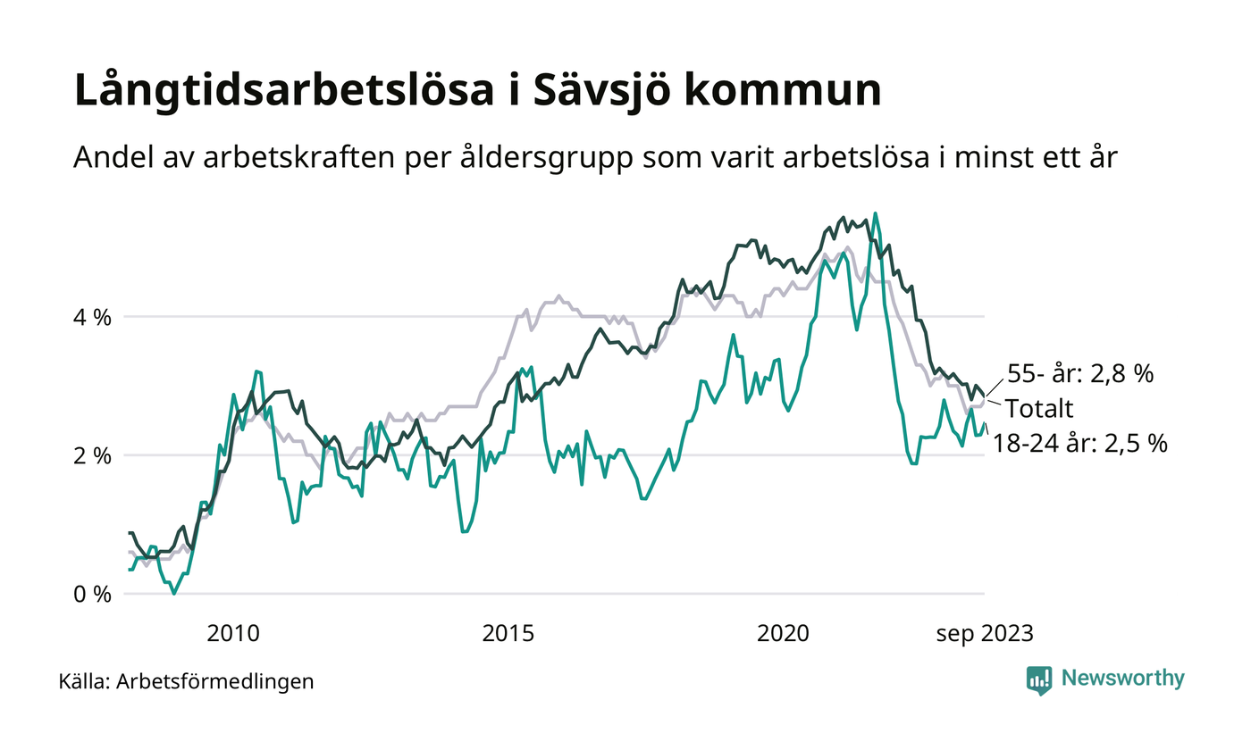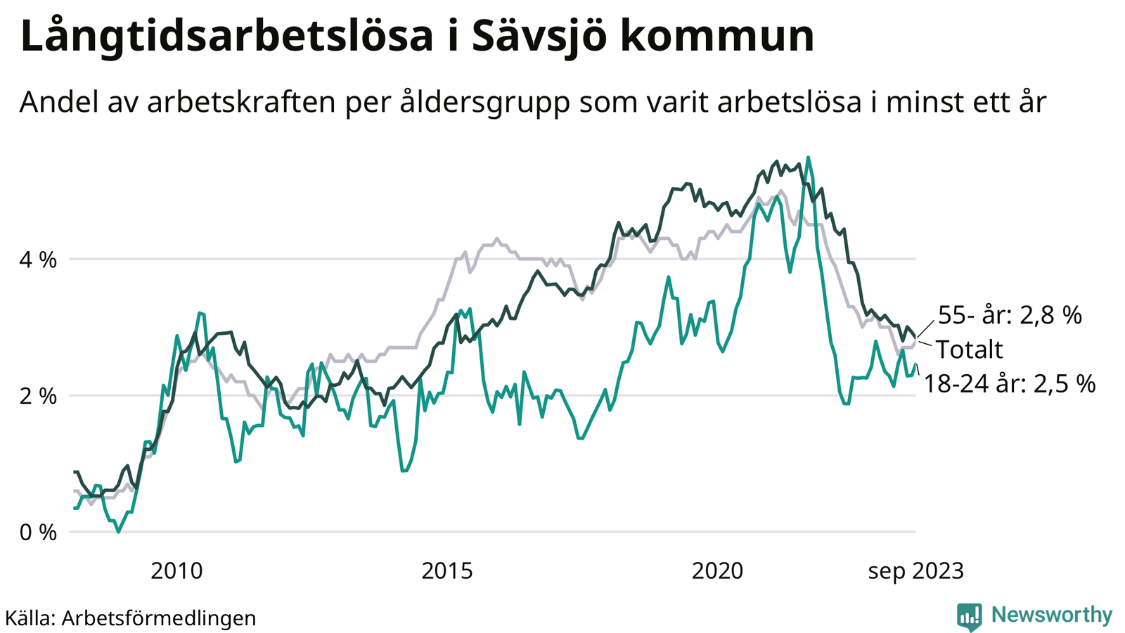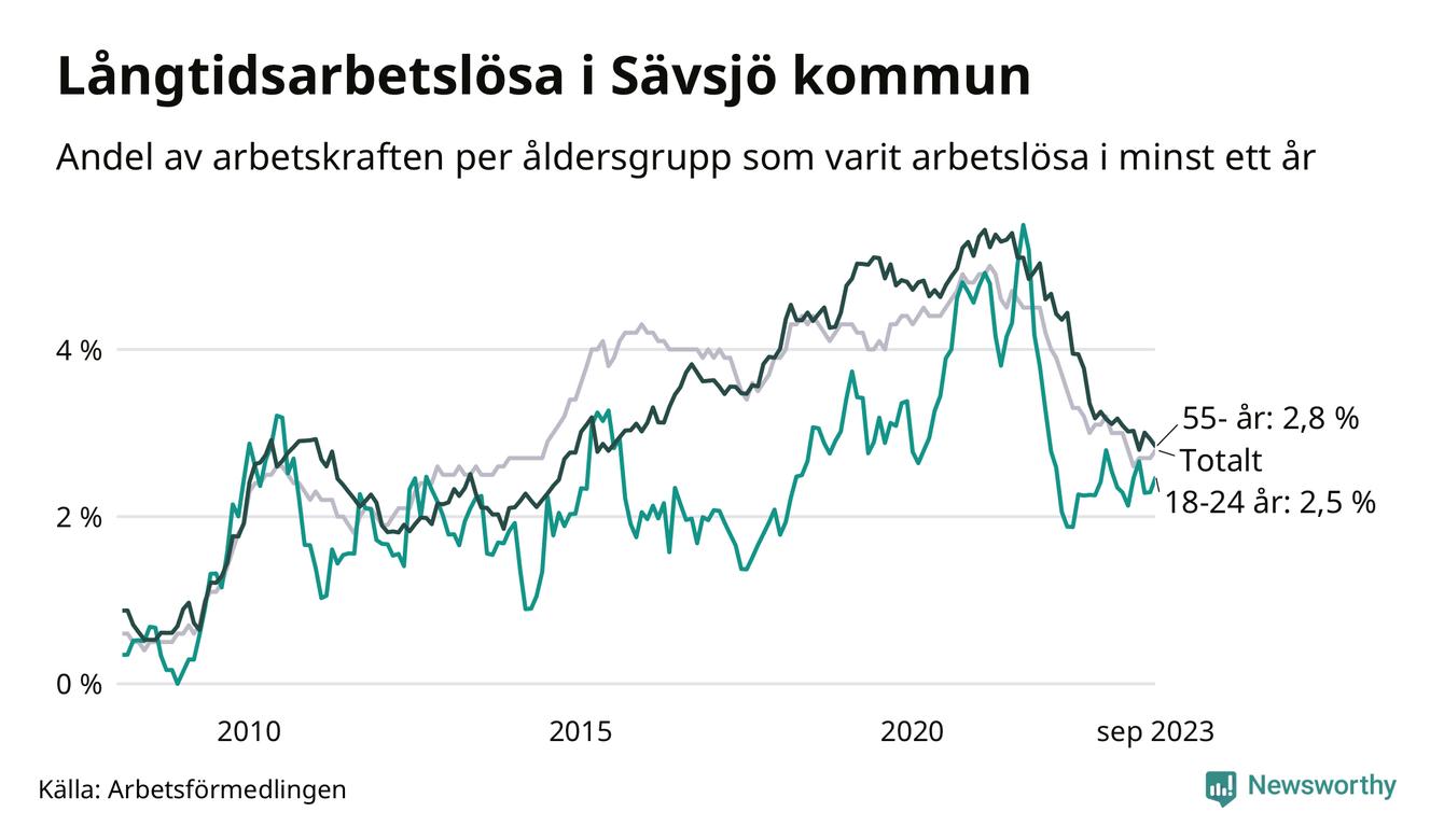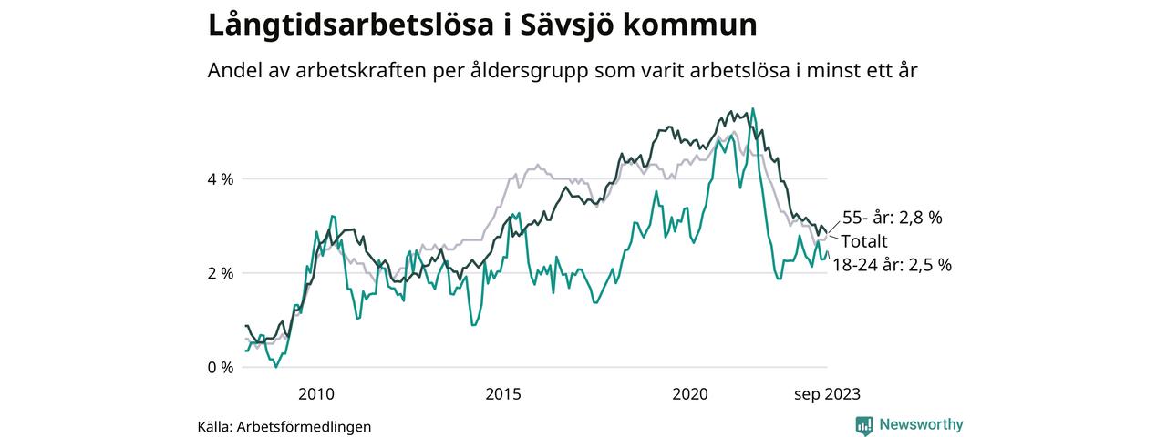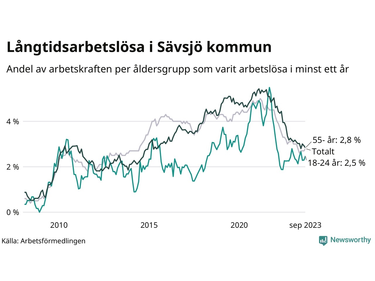 Av de 152 personerna som varit arbetslösa i mer än ett år i Sävsjö kommun är 37 personer mellan 55 och 651 år och 14 är mellan 18 och 24 år. För den äldre gruppen är andelen arbetslösa 2,8 procent medan den i den yngre gruppen är 2,5 procent. Även i riket som helhet är långtidsarbetslösheten högre i gruppen äldre.