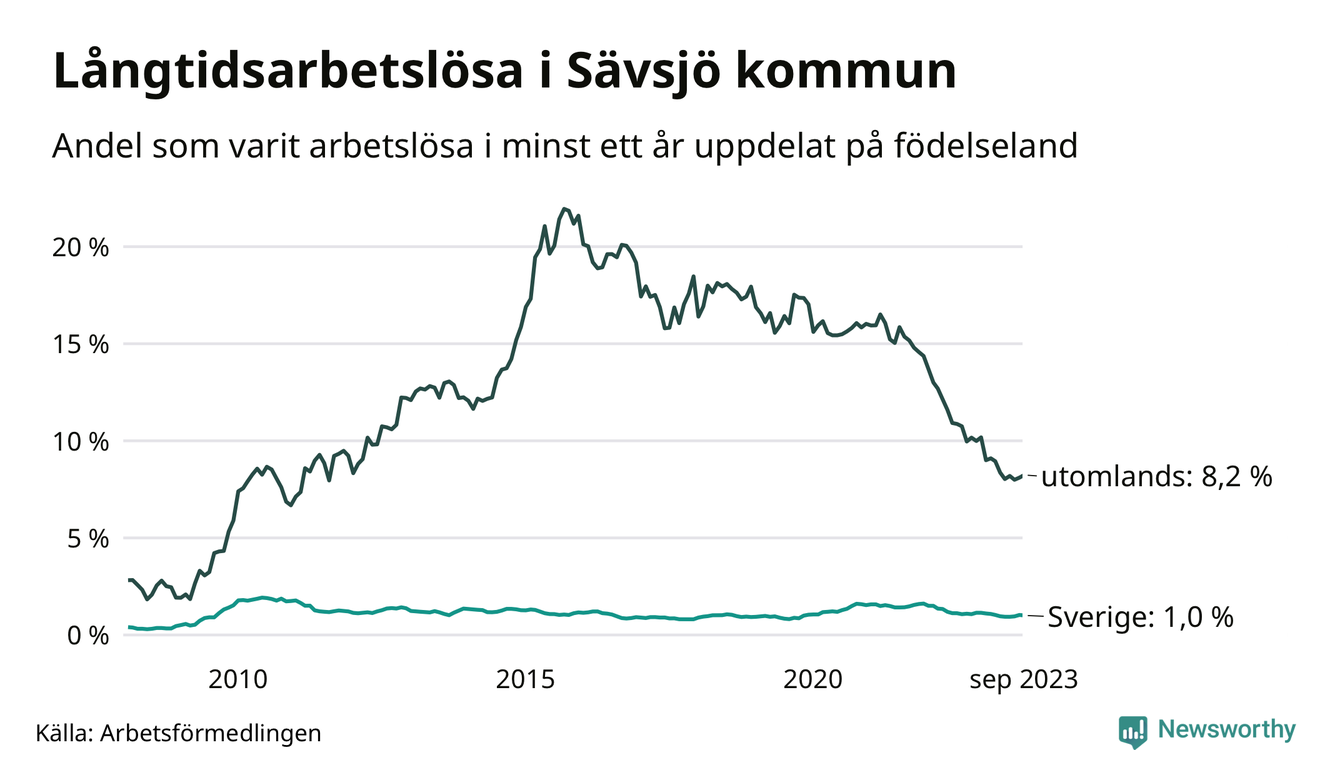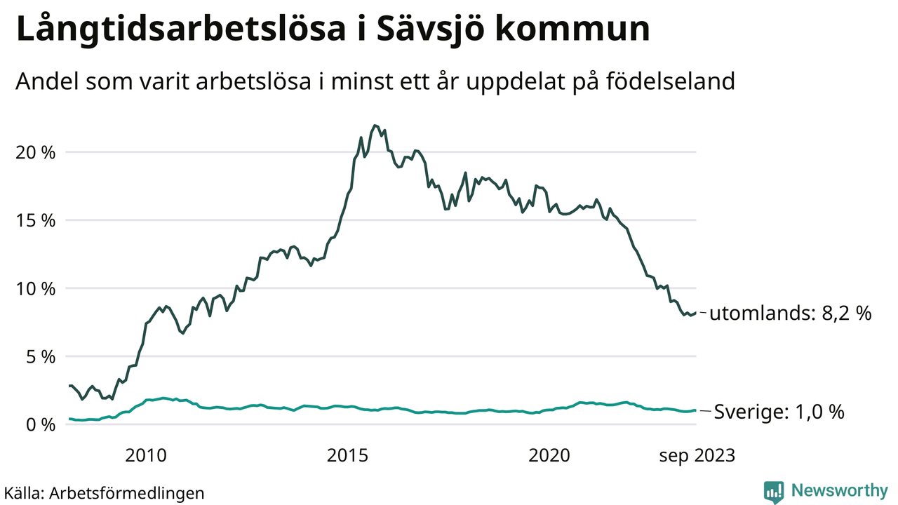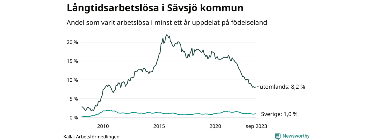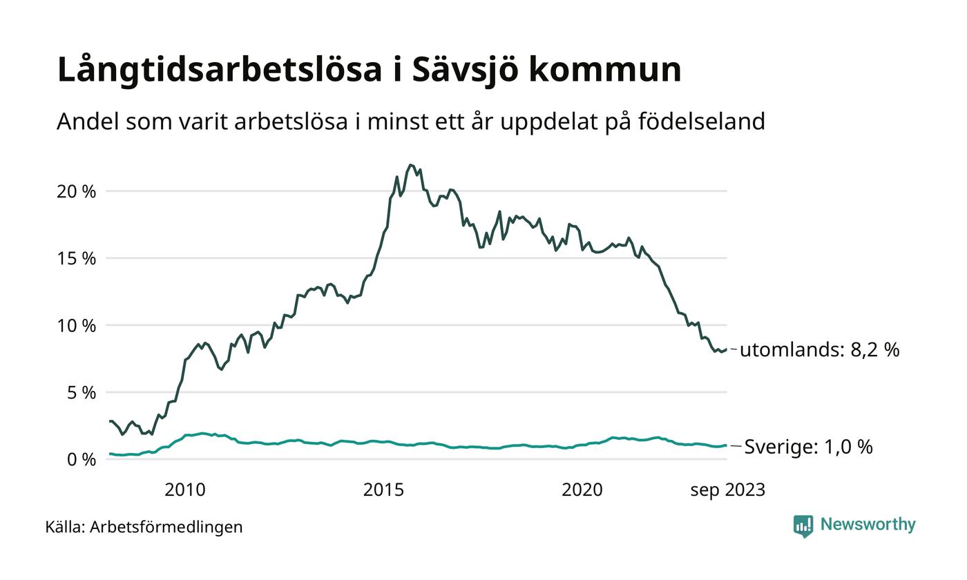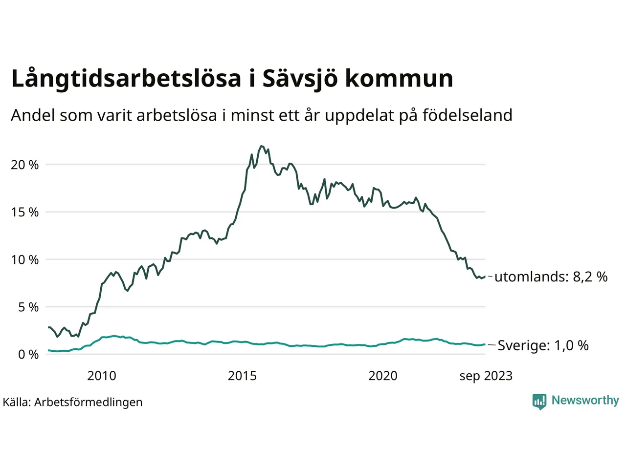 42 av de långtidsarbetslösa i Sävsjö är födda i Sverige, medan 110 är födda utomlands. Det innebär att långtidsarbetslösheten bland Sverigefödda är 1,0 procent, medan den är åtta gånger så hög – 8,2 procent – bland födda utomlands. Även i riket som helhet är arbetslösheten högre bland utrikesfödda.