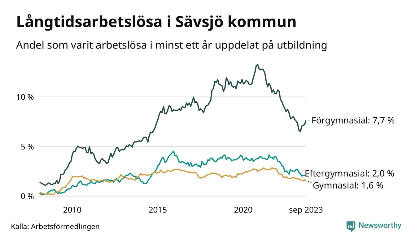 Graf: Andel arbetslösa i Sävsjö som varit utan arbete i minst 12 månader