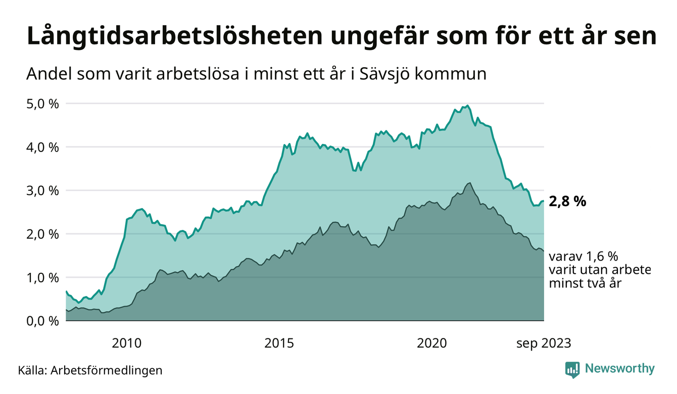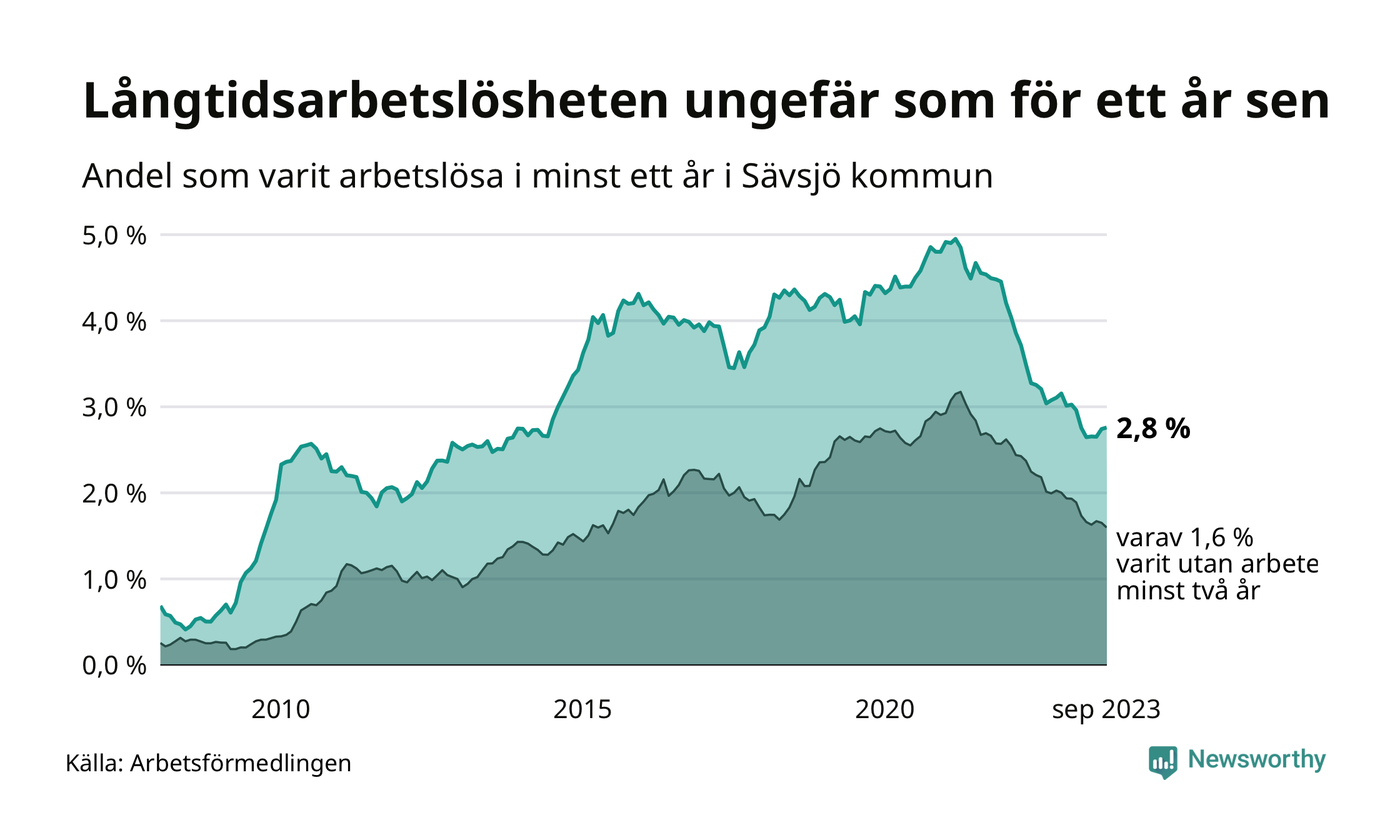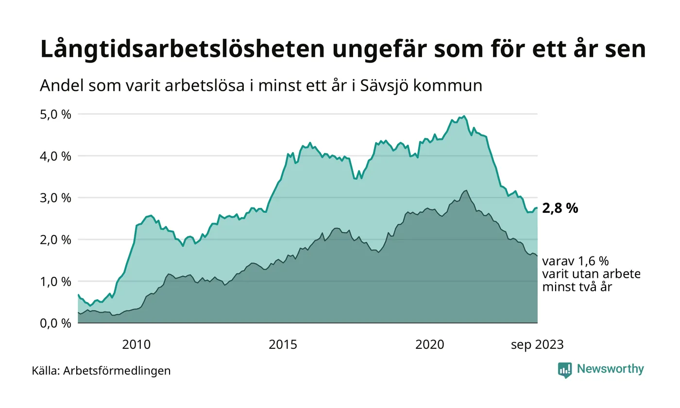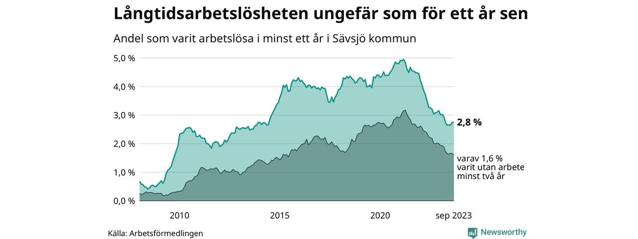 I september hade 152 Sävsjöbor varit arbetslösa i minst ett år, vilket är en fler än månaden innan. 152 personer motsvarar 2,8 procent av arbetskraften i kommunen – andelen långtidsarbetslösa är ungefär på samma nivå som för ett år sedan.