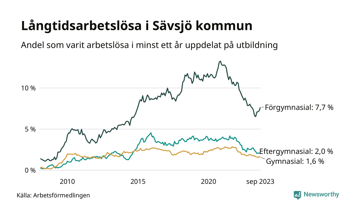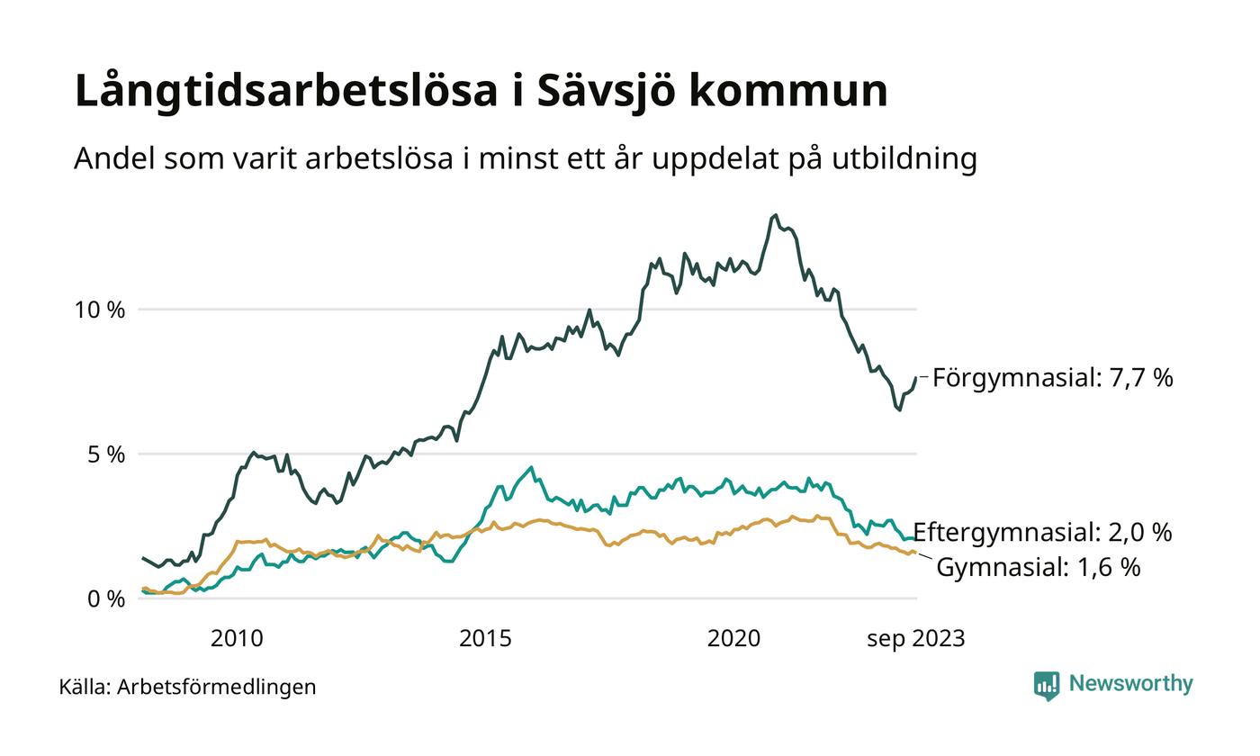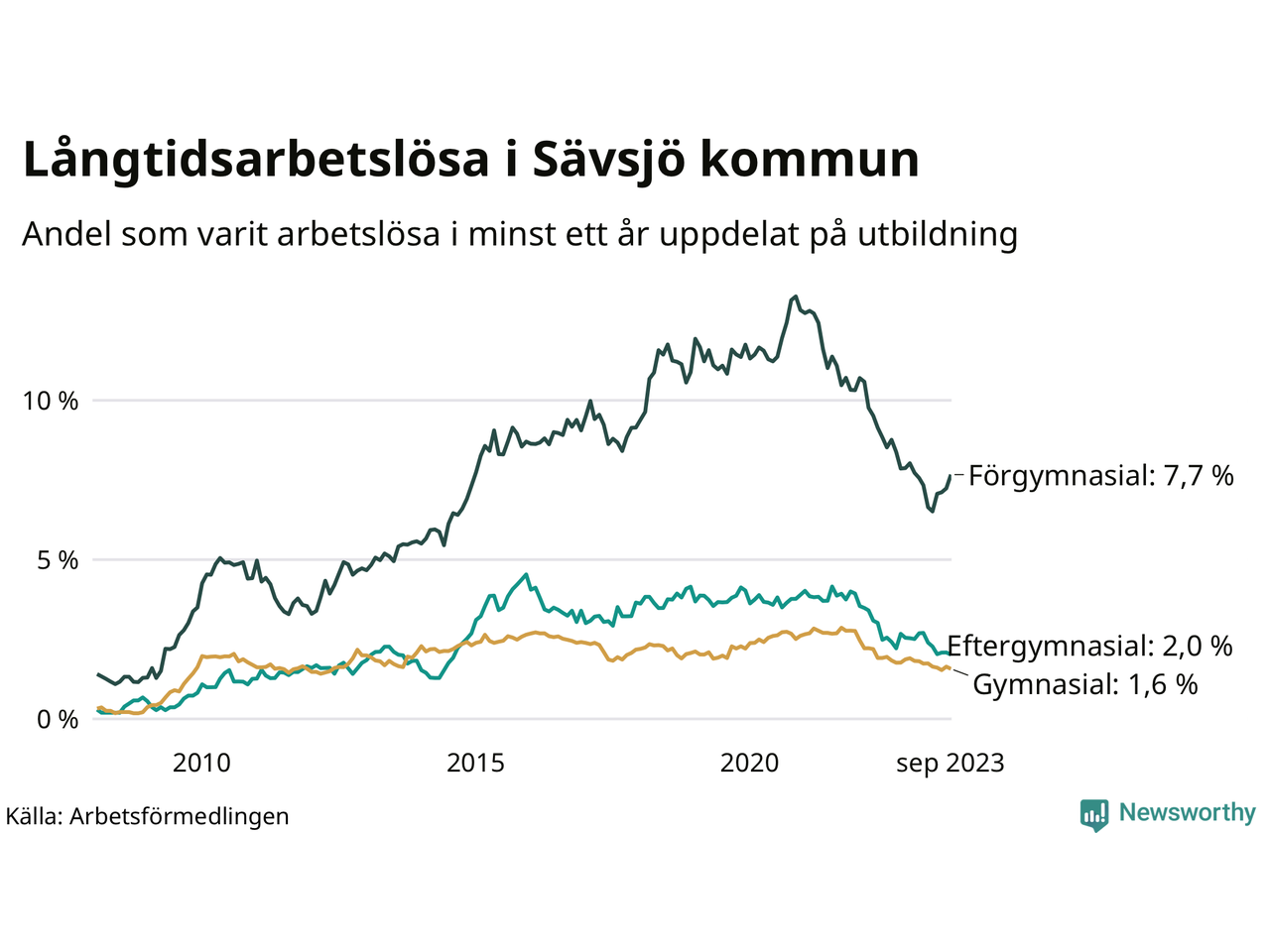 I september hade 152 Sävsjöbor varit arbetslösa i minst ett år, vilket är en fler än månaden innan. 152 personer motsvarar 2,8 procent av arbetskraften i kommunen – andelen långtidsarbetslösa är ungefär på samma nivå som för ett år sedan.
