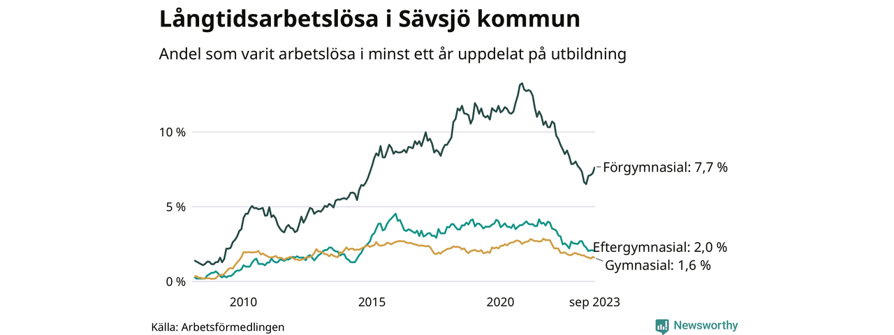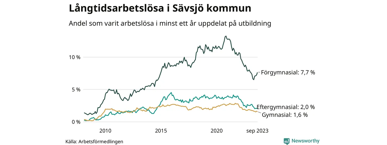 Graf över andel långtidsarbetslösa i Sävsjö uppdelat på utbildningsnivå