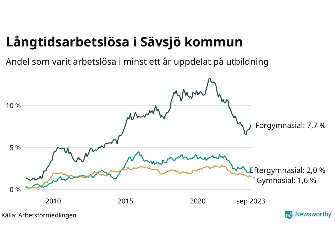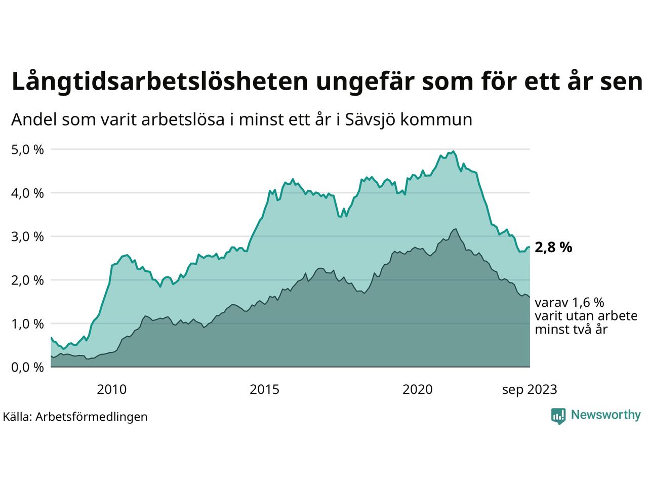 Andelen långtidsarbetslösa i Sävsjö är den näst högsta i Jönköpings län, bara i Nässjö är andelen högre 3,1 procent.I Gnosjö och Habo finns länets lägsta långtidsarbetslöshet, 1,1 procent. I Jönköpings län som helhet hade 3 581 personer (1,9 procent) varit arbetslösa i minst ett år i september. Det är 94 personer fler än månaden innan.
