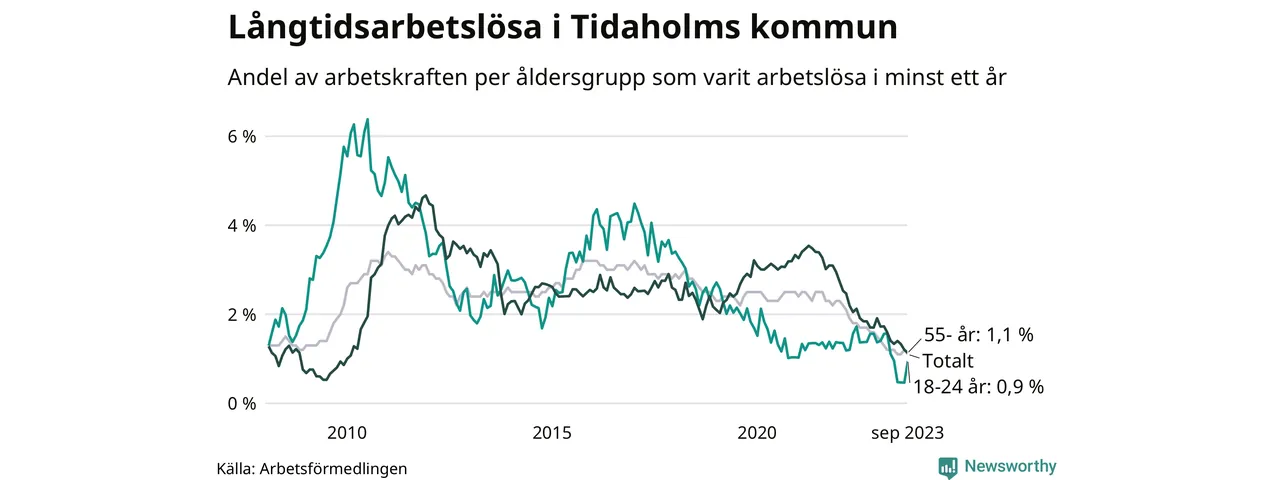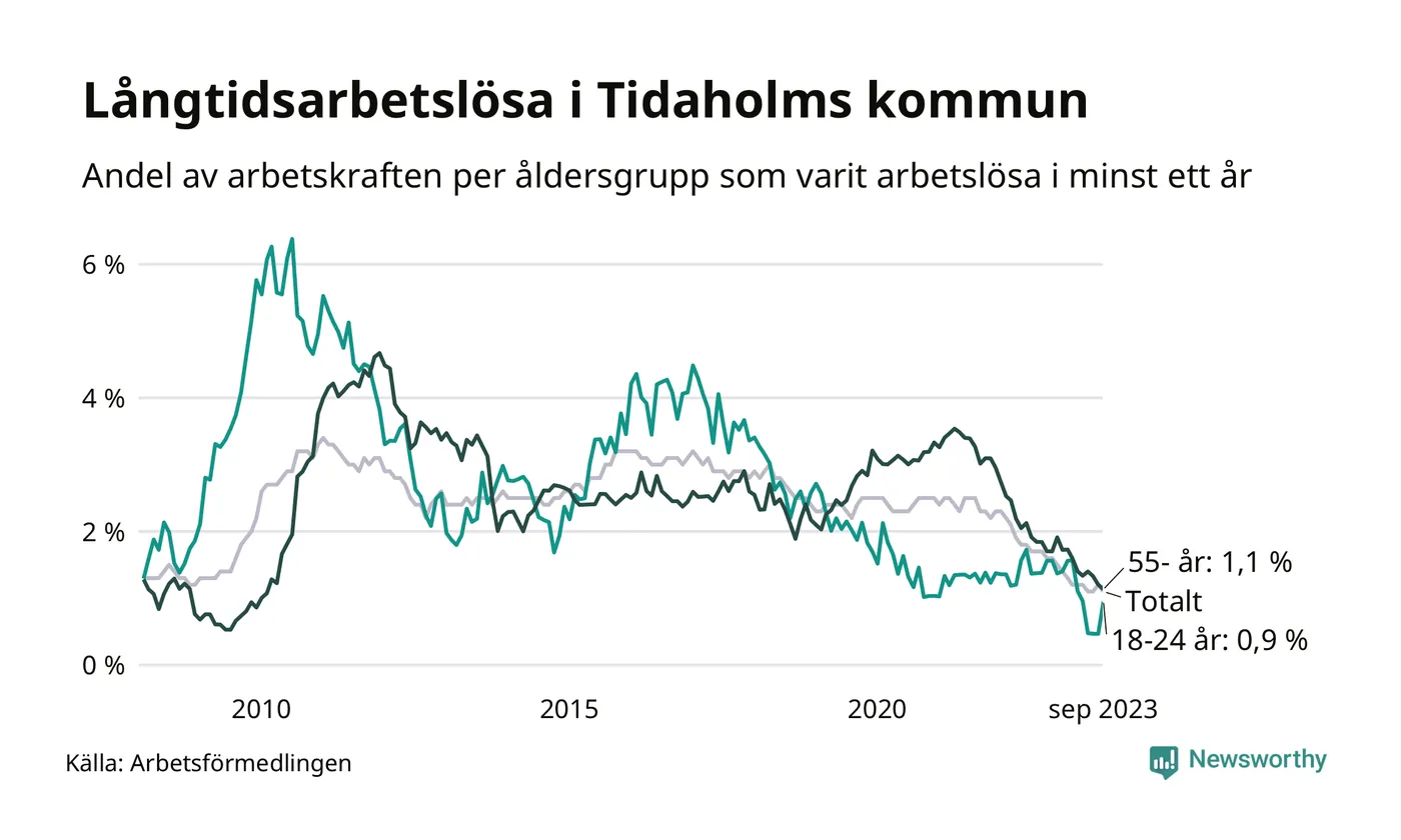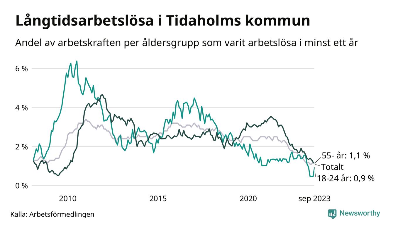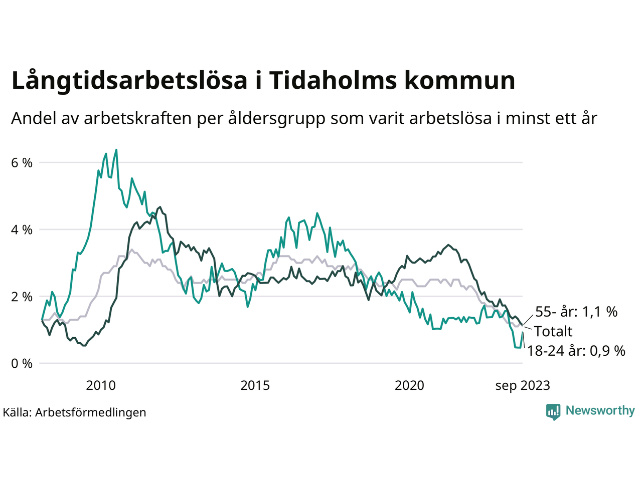 Av de 68 personerna som varit arbetslösa i mer än ett år i Tidaholms kommun är 17 personer mellan 55 och 651 år och sex är mellan 18 och 24 år. För den äldre gruppen är andelen arbetslösa 1,1 procent medan den i den yngre gruppen är 0,9 procent. Även i riket som helhet är långtidsarbetslösheten högre i gruppen äldre.