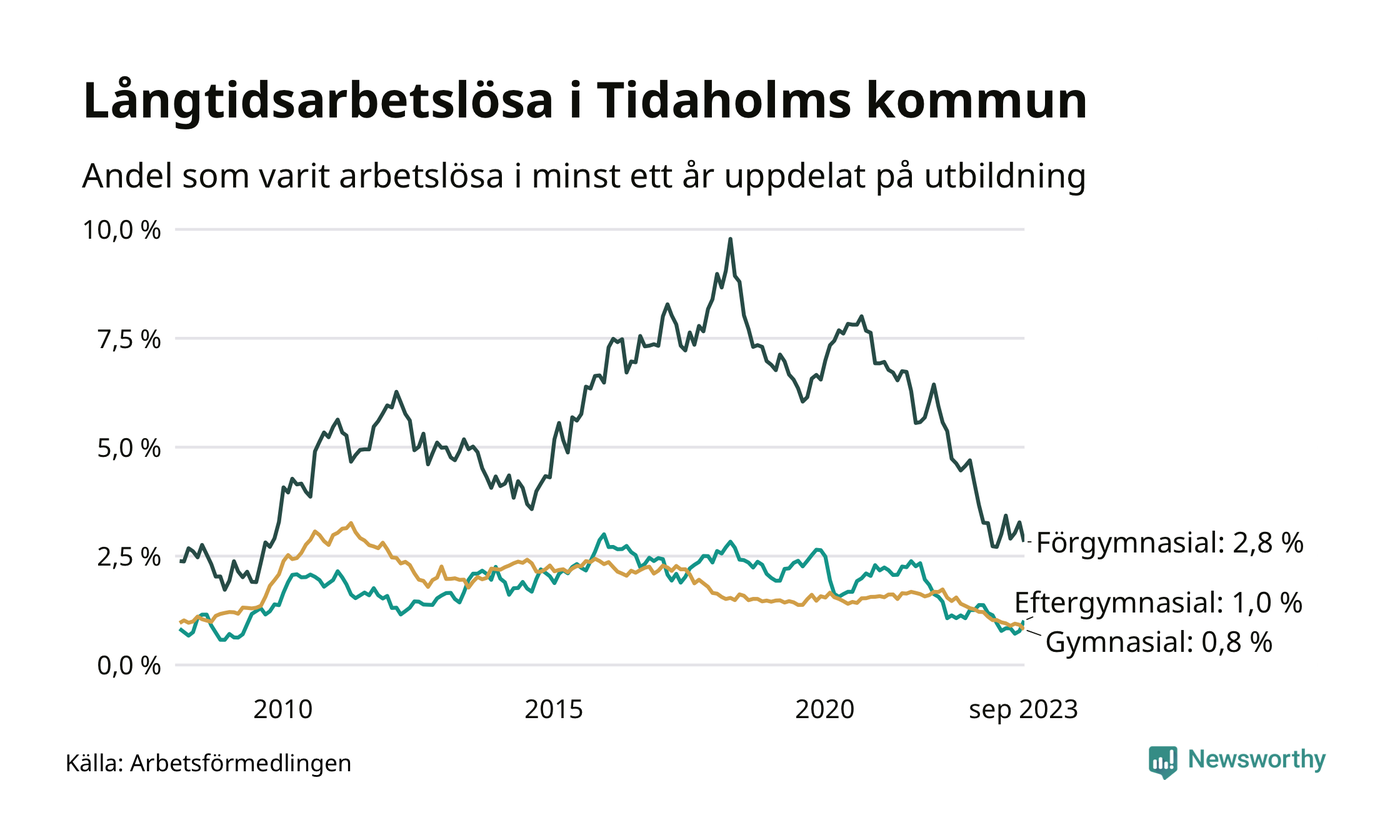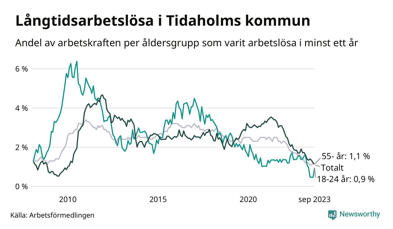 | Andel arbetslösa i minst två år | 0,6 % | 1,3 % | 1,6 % |