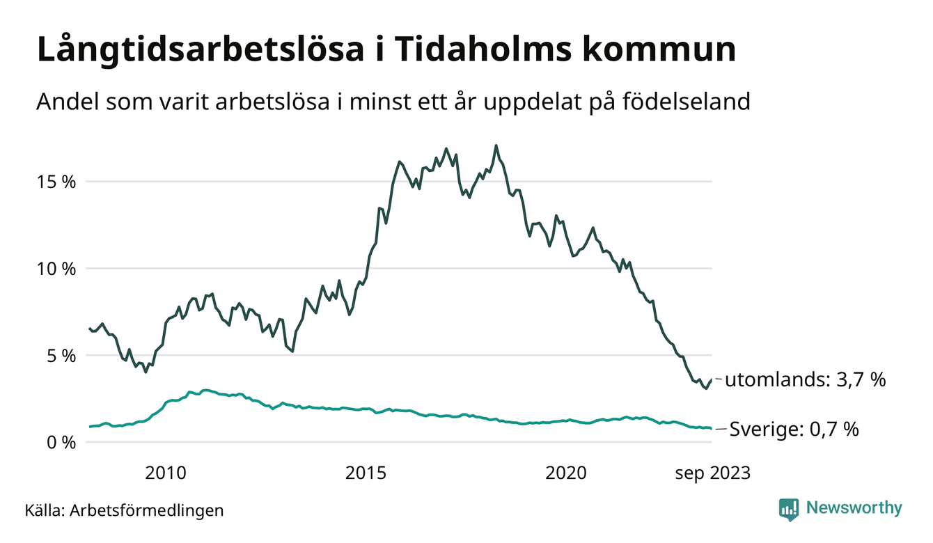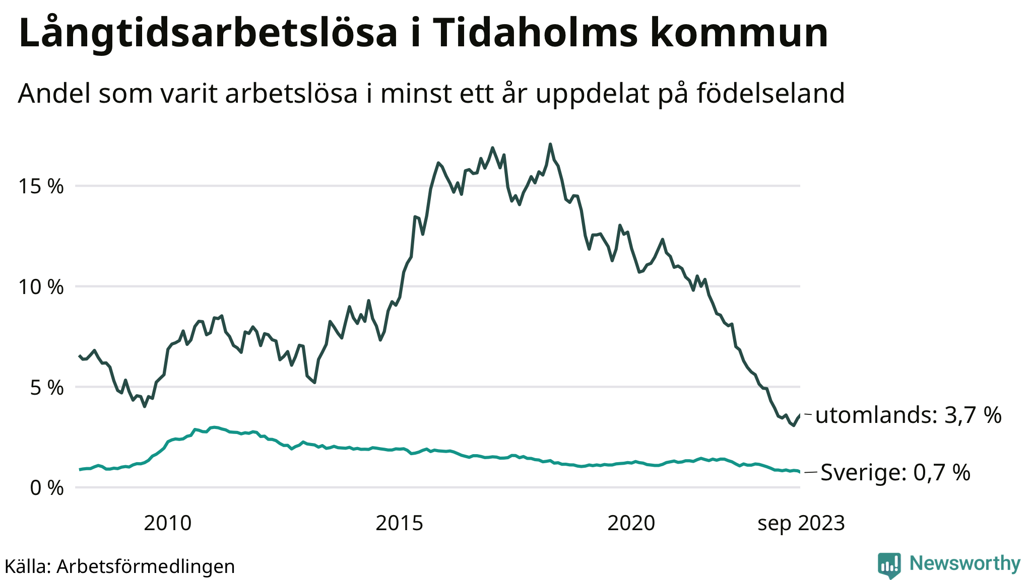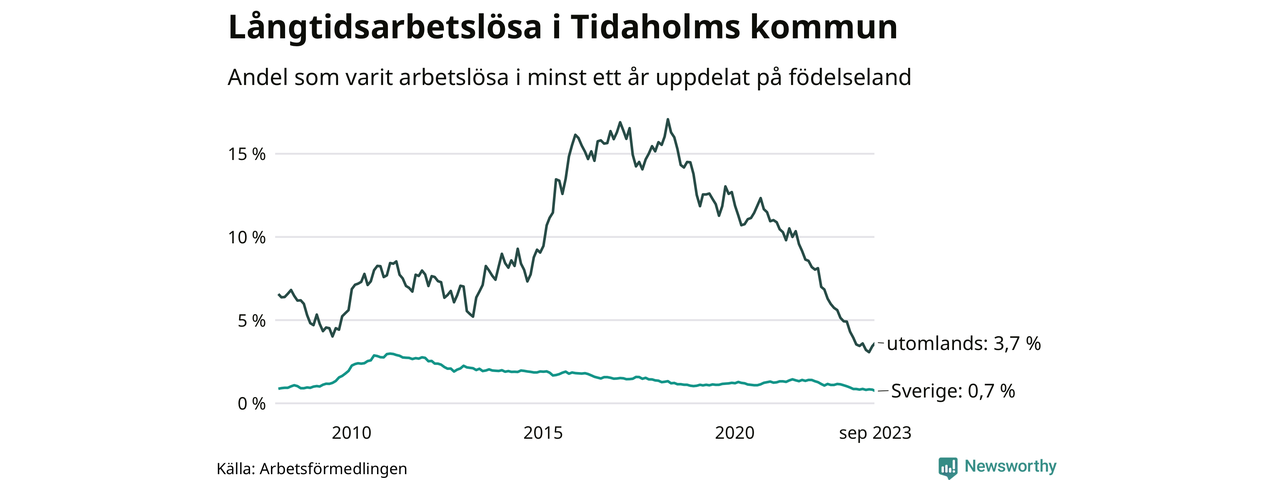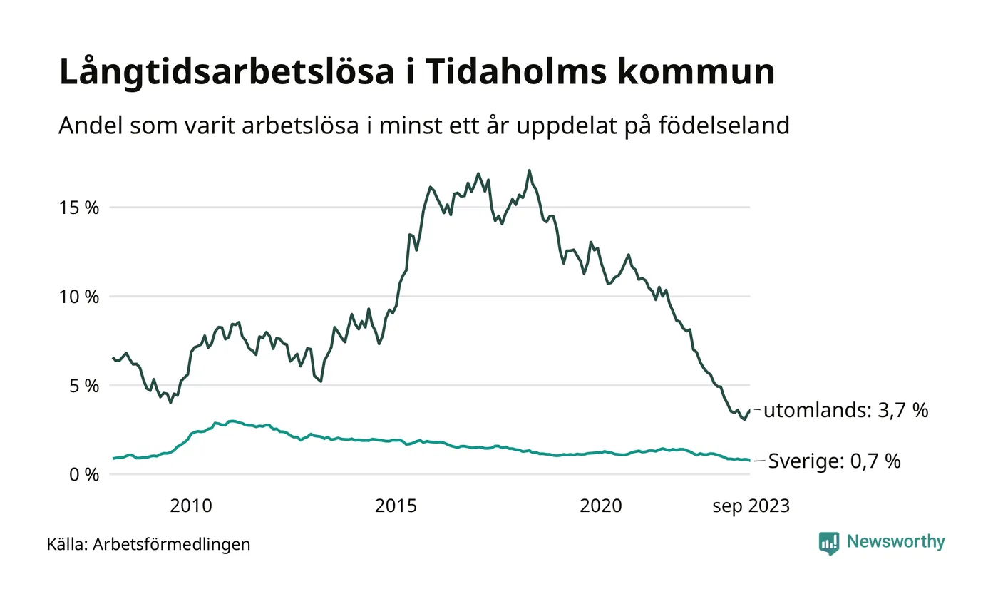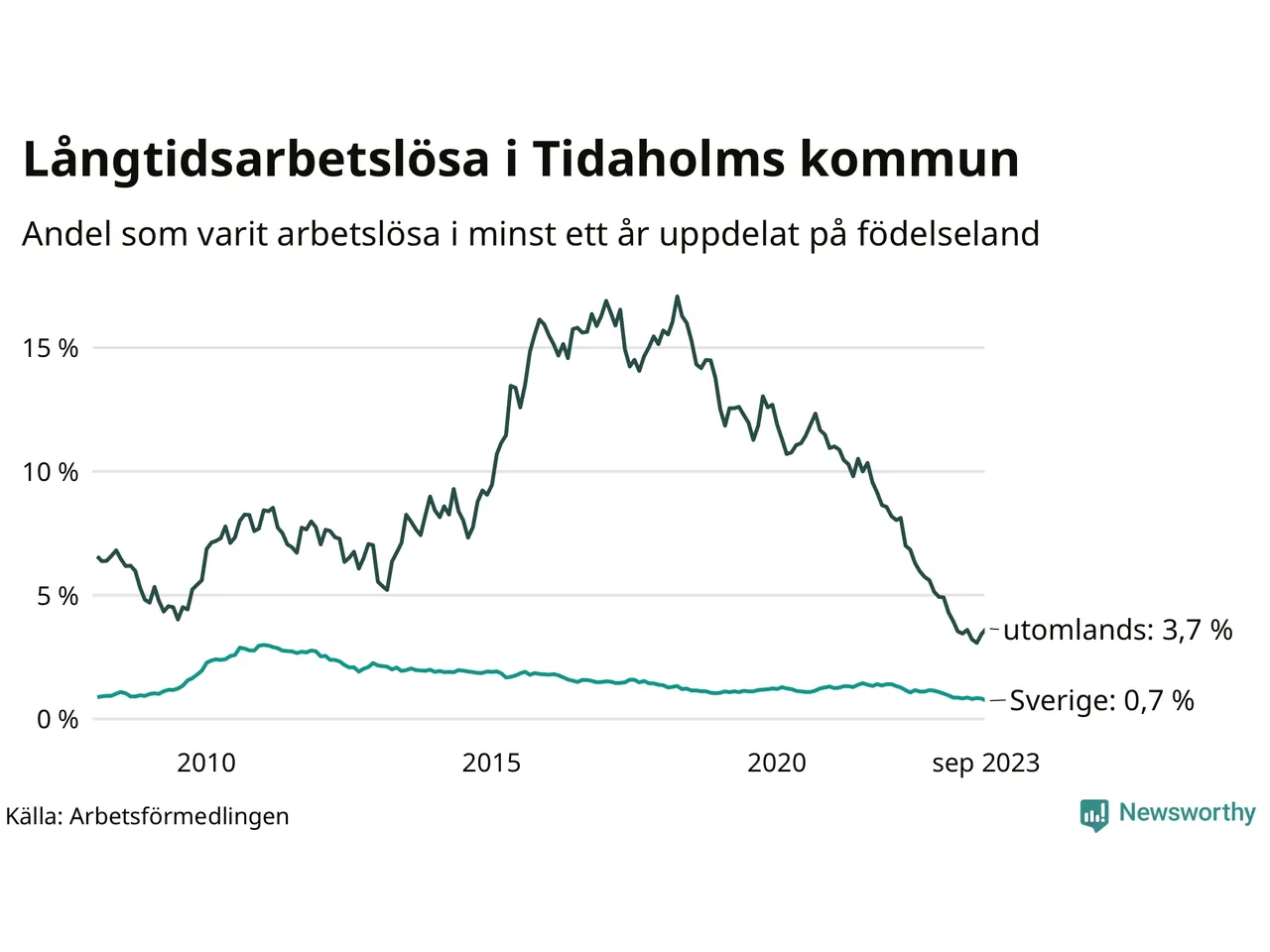 39 av de långtidsarbetslösa i Tidaholm är födda i Sverige, medan 29 är födda utomlands. Det innebär att långtidsarbetslösheten bland Sverigefödda är 0,7 procent, medan den är fem gånger så hög – 3,7 procent – bland födda utomlands. Även i riket som helhet är arbetslösheten högre bland utrikesfödda.