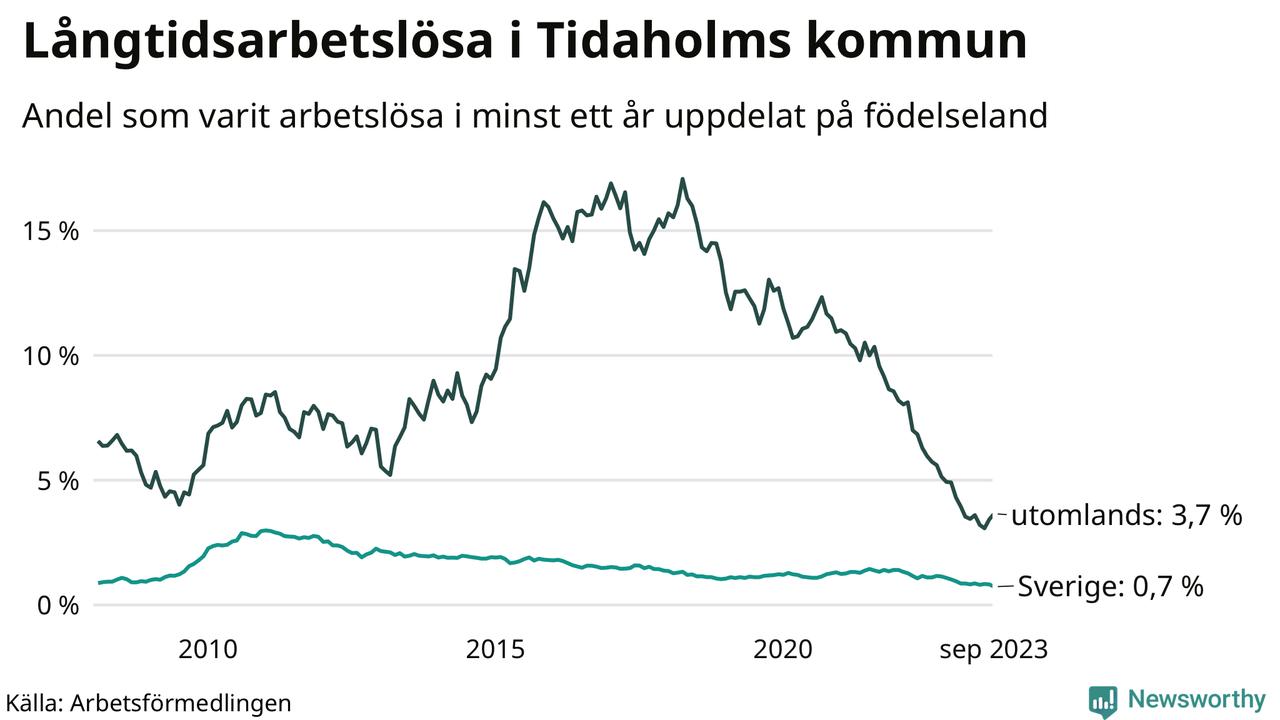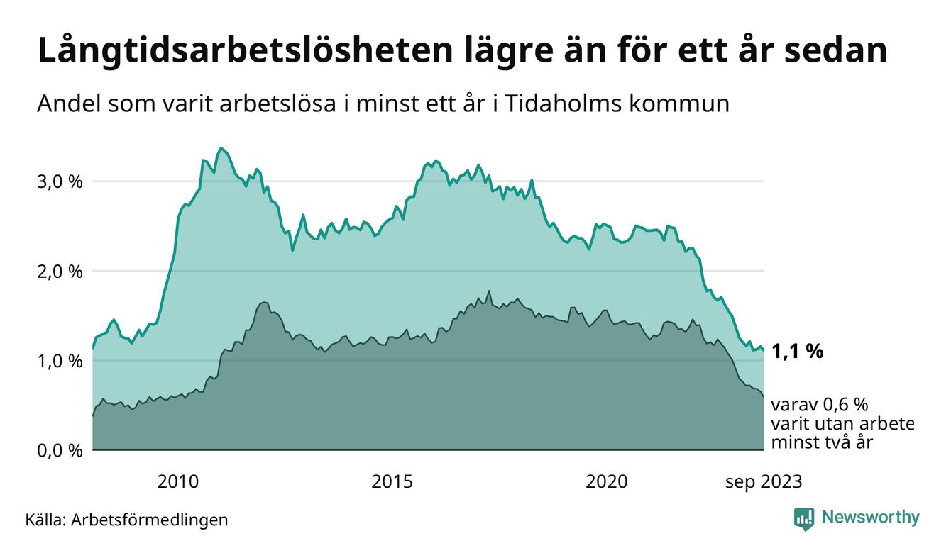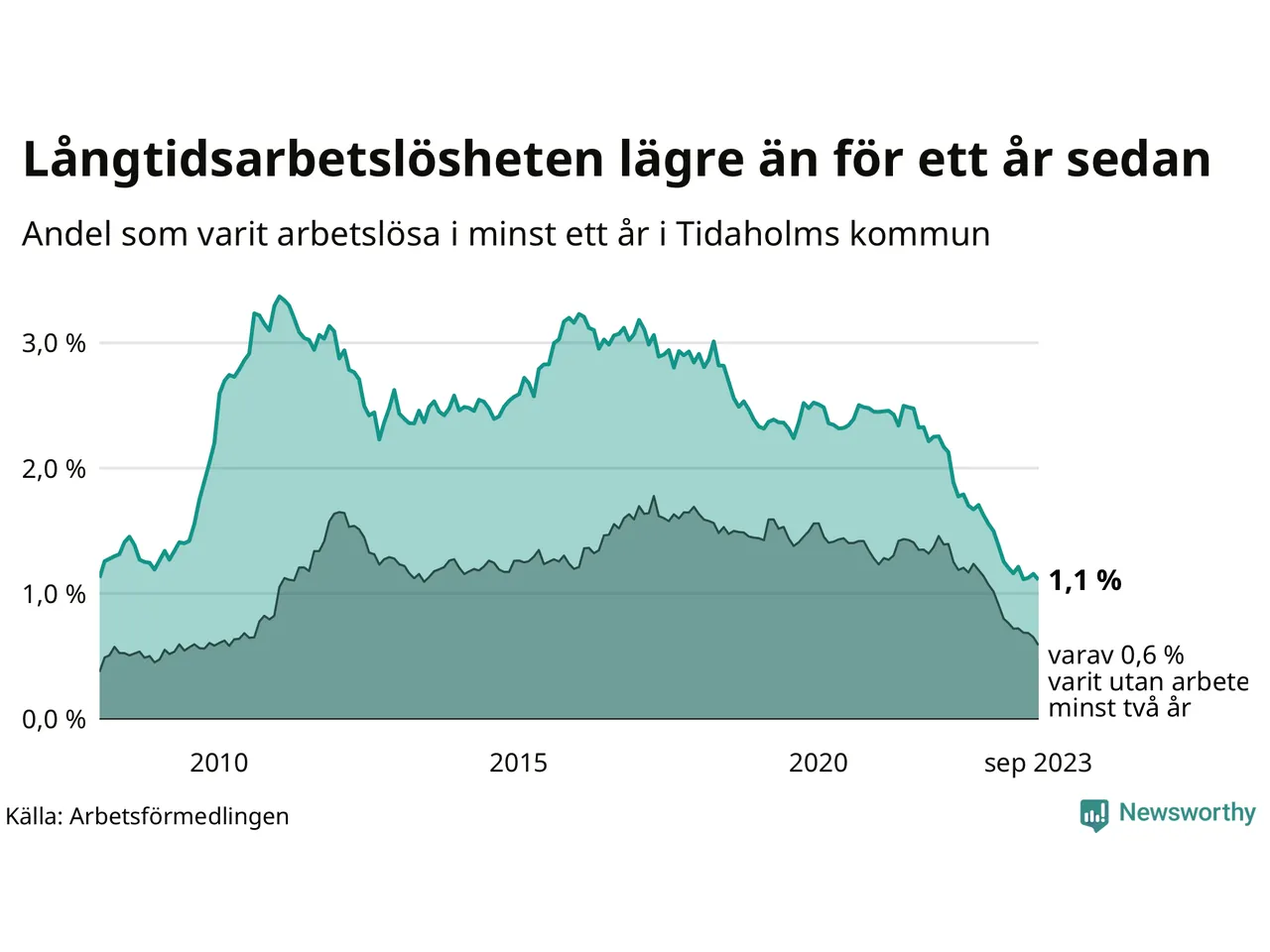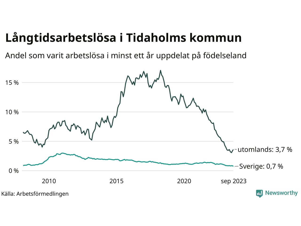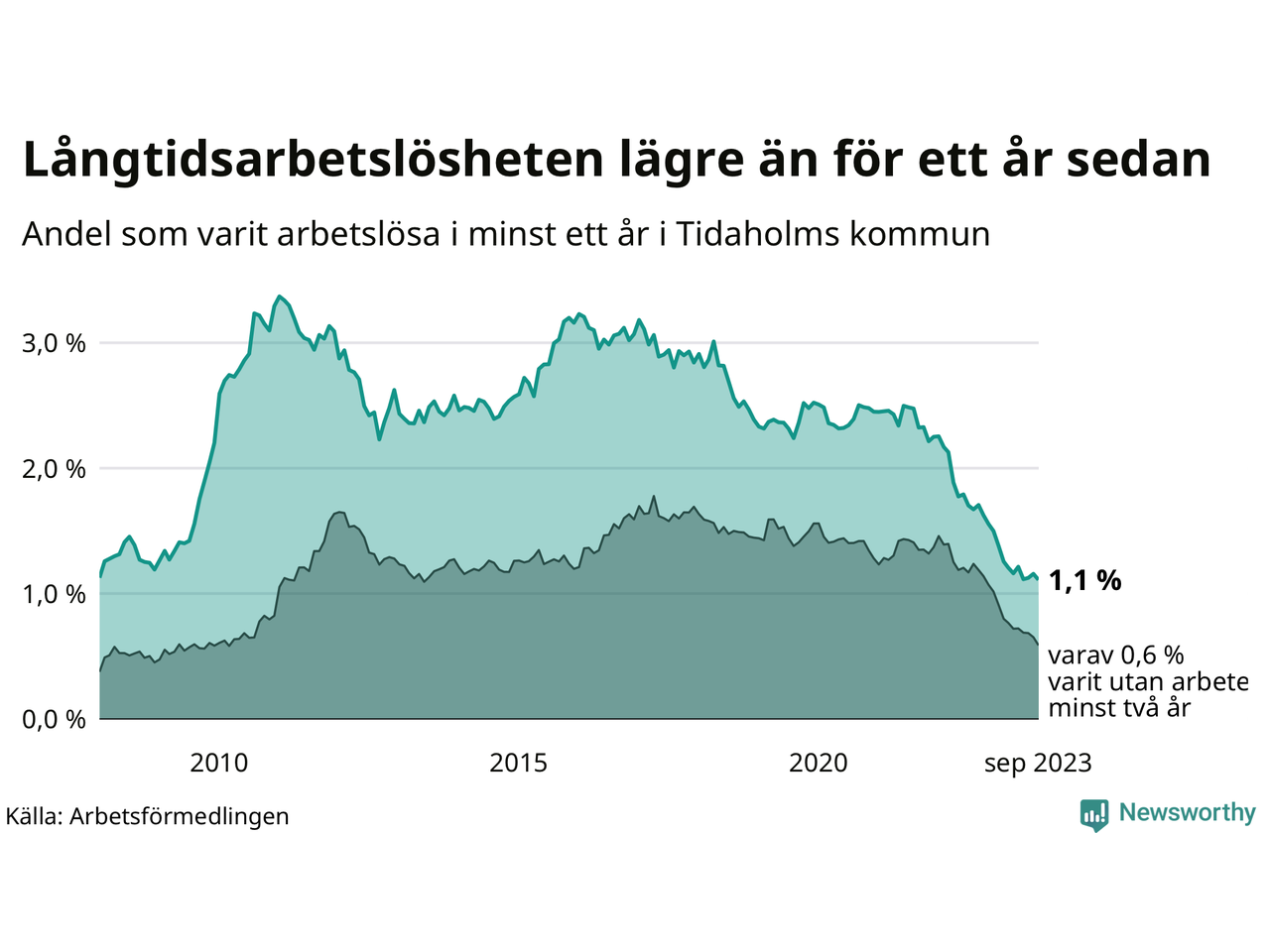 I september hade 68 Tidaholmbor varit arbetslösa i minst ett år, vilket är tre färre än månaden innan. 68 personer motsvarar 1,1 procent av arbetskraften i kommunen – andelen långtidsarbetslösa är 0,6 procentenheter lägre än samma månad för ett år sedan. Det är också den den lägsta andelen långtidsarbetslösa under de senaste 15 åren. Tidaholm tillhör de kommuner med lägst andel långtidsarbetslösa i hela landet just nu.