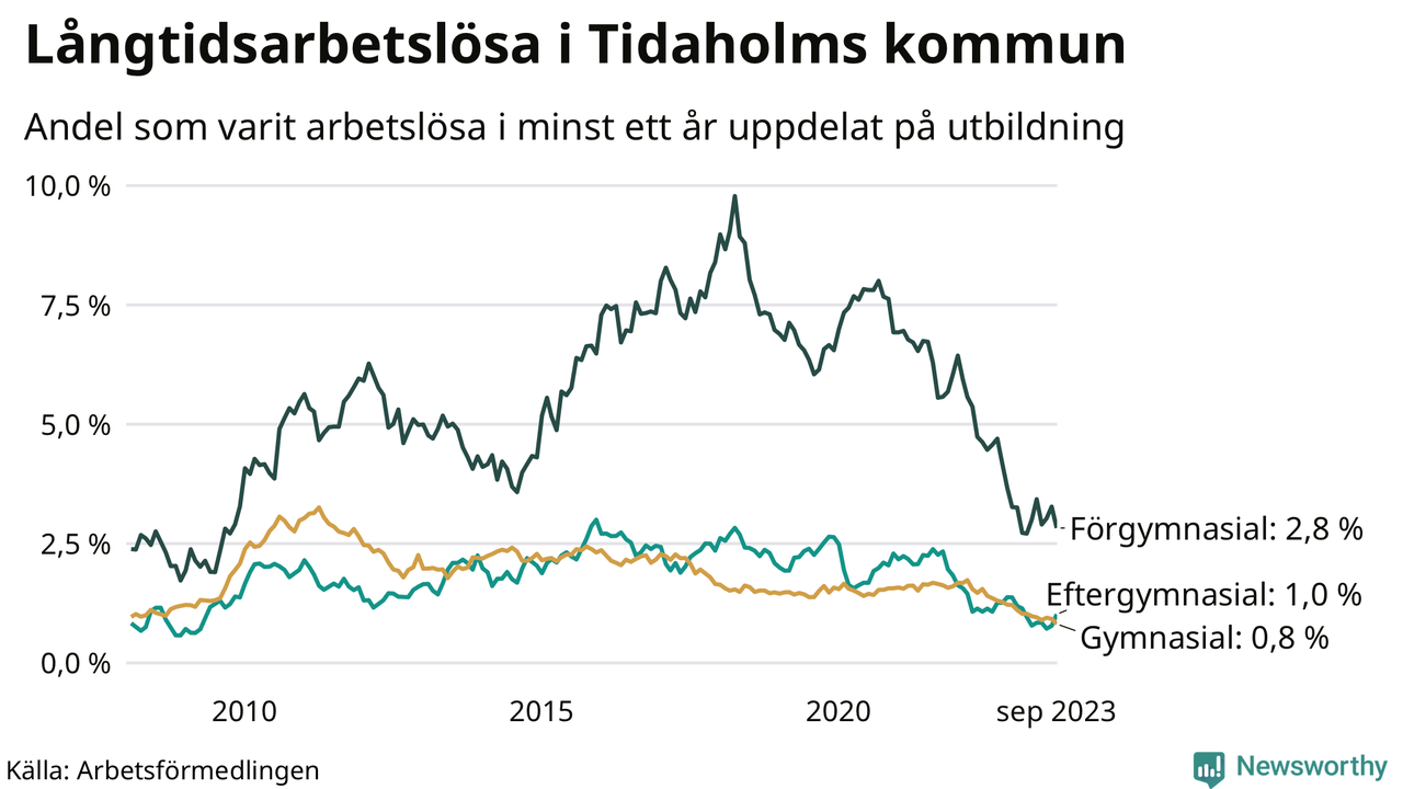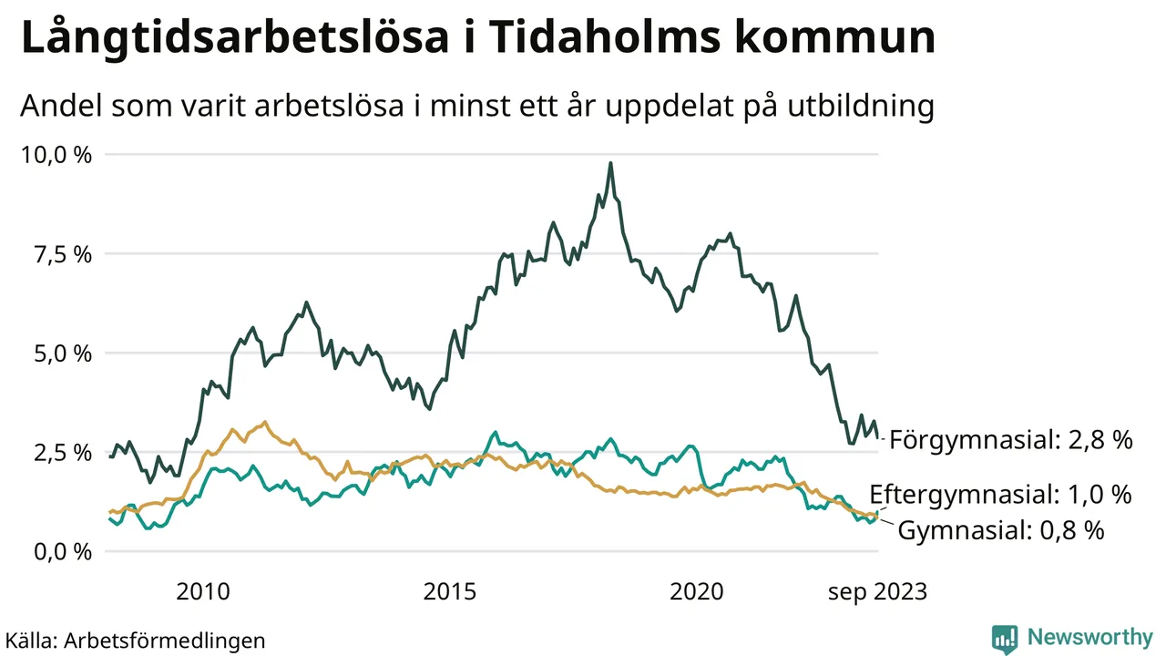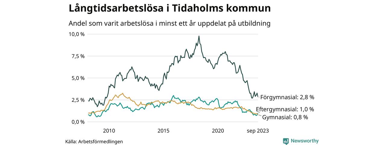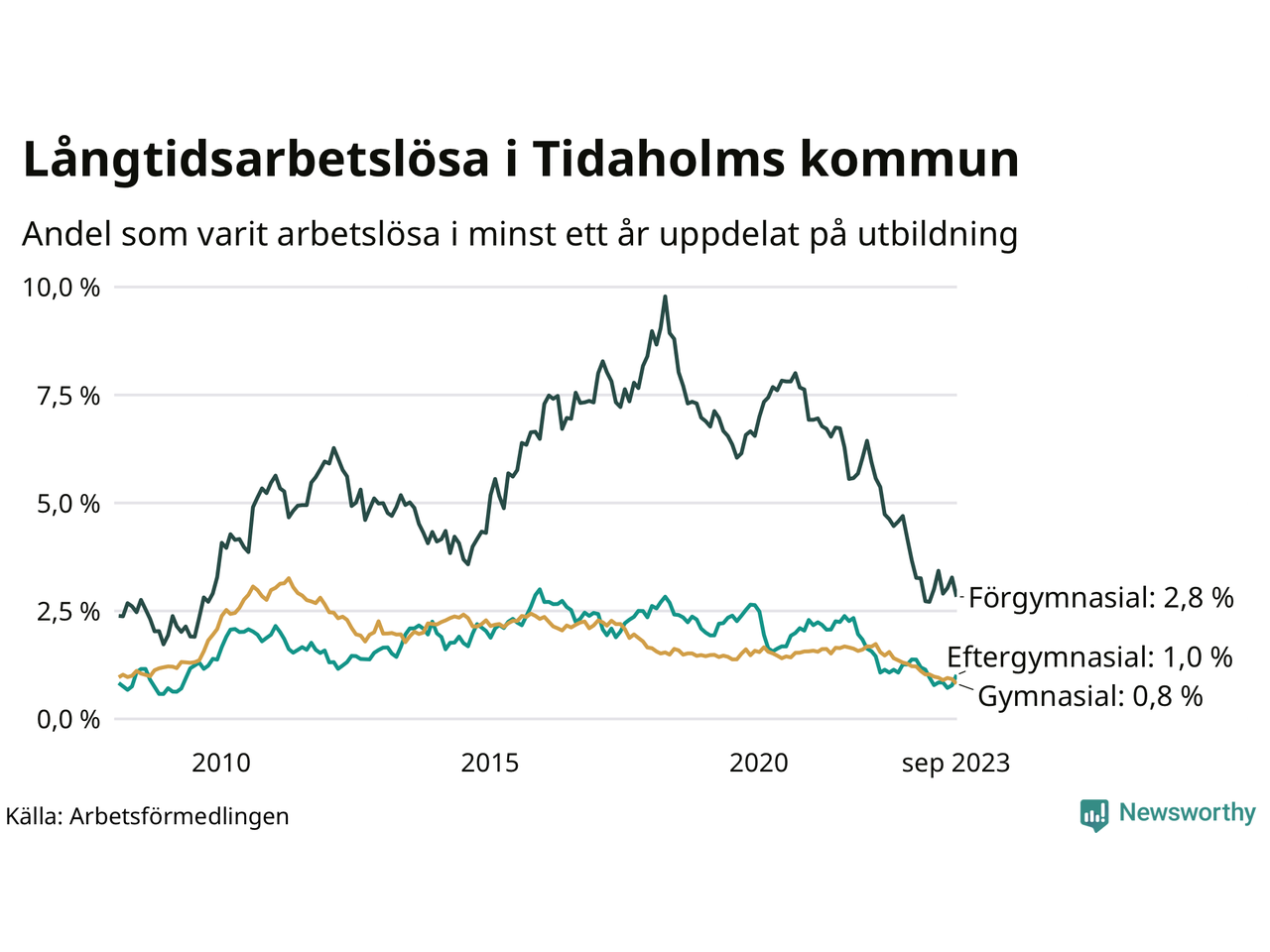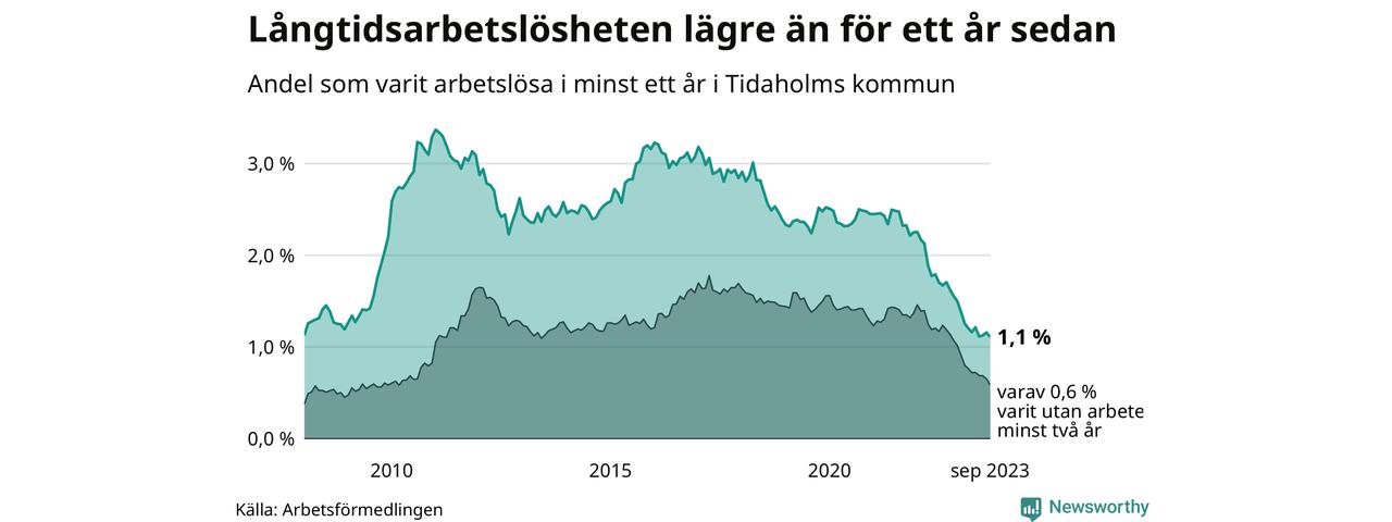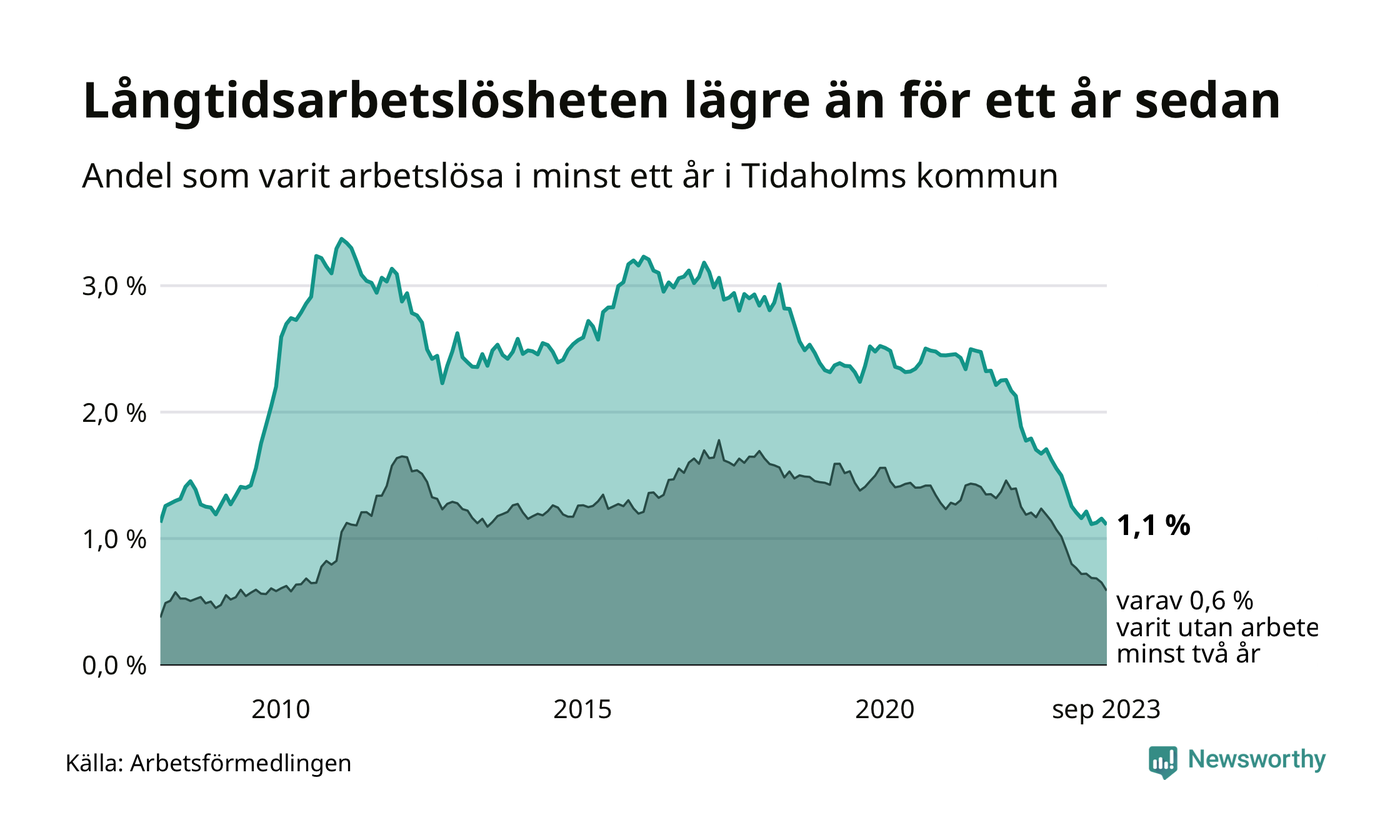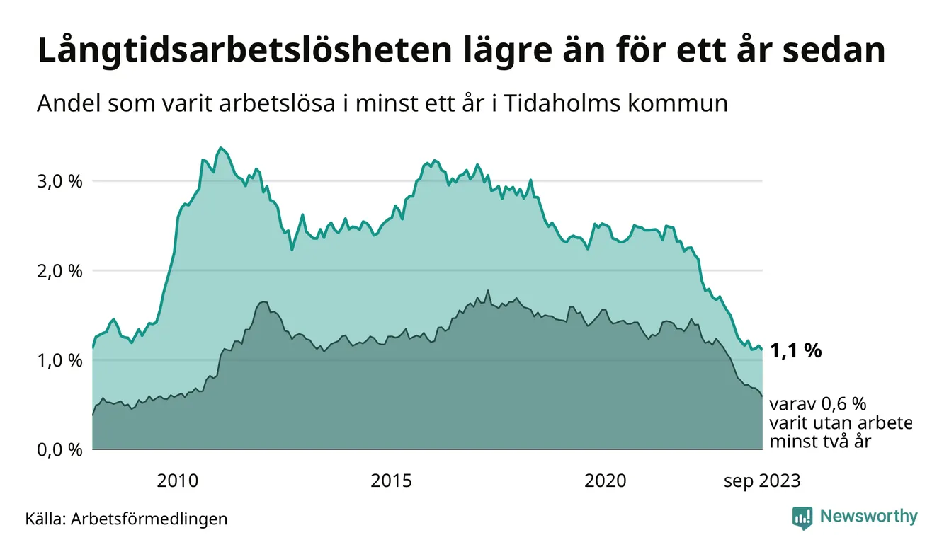 I september hade 68 Tidaholmbor varit arbetslösa i minst ett år, vilket är tre färre än månaden innan. 68 personer motsvarar 1,1 procent av arbetskraften i kommunen – andelen långtidsarbetslösa är 0,6 procentenheter lägre än samma månad för ett år sedan. Det är också den den lägsta andelen långtidsarbetslösa under de senaste 15 åren. Tidaholm tillhör de kommuner med lägst andel långtidsarbetslösa i hela landet just nu.