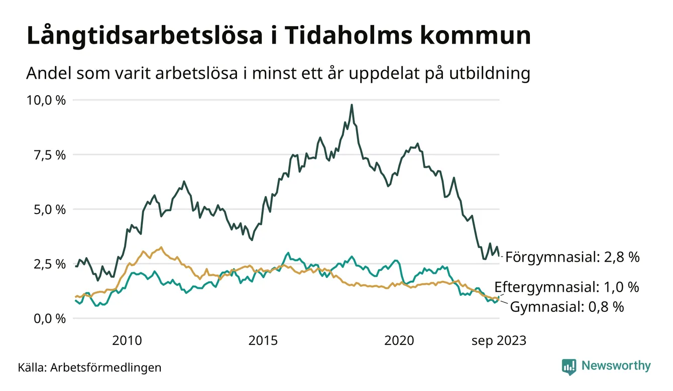 Andelen som varit utan arbete i minst 12 månader i Tidaholms kommun är den lägsta under de senaste 15 åren. Det visar Arbetsförmedlingens senaste månadsstatistik.
