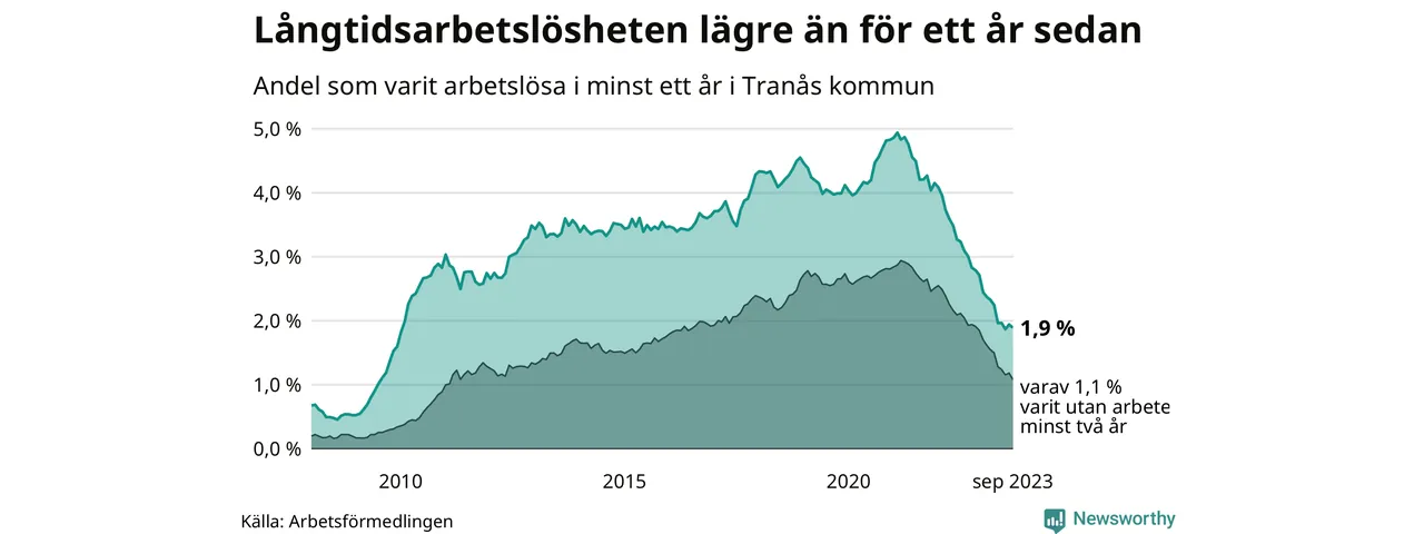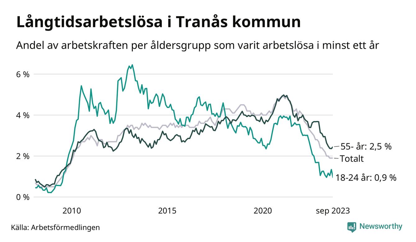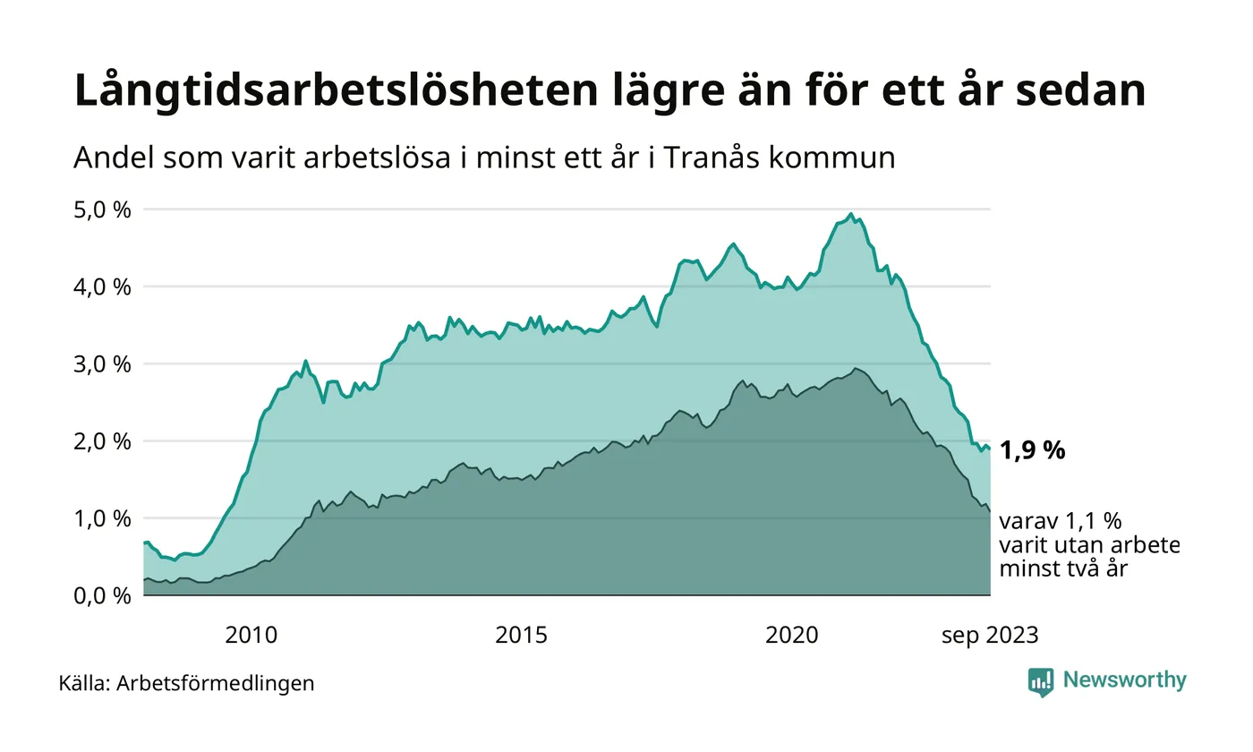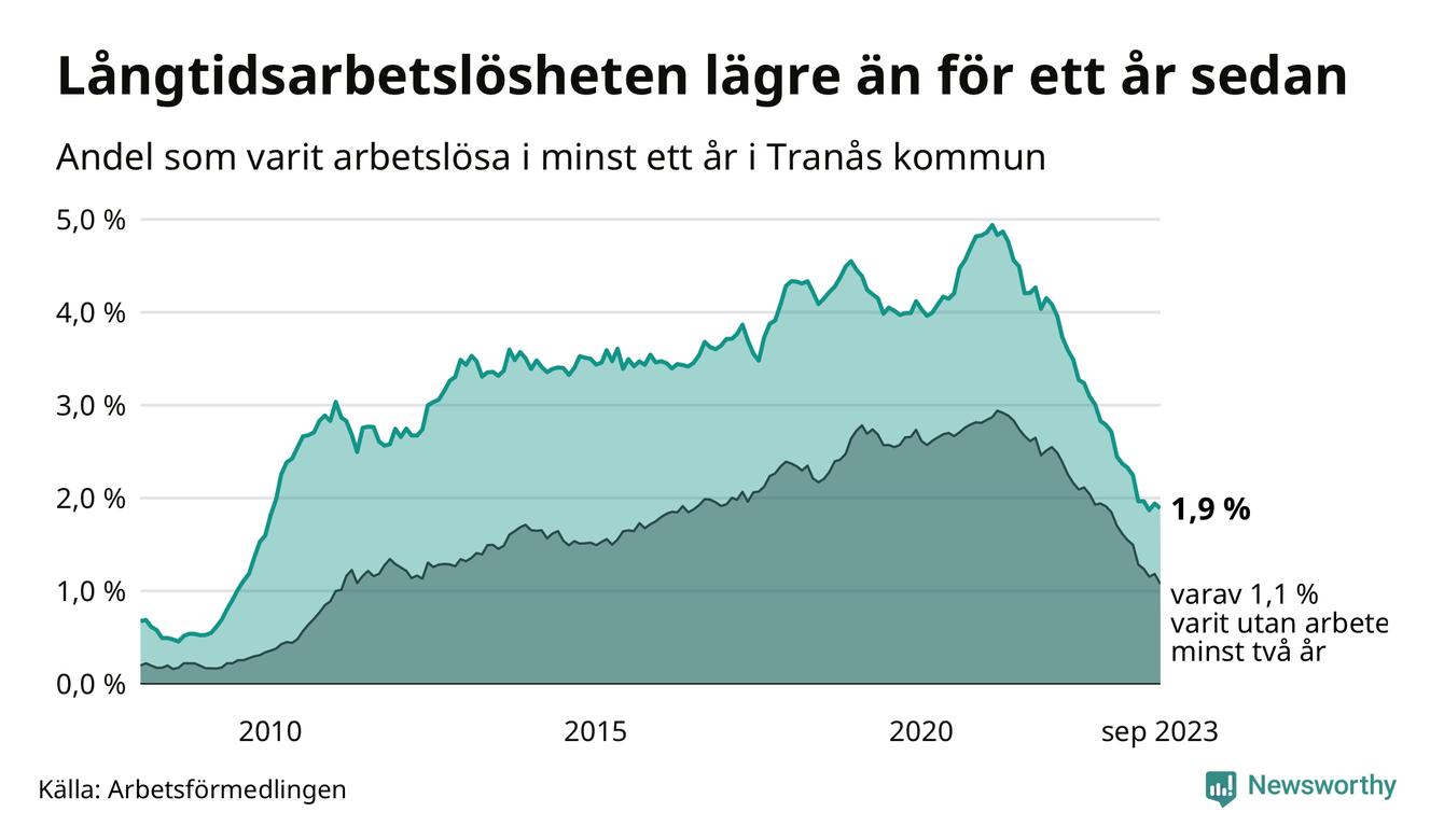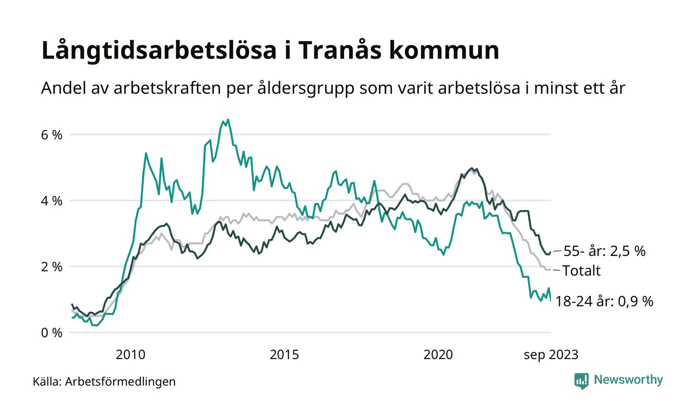 I september hade 165 Tranåsbor varit arbetslösa i minst ett år, vilket är fyra färre än månaden innan. 165 personer motsvarar 1,9 procent av arbetskraften i kommunen – andelen långtidsarbetslösa är 1,1 procentenheter lägre än samma månad för ett år sedan.