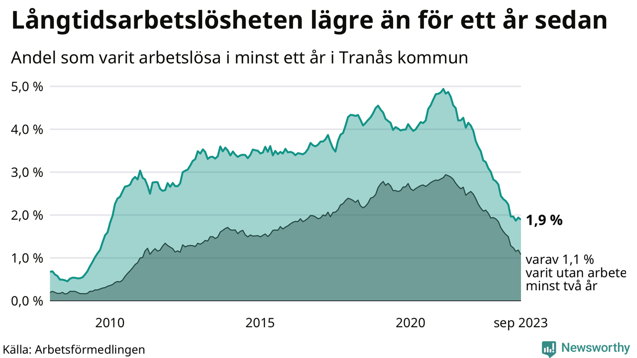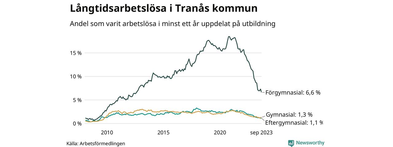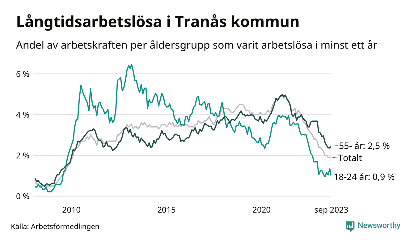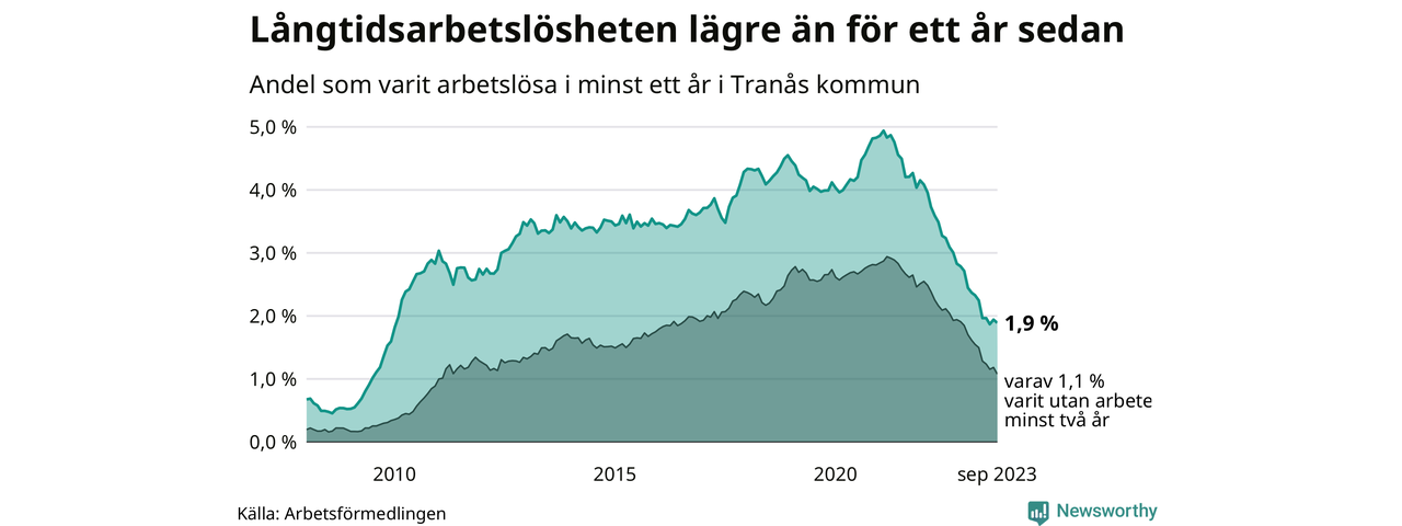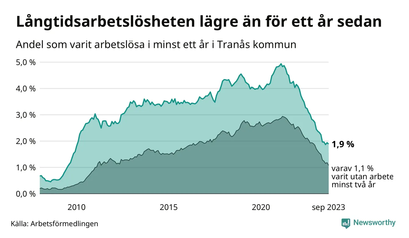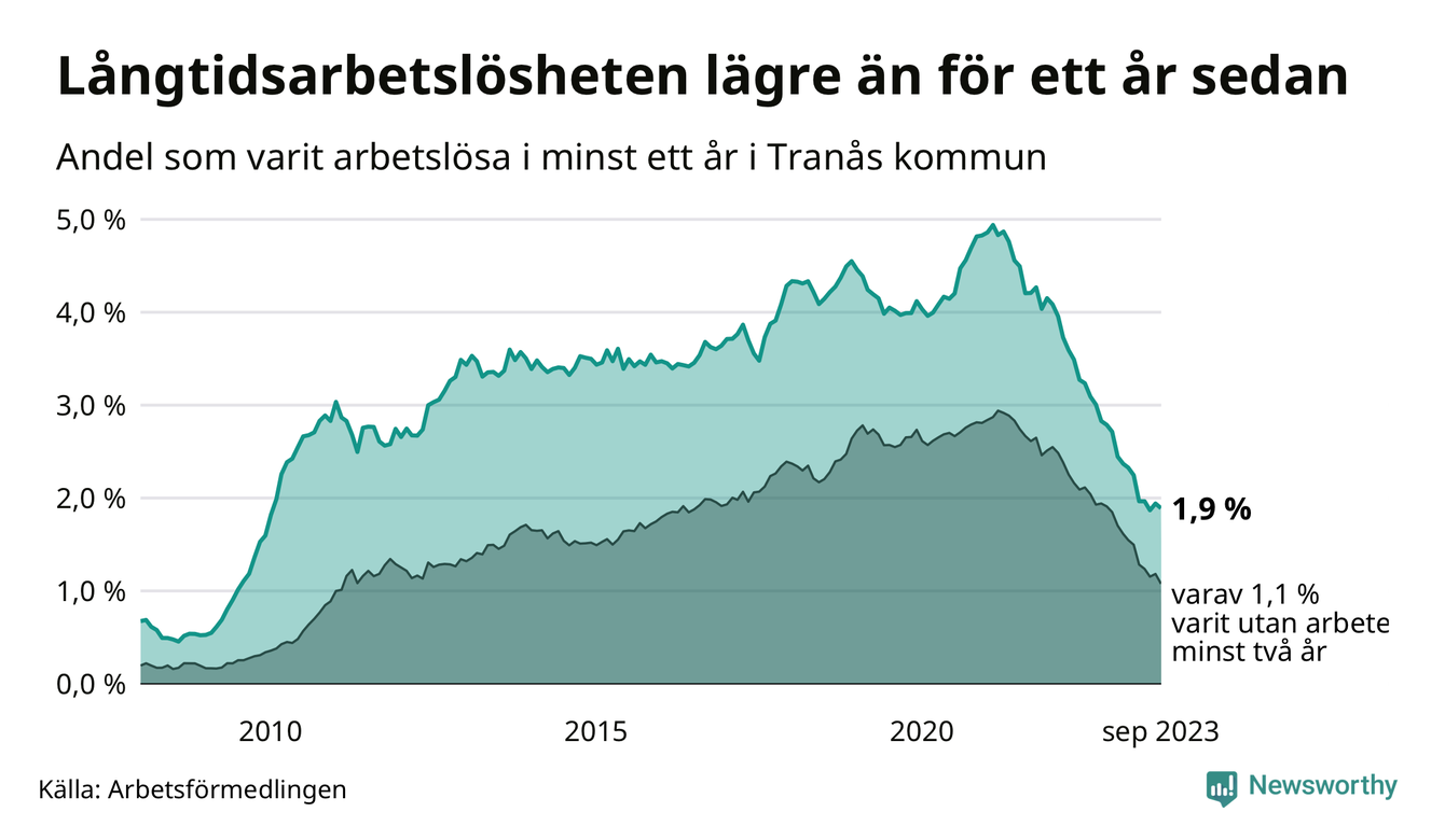I september hade 165 Tranåsbor varit arbetslösa i minst ett år, vilket är fyra färre än månaden innan. 165 personer motsvarar 1,9 procent av arbetskraften i kommunen – andelen långtidsarbetslösa är 1,1 procentenheter lägre än samma månad för ett år sedan.