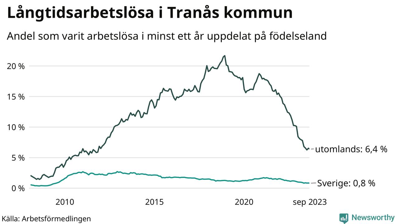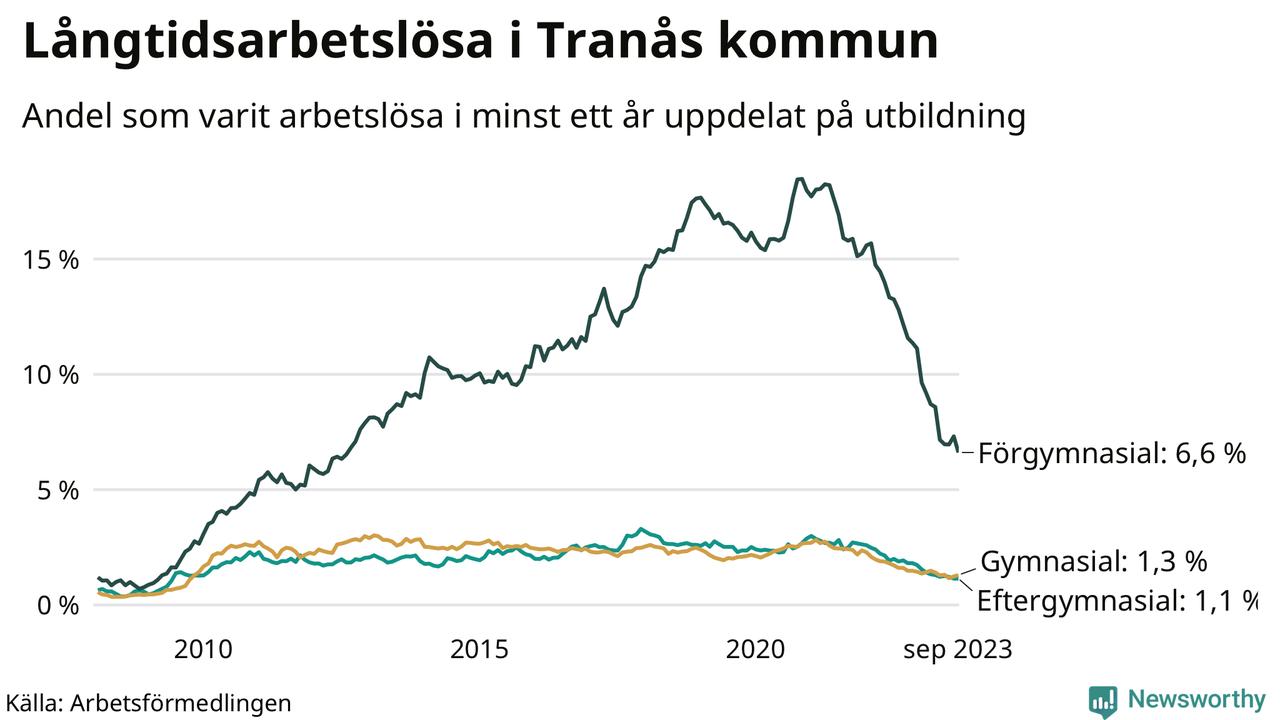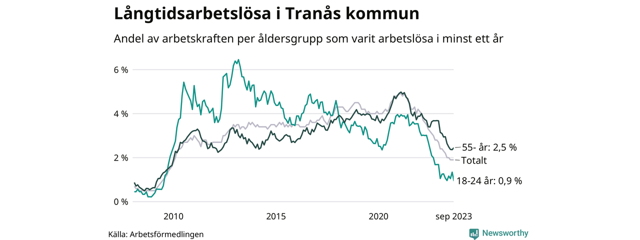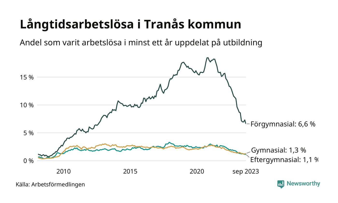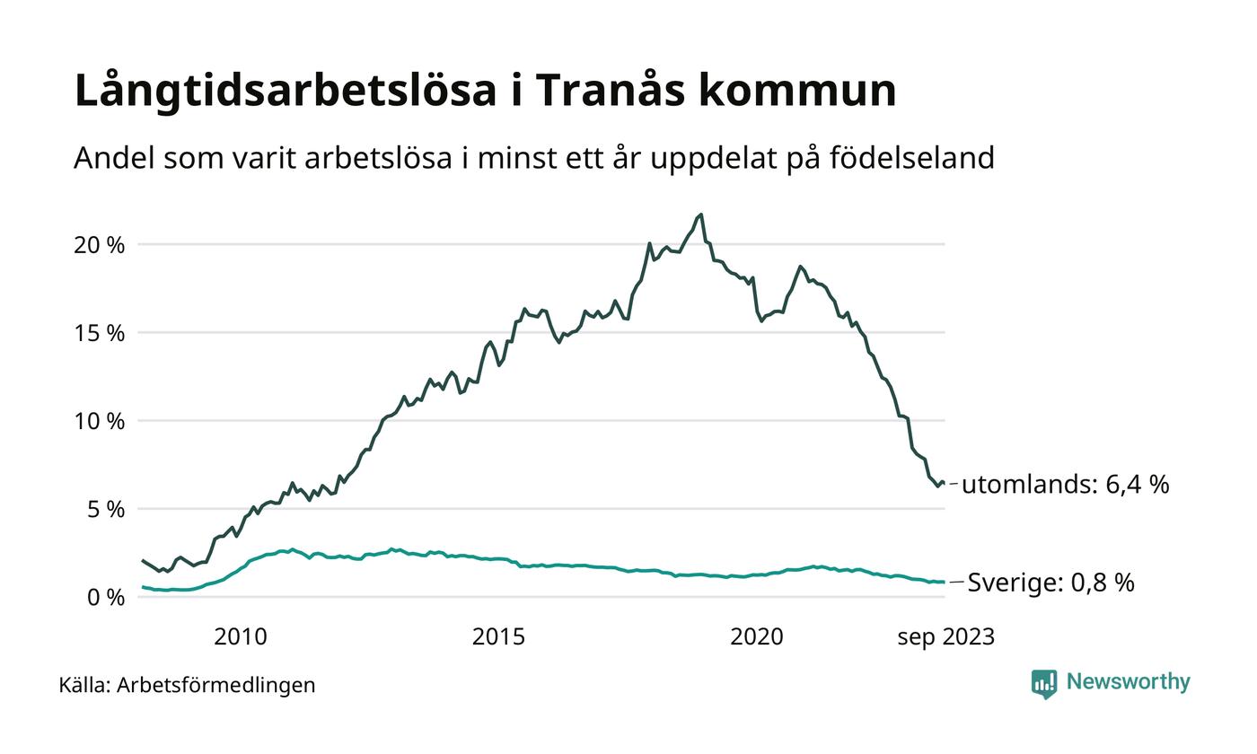 I september hade 165 Tranåsbor varit arbetslösa i minst ett år, vilket är fyra färre än månaden innan. 165 personer motsvarar 1,9 procent av arbetskraften i kommunen – andelen långtidsarbetslösa är 1,1 procentenheter lägre än samma månad för ett år sedan.