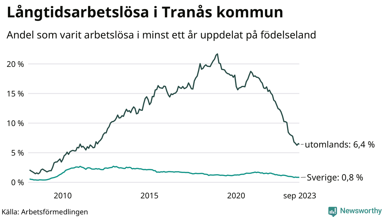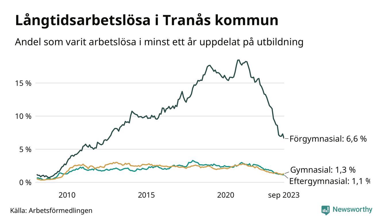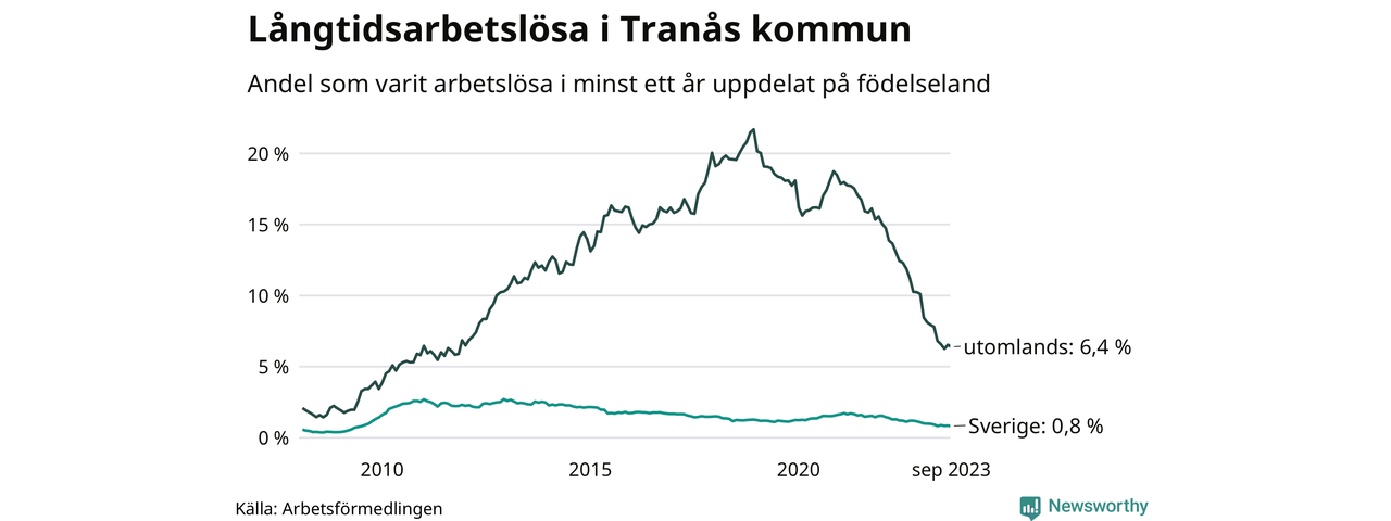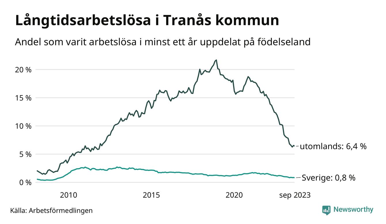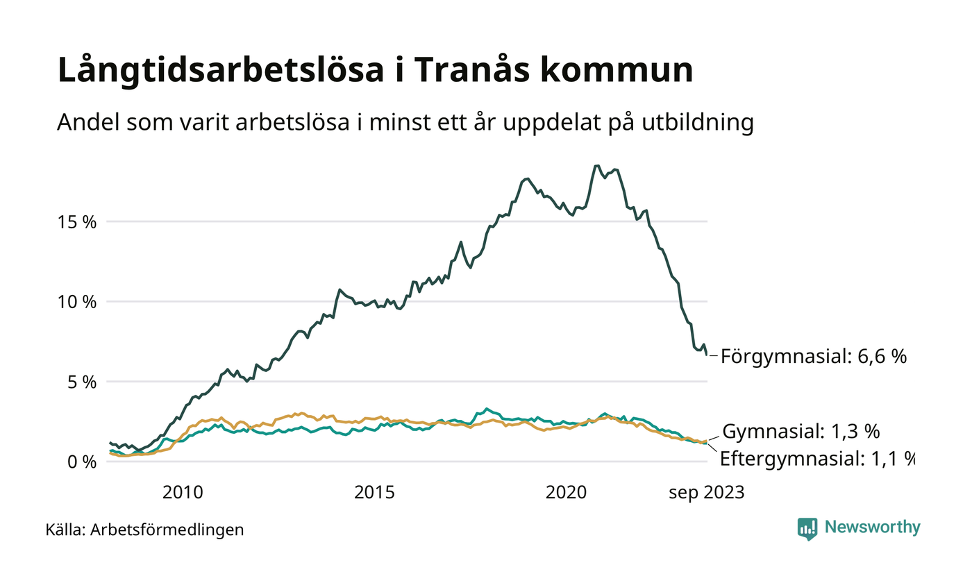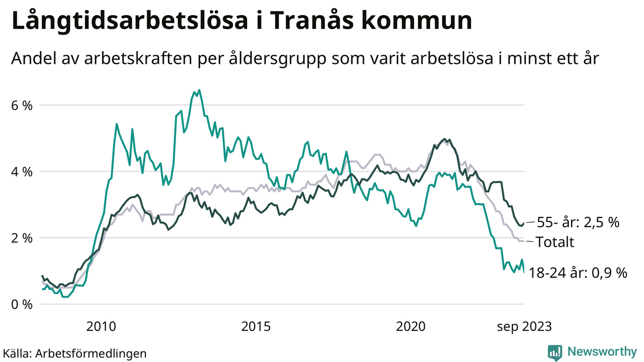 I september hade 165 Tranåsbor varit arbetslösa i minst ett år, vilket är fyra färre än månaden innan. 165 personer motsvarar 1,9 procent av arbetskraften i kommunen – andelen långtidsarbetslösa är 1,1 procentenheter lägre än samma månad för ett år sedan.