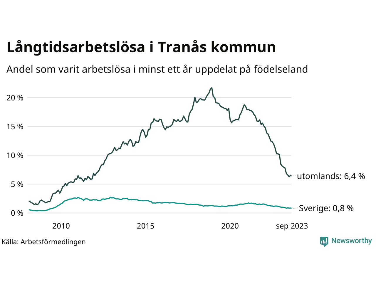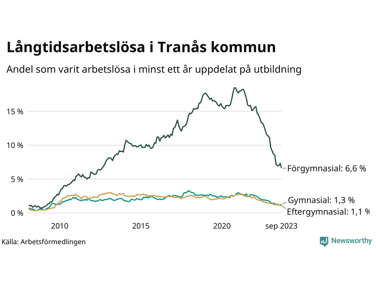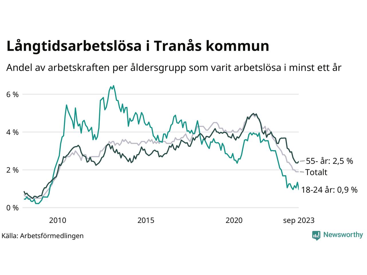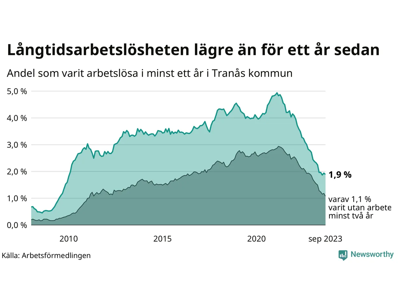 I september hade 165 Tranåsbor varit arbetslösa i minst ett år, vilket är fyra färre än månaden innan. 165 personer motsvarar 1,9 procent av arbetskraften i kommunen – andelen långtidsarbetslösa är 1,1 procentenheter lägre än samma månad för ett år sedan.
