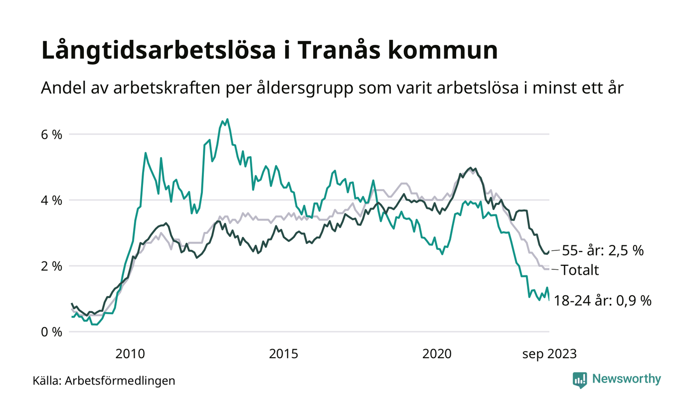 Av de 165 personerna som varit arbetslösa i mer än ett år i Tranås kommun är 46 personer mellan 55 och 651 år och nio är mellan 18 och 24 år. För den äldre gruppen är andelen arbetslösa 2,5 procent medan den i den yngre gruppen är 0,9 procent. Även i riket som helhet är långtidsarbetslösheten högre i gruppen äldre.