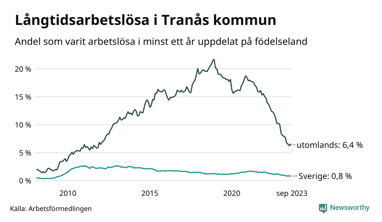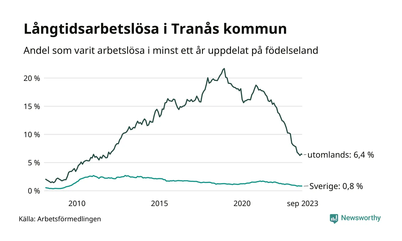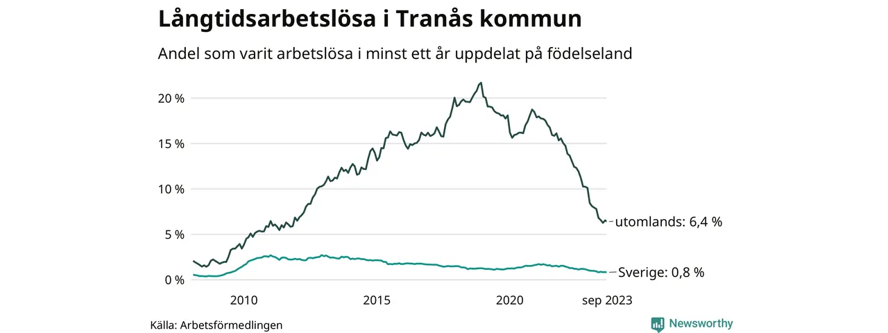58 av de långtidsarbetslösa i Tranås är födda i Sverige, medan 107 är födda utomlands. Det innebär att långtidsarbetslösheten bland Sverigefödda är 0,8 procent, medan den är åtta gånger så hög – 6,4 procent – bland födda utomlands. Även i riket som helhet är arbetslösheten högre bland utrikesfödda.