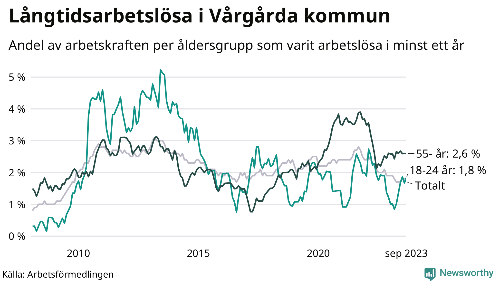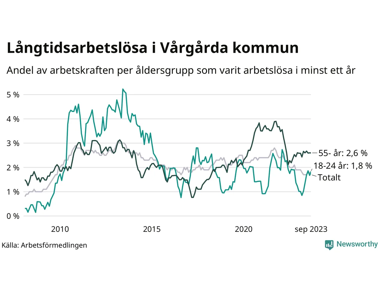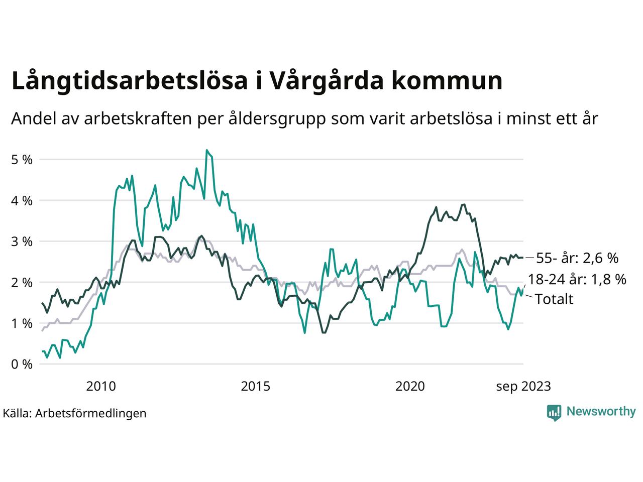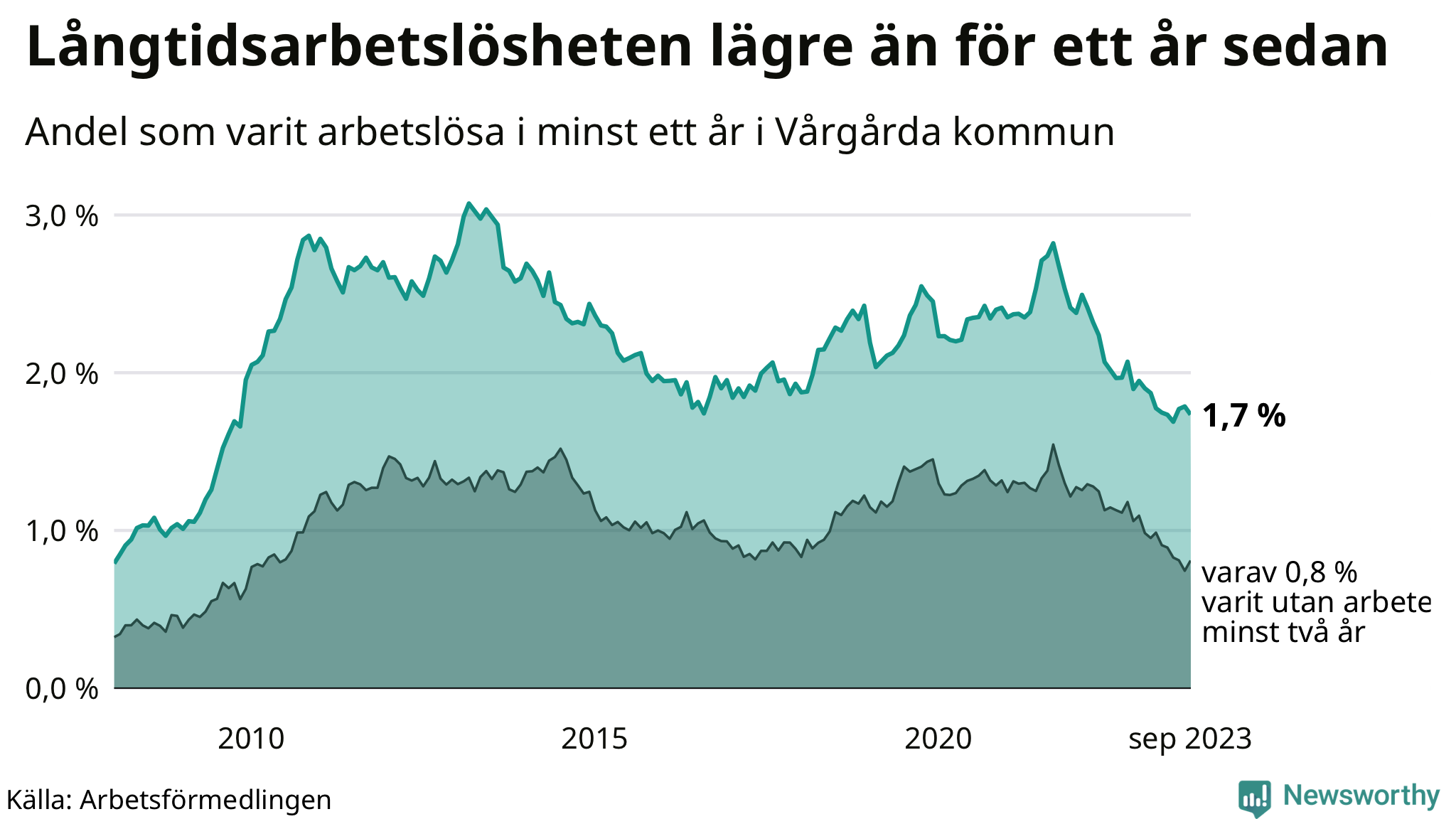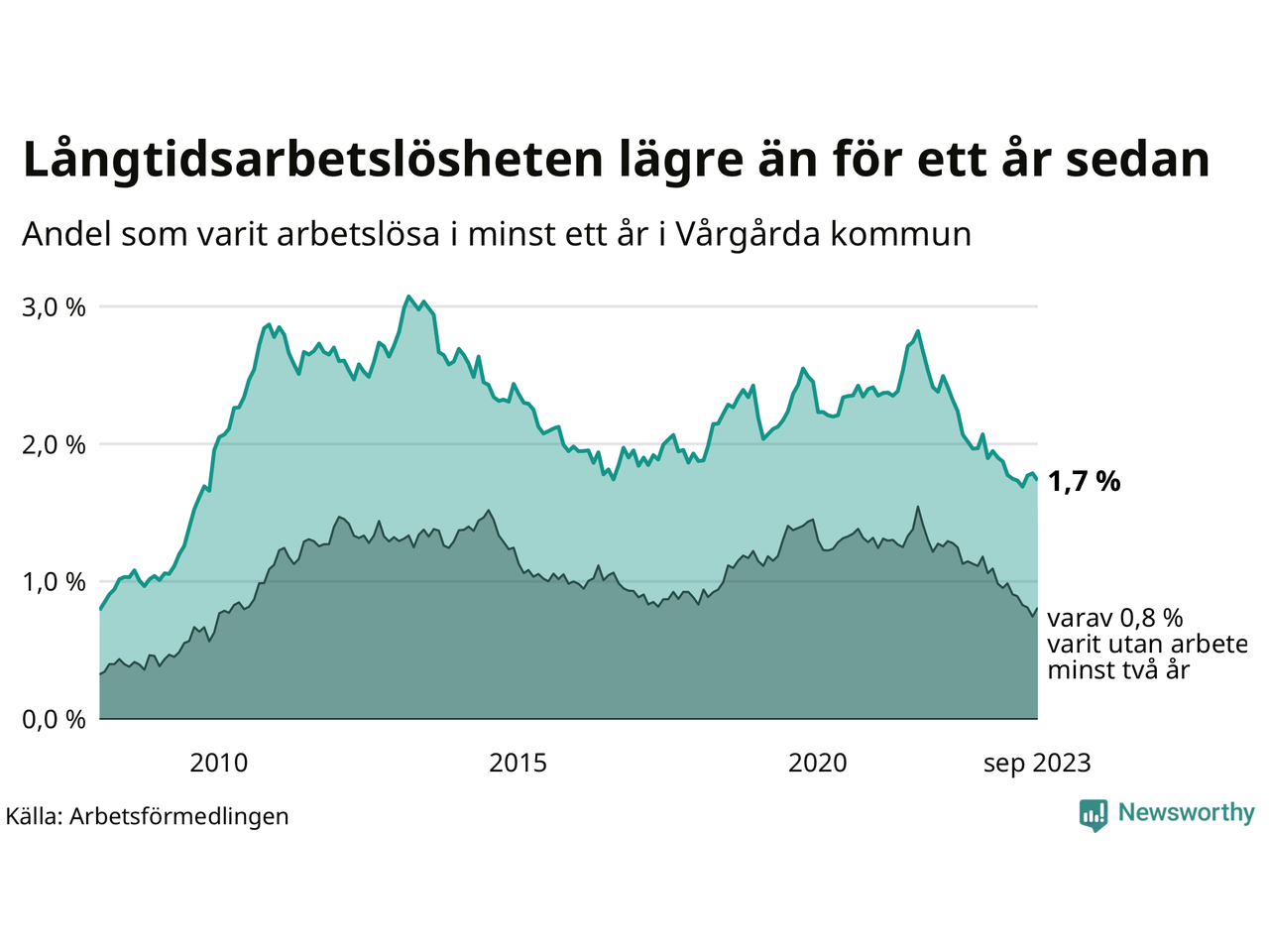 | Andel arbetslösa i minst två år | 0,8 % | 1,3 % | 1,6 % |