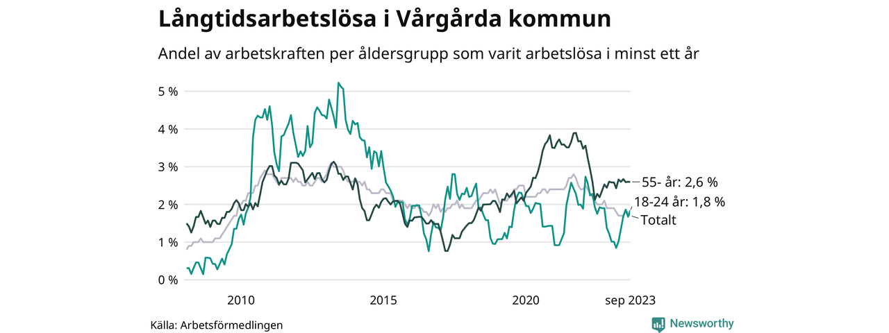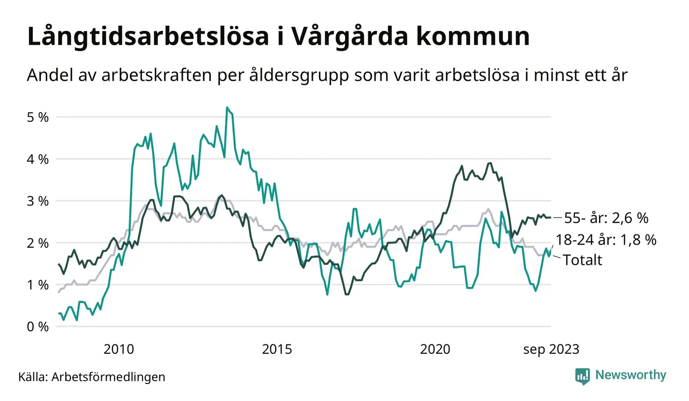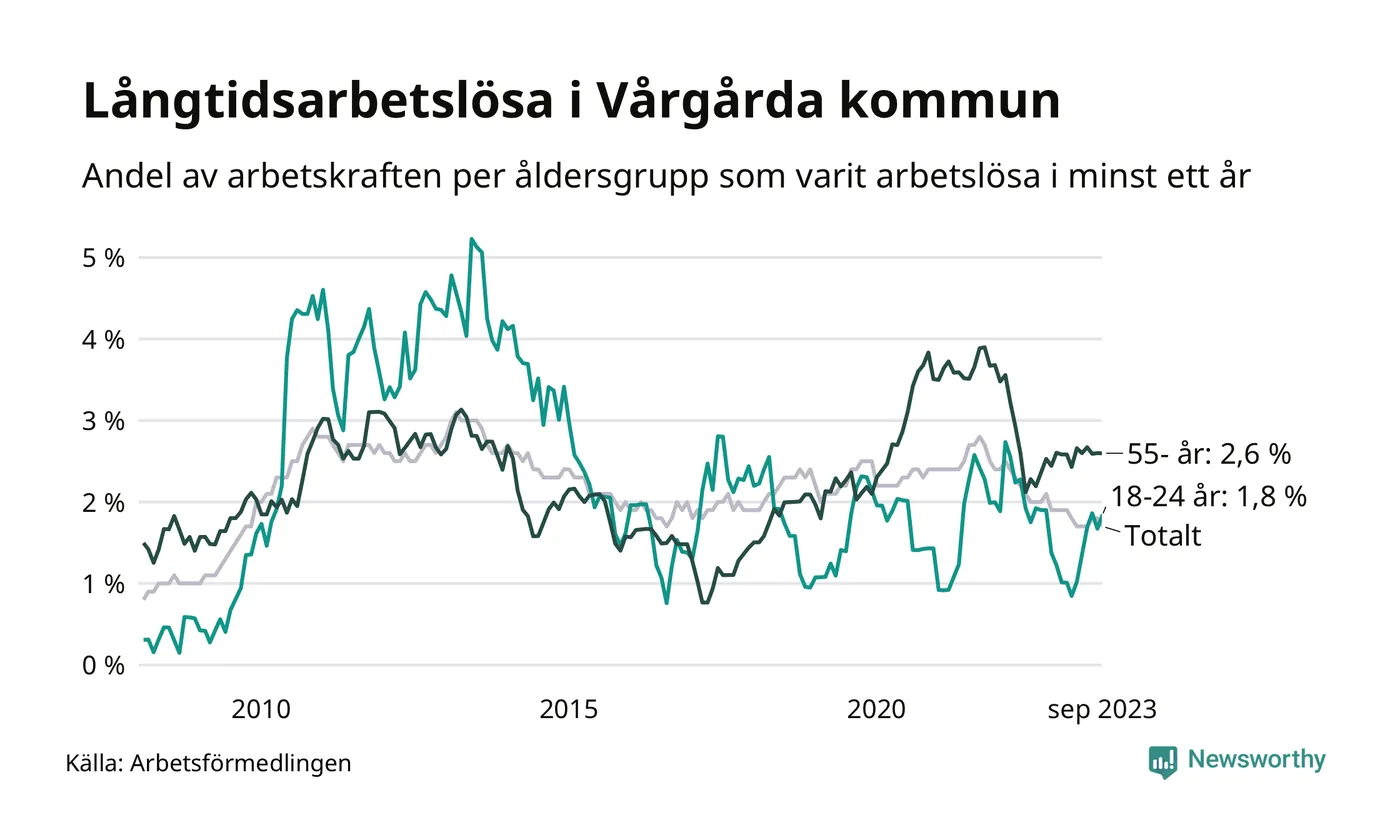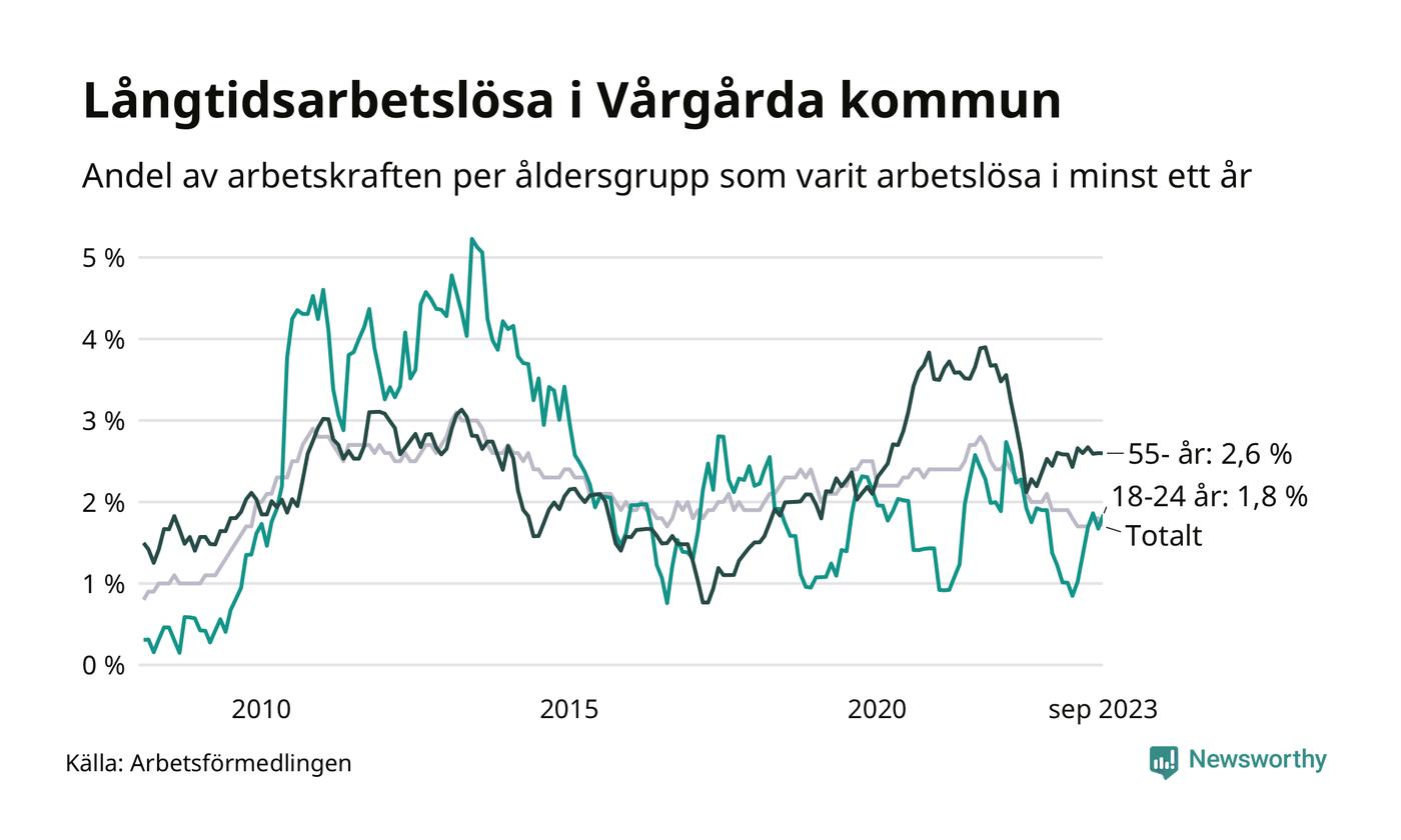 Av de 105 personerna som varit arbetslösa i mer än ett år i Vårgårda kommun är 34 personer mellan 55 och 651 år och elva är mellan 18 och 24 år. För den äldre gruppen är andelen arbetslösa 2,6 procent medan den i den yngre gruppen är 1,8 procent. Även i riket som helhet är långtidsarbetslösheten högre i gruppen äldre.