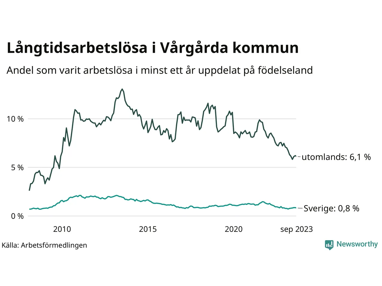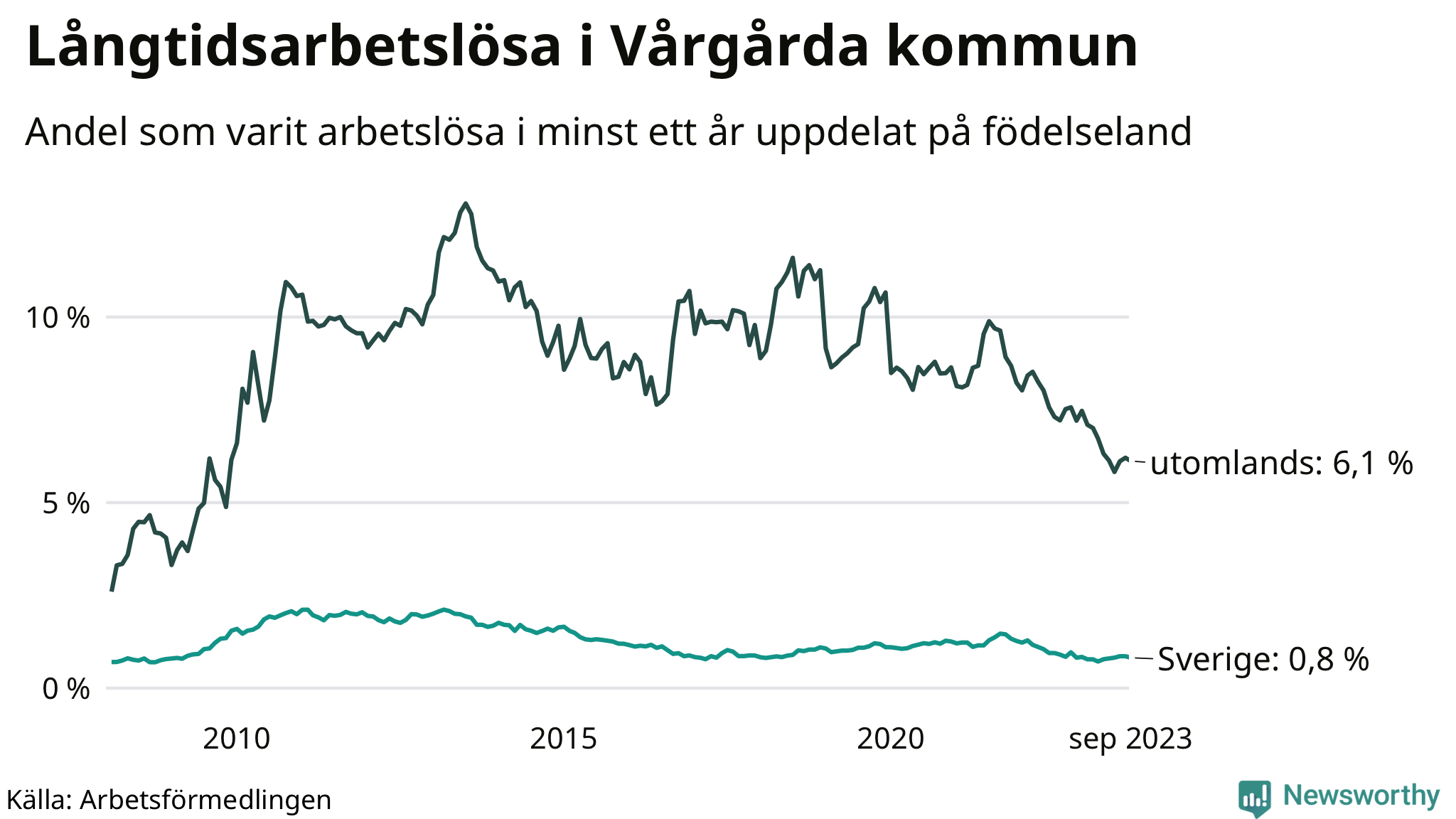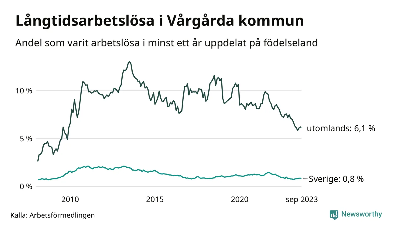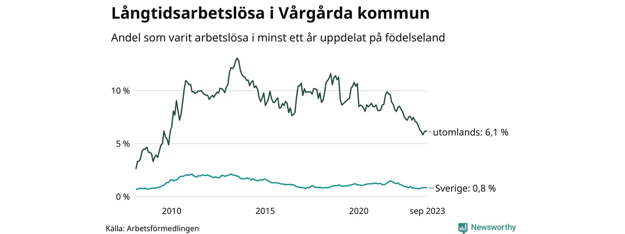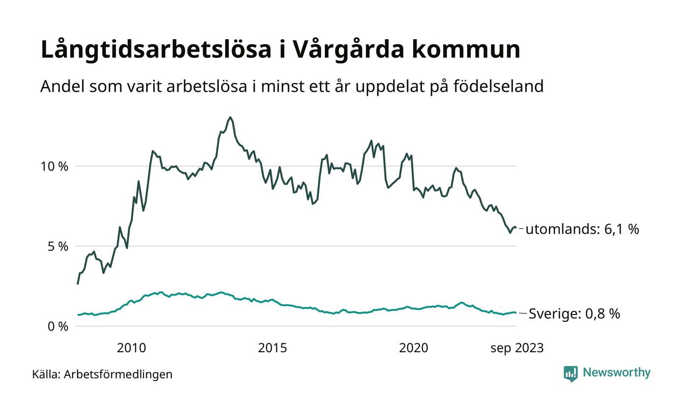 41 av de långtidsarbetslösa i Vårgårda är födda i Sverige, medan 64 är födda utomlands. Det innebär att långtidsarbetslösheten bland Sverigefödda är 0,8 procent, medan den är åtta gånger så hög – 6,1 procent – bland födda utomlands. Även i riket som helhet är arbetslösheten högre bland utrikesfödda.