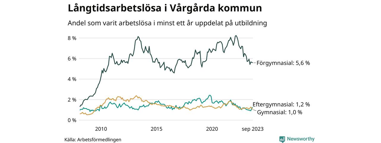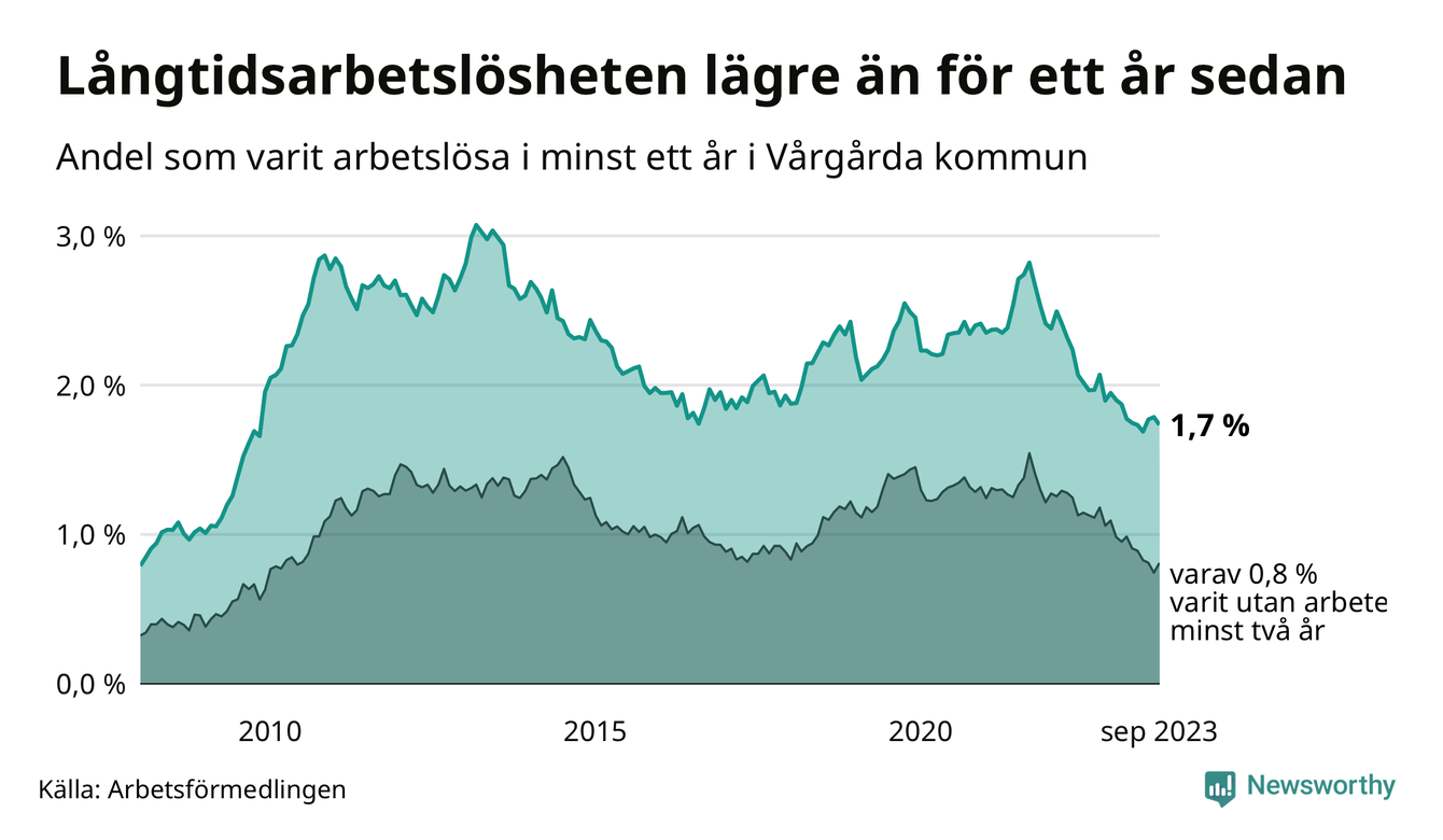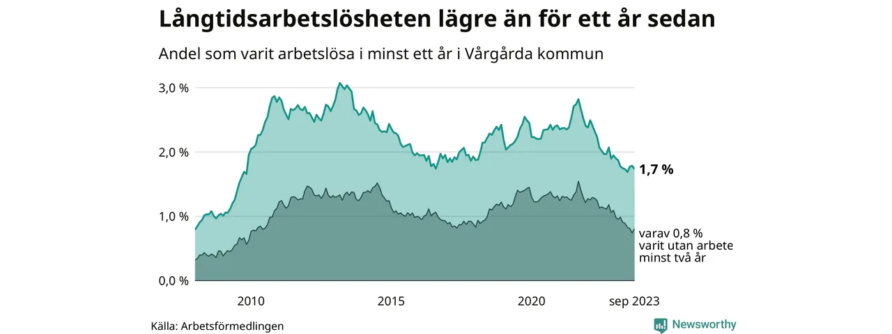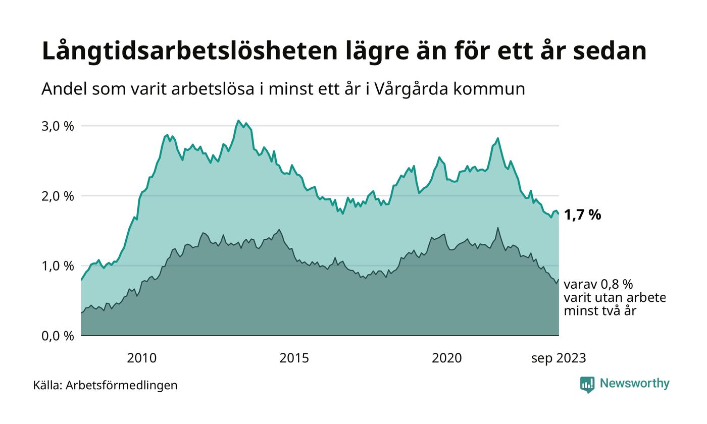 I september hade 105 Vårgårdabor varit arbetslösa i minst ett år, vilket är tre färre än månaden innan. 105 personer motsvarar 1,7 procent av arbetskraften i kommunen – andelen långtidsarbetslösa är 0,3 procentenheter lägre än samma månad för ett år sedan.