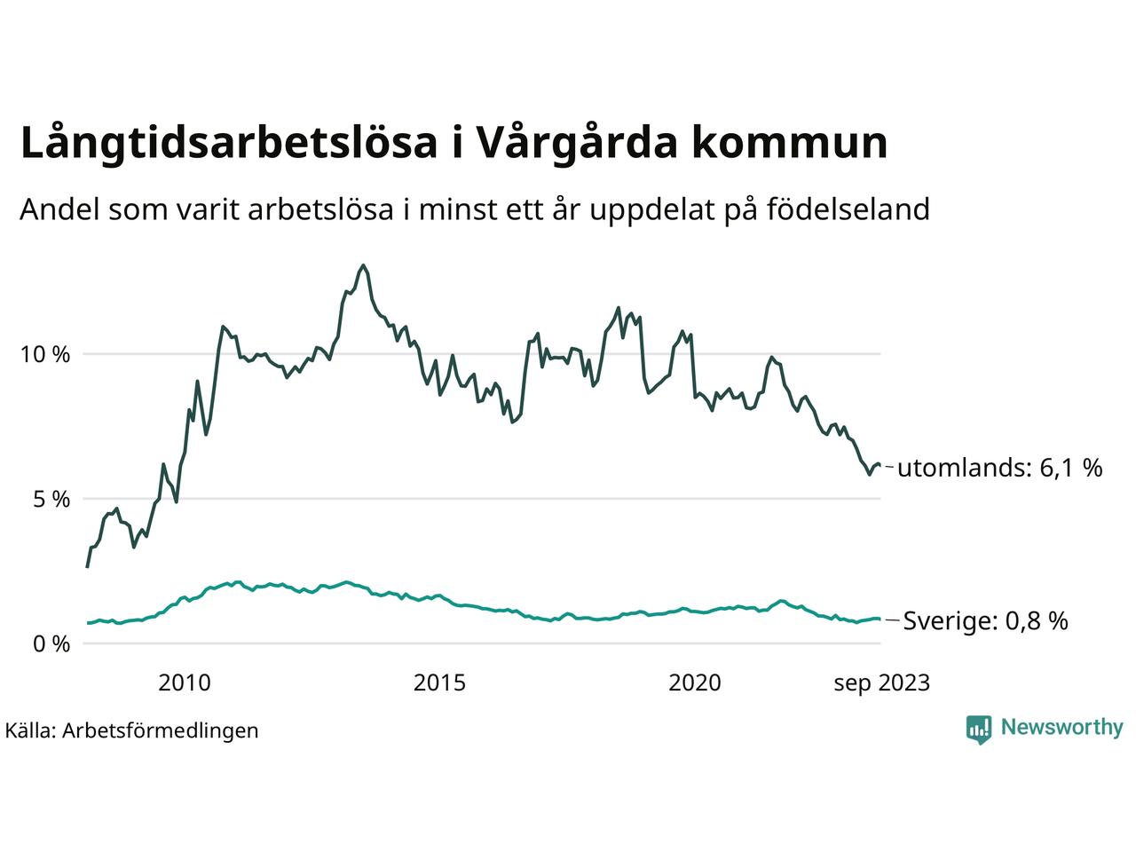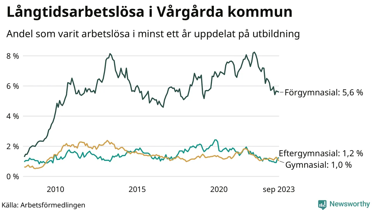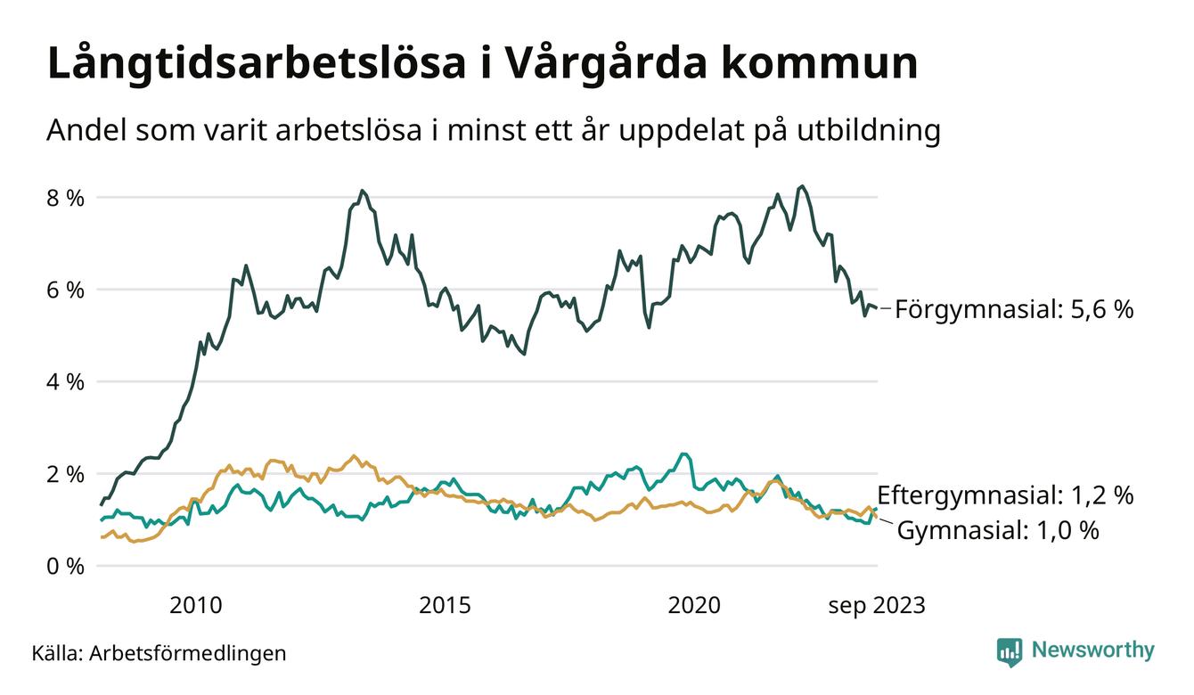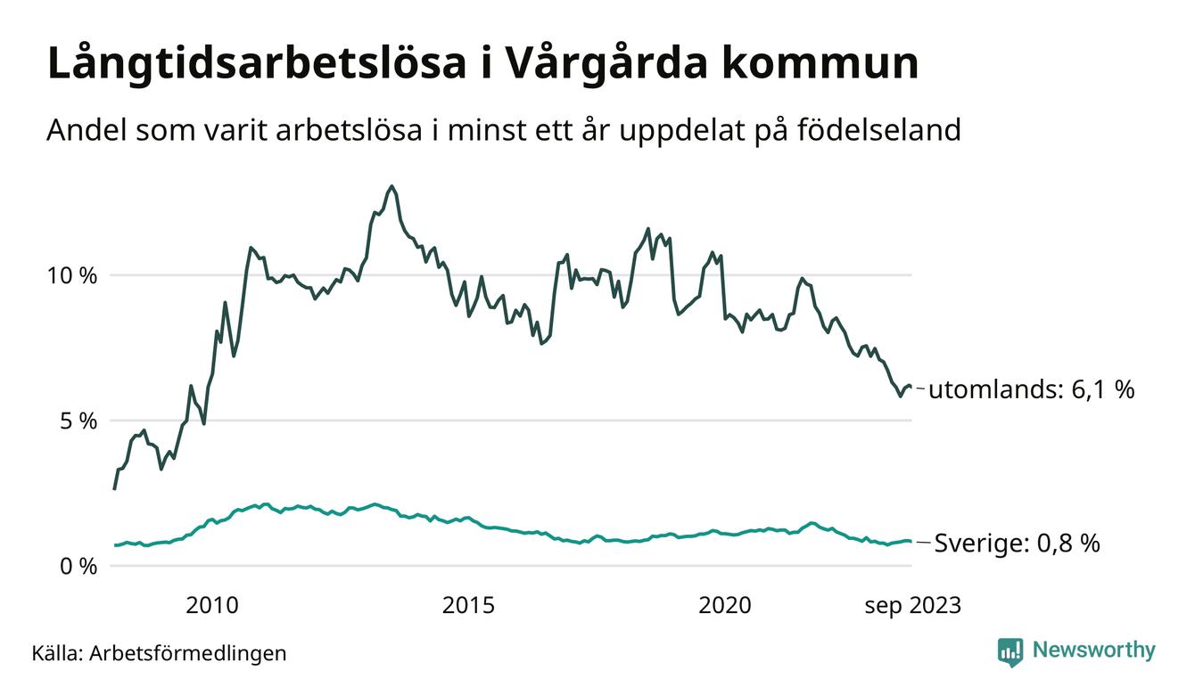 I september hade 105 Vårgårdabor varit arbetslösa i minst ett år, vilket är tre färre än månaden innan. 105 personer motsvarar 1,7 procent av arbetskraften i kommunen – andelen långtidsarbetslösa är 0,3 procentenheter lägre än samma månad för ett år sedan.