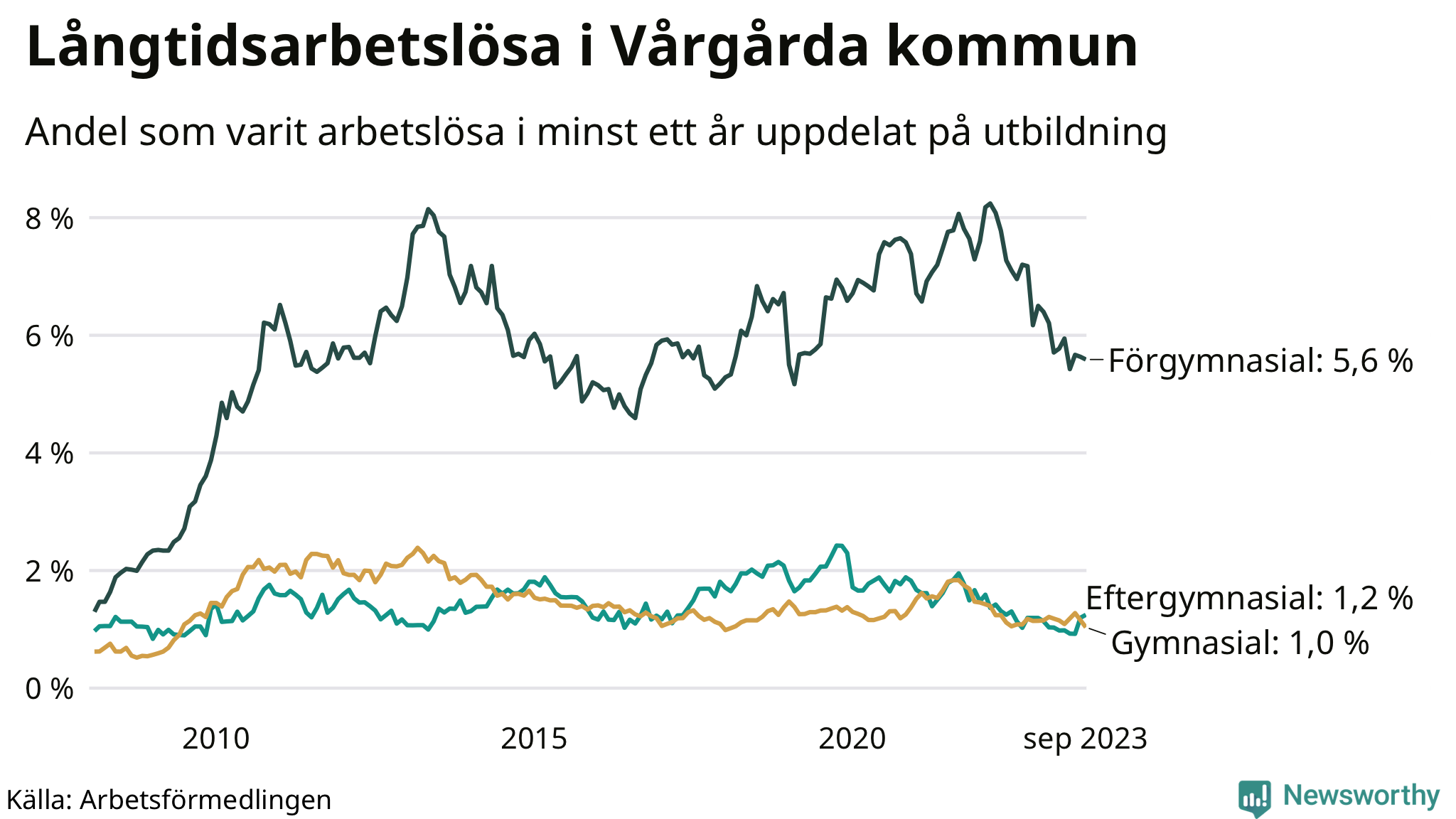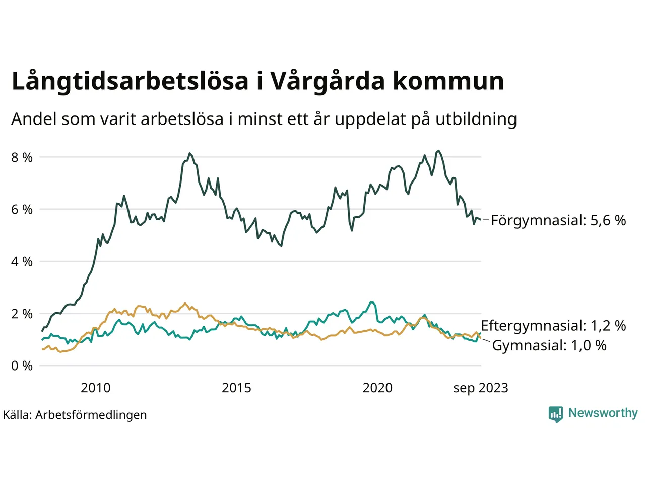 | Bland dem utan gymnasieutbildning | 5,6 % | 7,8 % | 9,6 % |