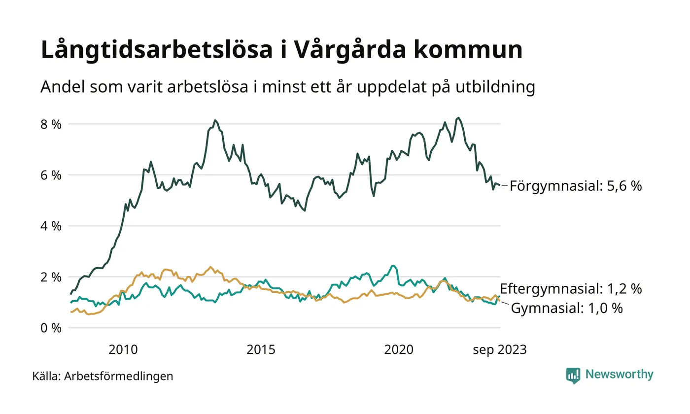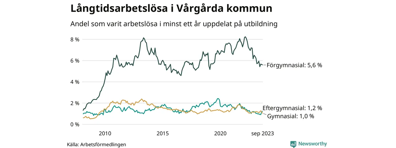 Andelen som varit utan arbete i minst ett år i Vårgårda var lägre i september jämfört med samma månad för ett år sedan. Det visar Arbetsfömedlingens senaste månadsstatistik.