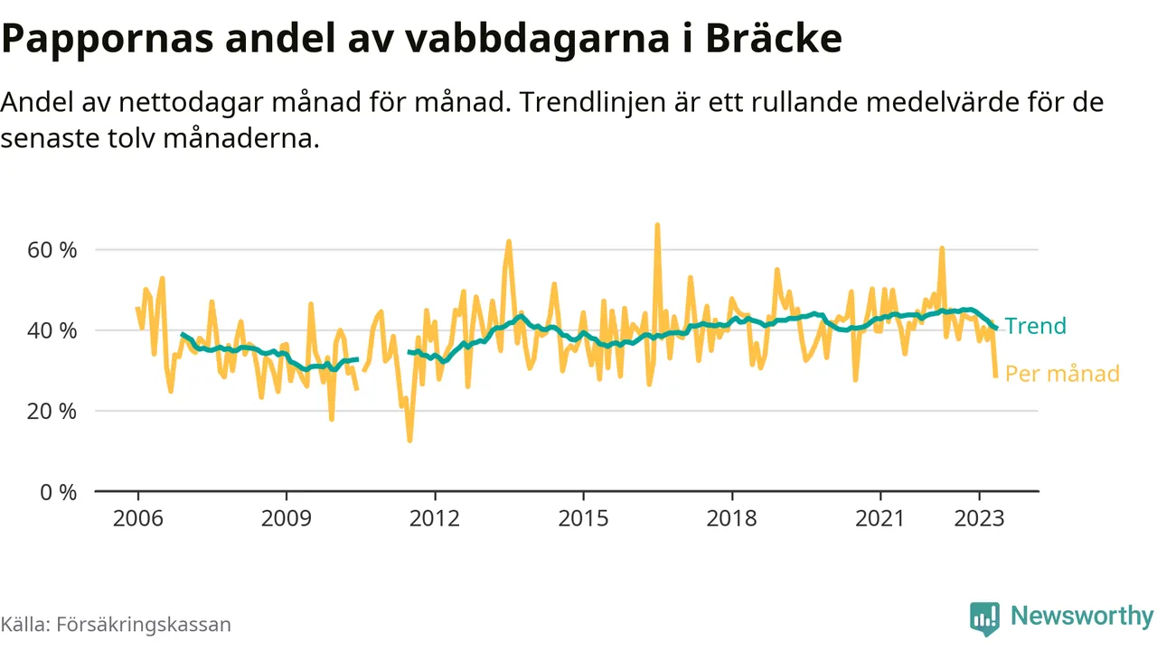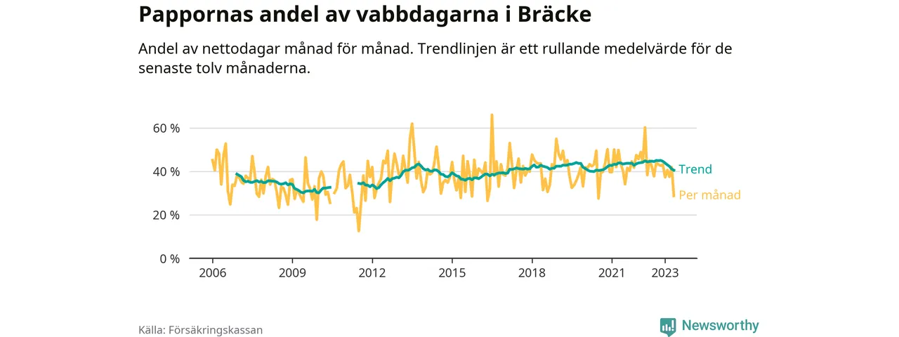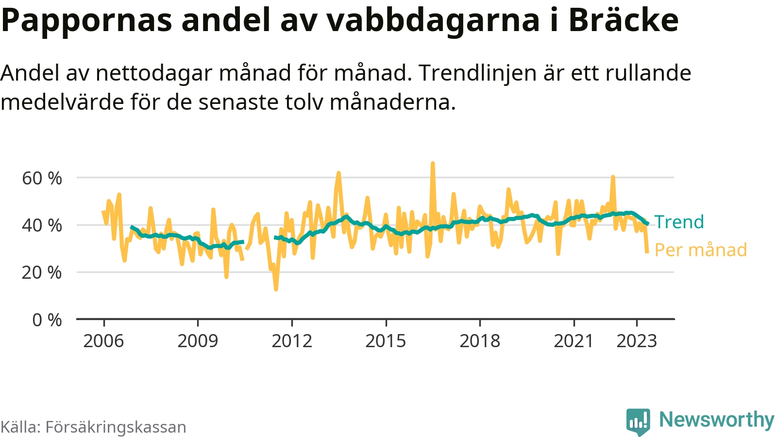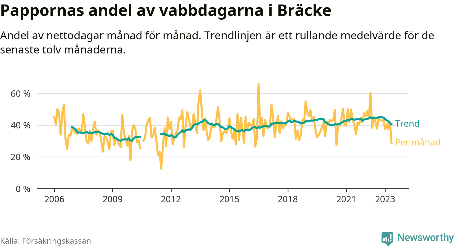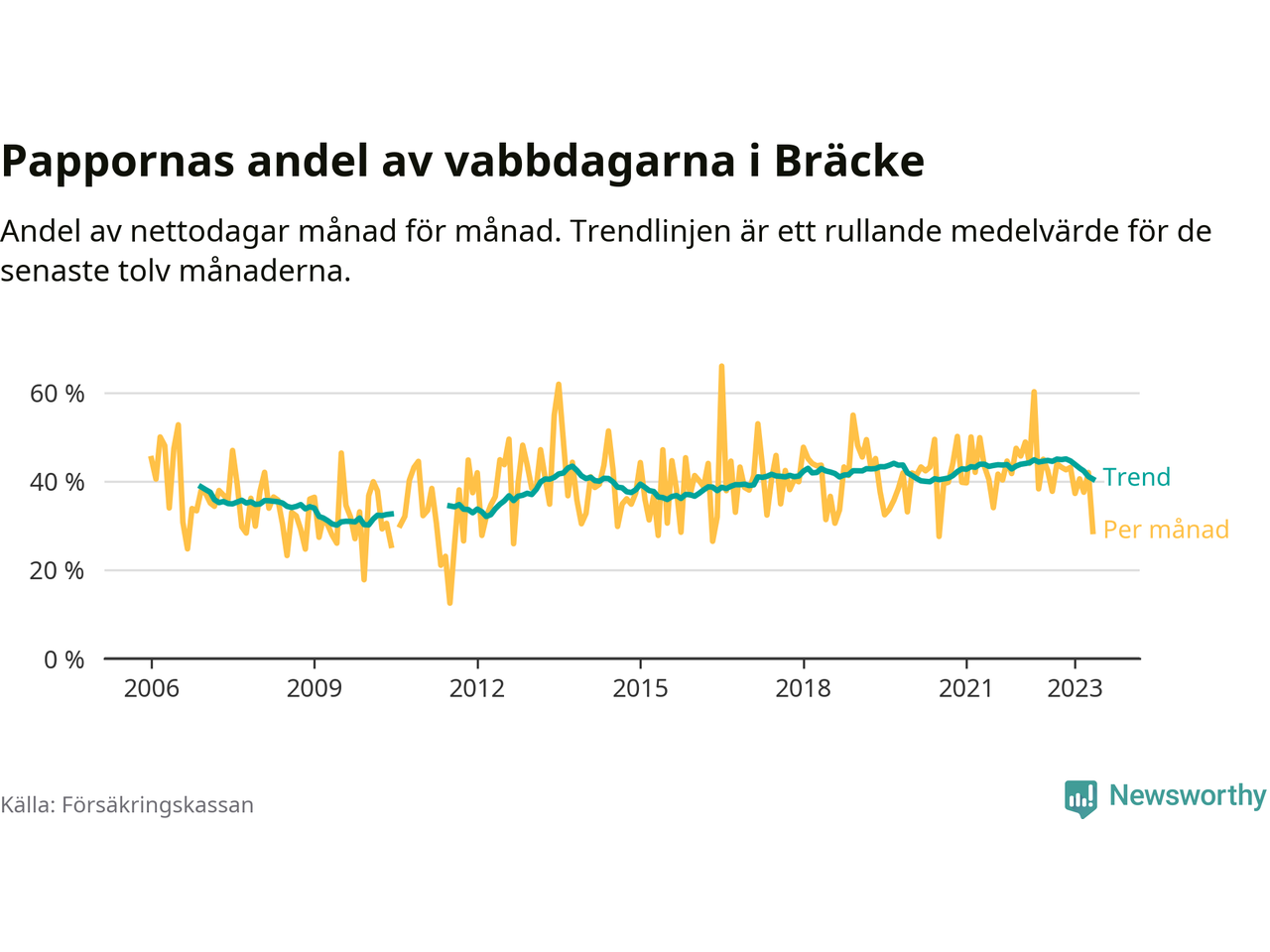 I Bräcke kommun peakade pappornas uttag hösten 2022 då kommunens fäder var uppe i 45 procent av vabbdagarna 1. Under de senaste tolv månaderna har männen stått för 41 procent av vabb i kommunen.