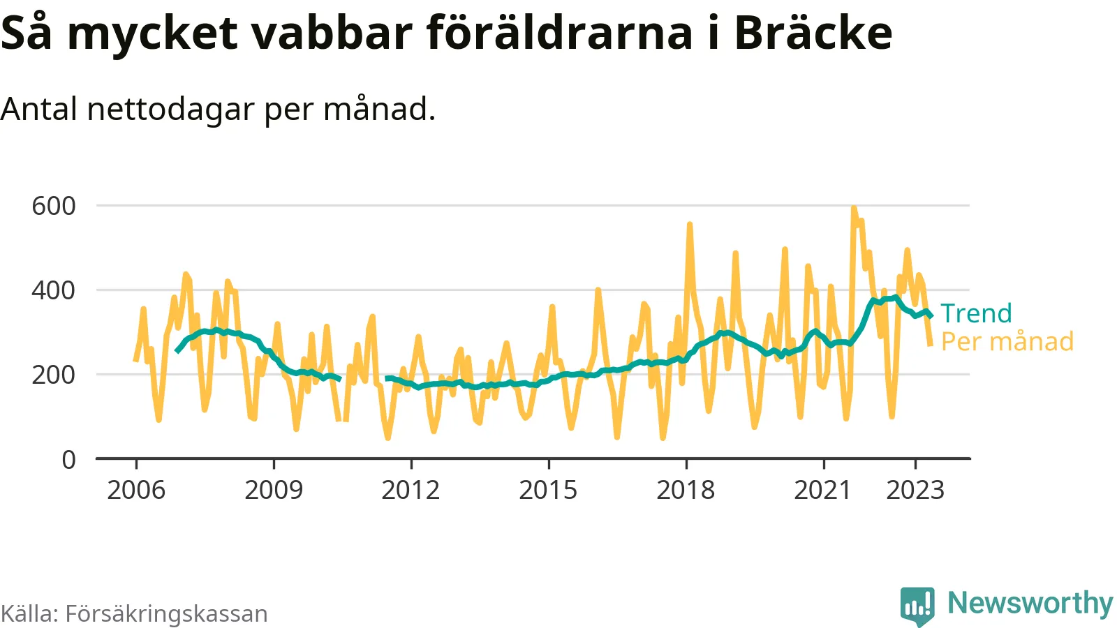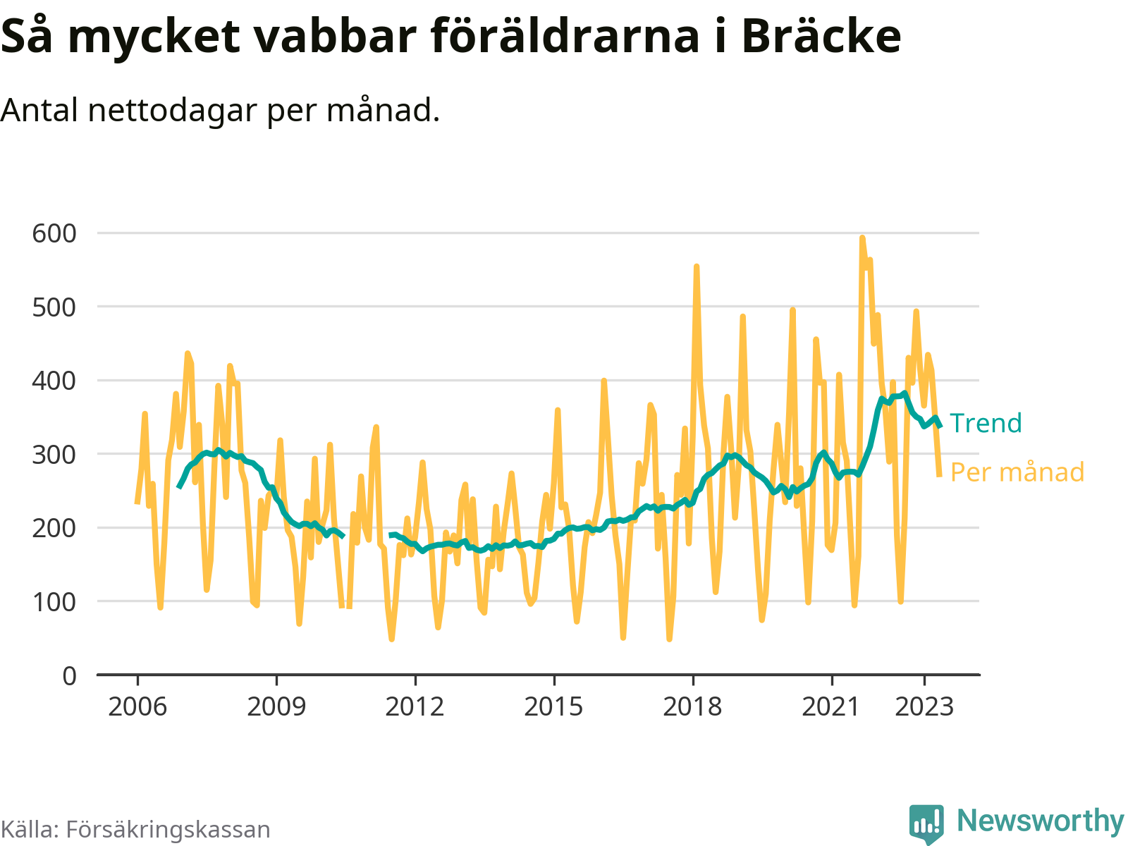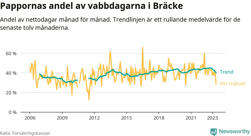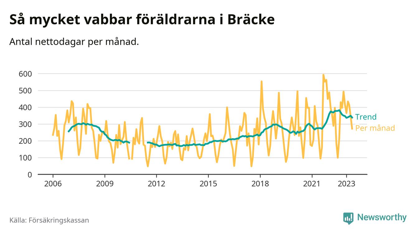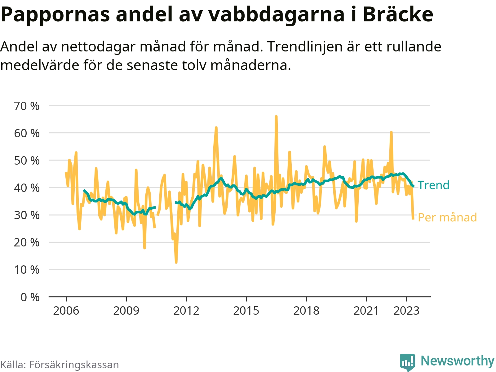 I Bräcke kommun peakade pappornas uttag hösten 2022 då kommunens fäder var uppe i 45 procent av vabbdagarna 1. Under de senaste tolv månaderna har männen stått för 41 procent av vabb i kommunen.