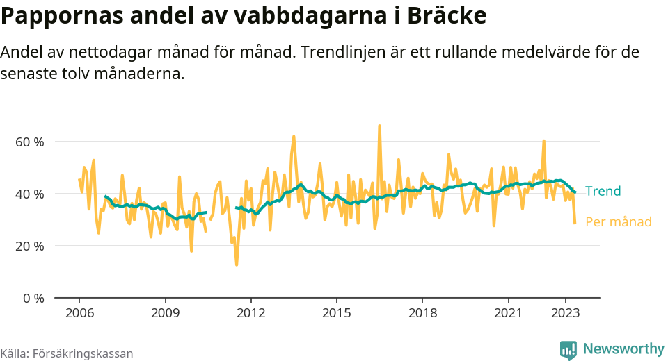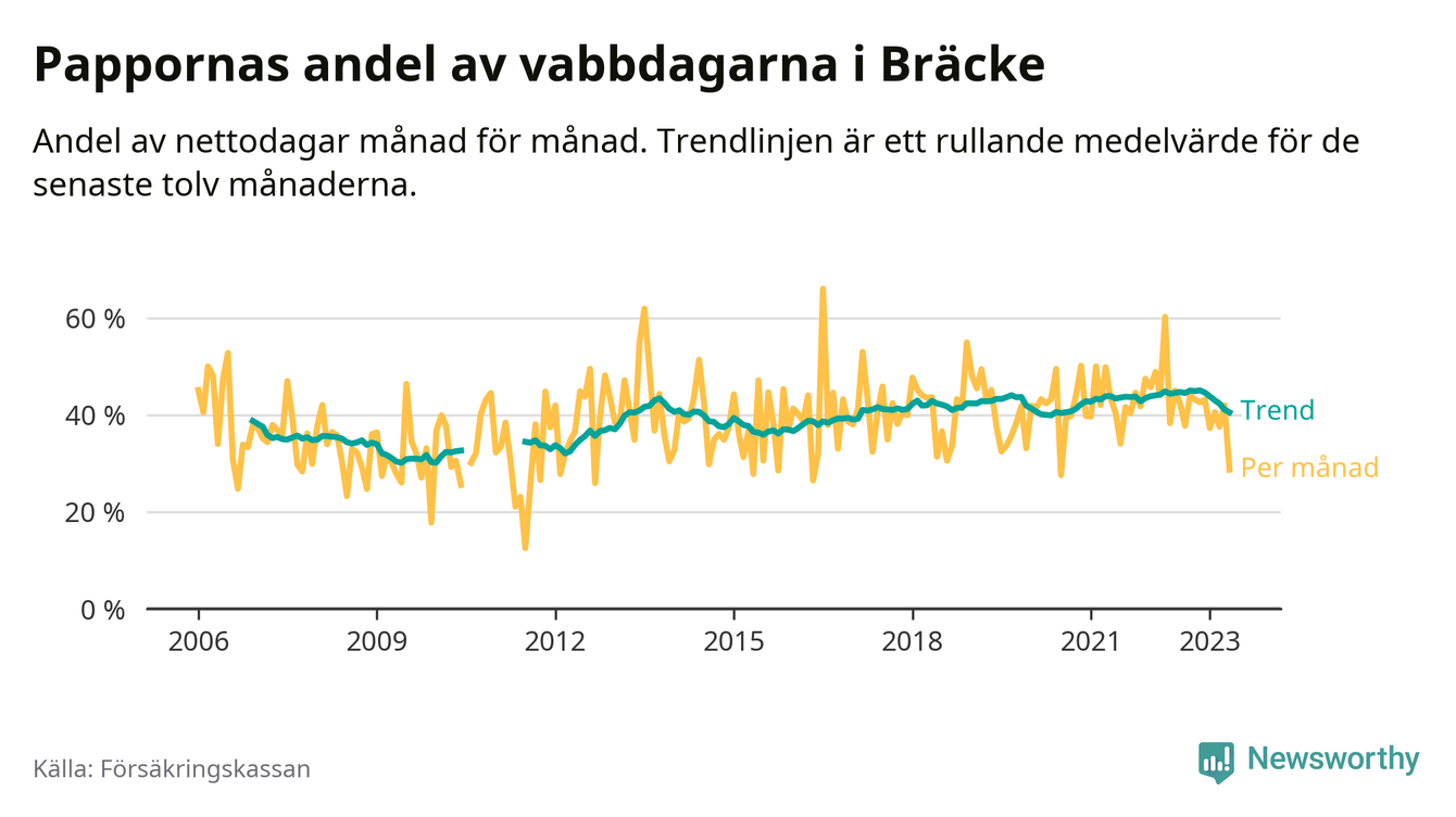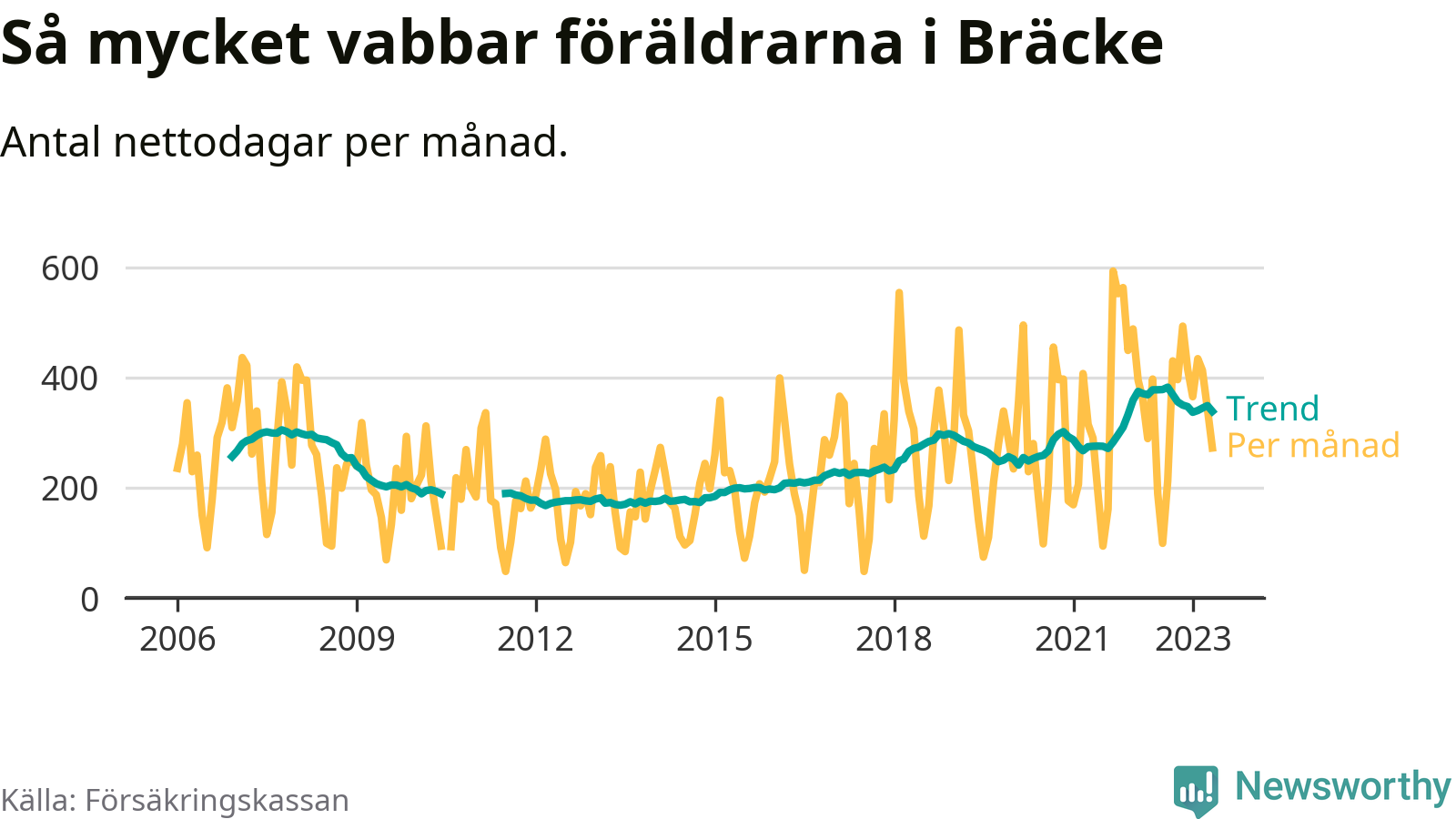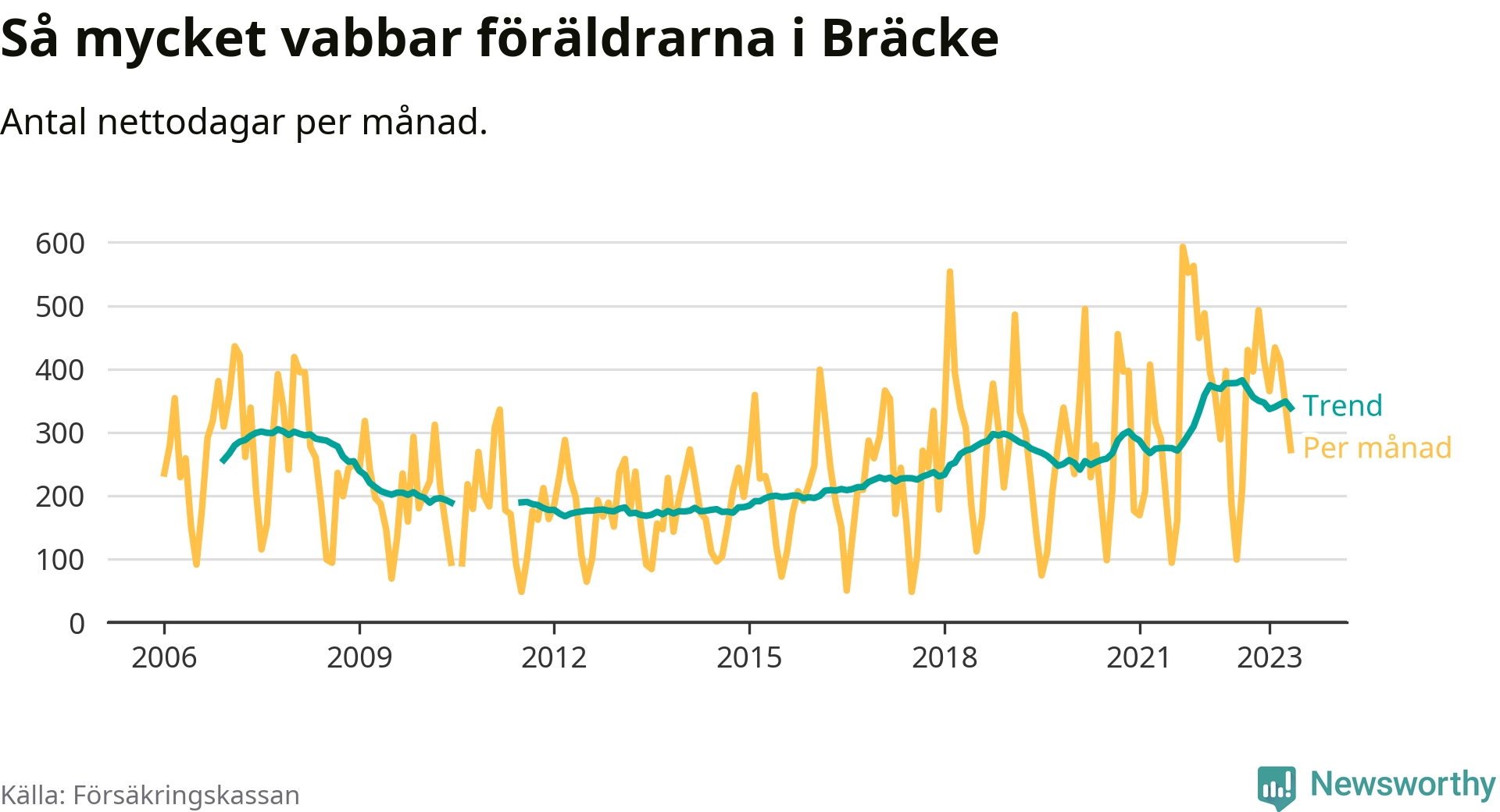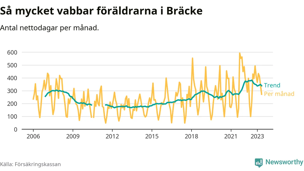 I Bräcke kommun peakade pappornas uttag hösten 2022 då kommunens fäder var uppe i 45 procent av vabbdagarna 1. Under de senaste tolv månaderna har männen stått för 41 procent av vabb i kommunen.