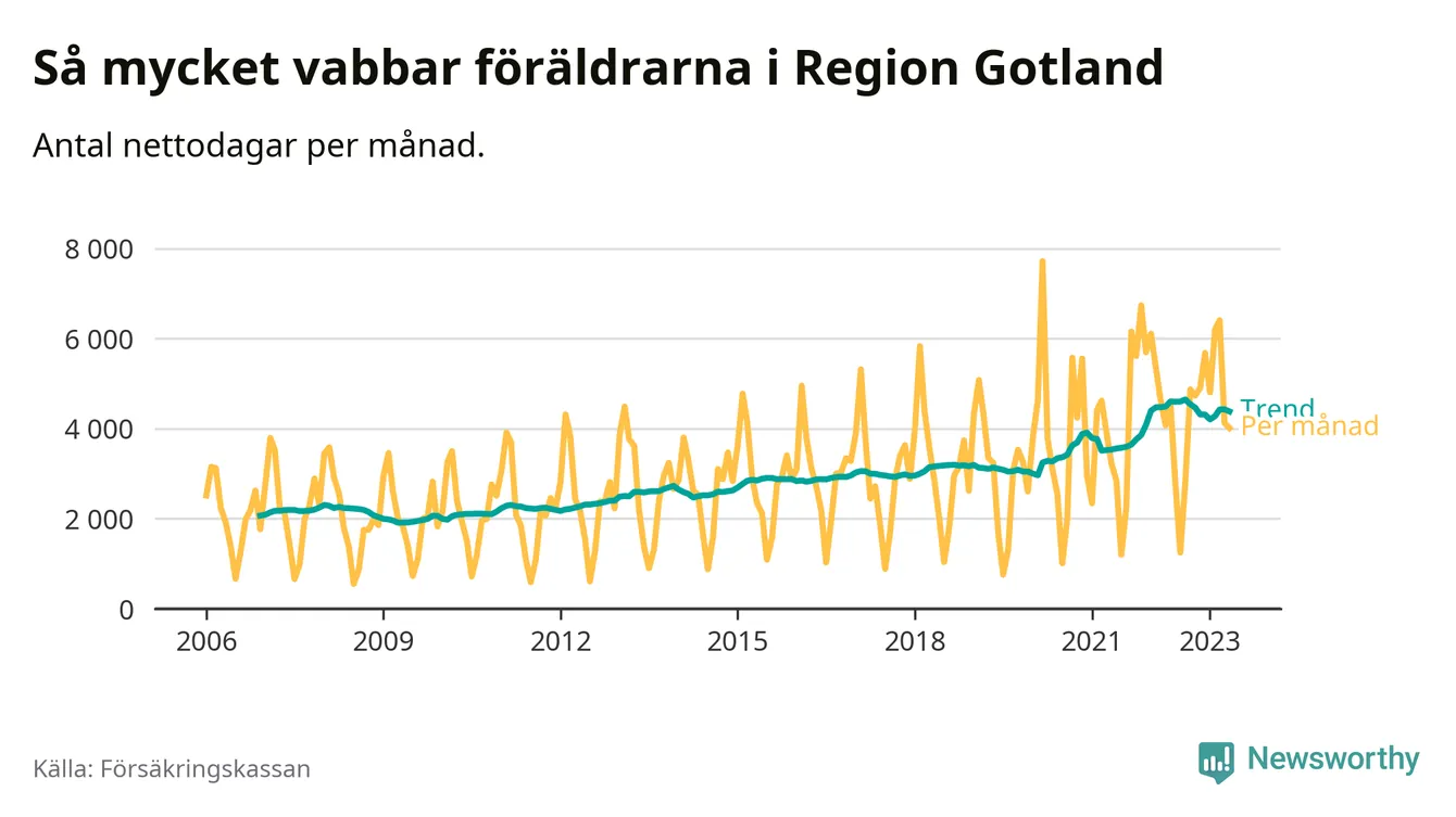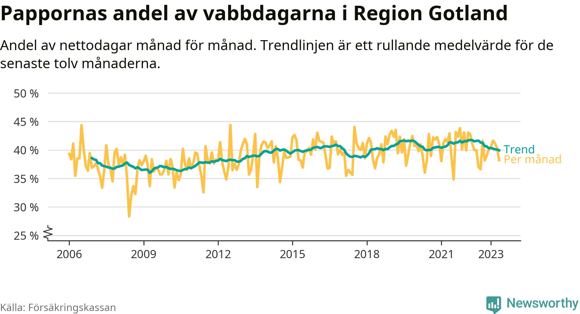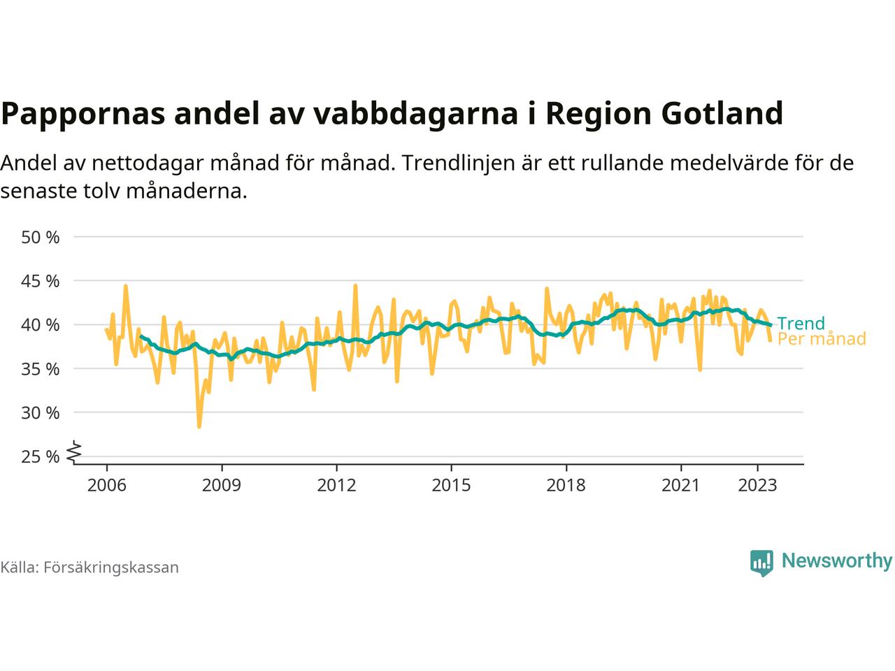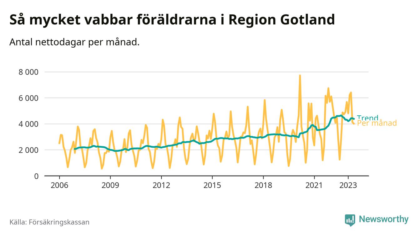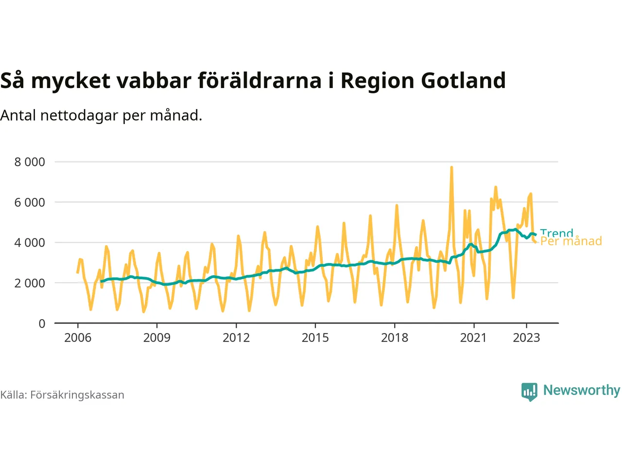 I Region Gotland peakade pappornas uttag våren 2022 då kommunens fäder var uppe i 42 procent av vabbdagarna 1. Under de senaste tolv månaderna har männen stått för 40 procent av vabb i kommunen.