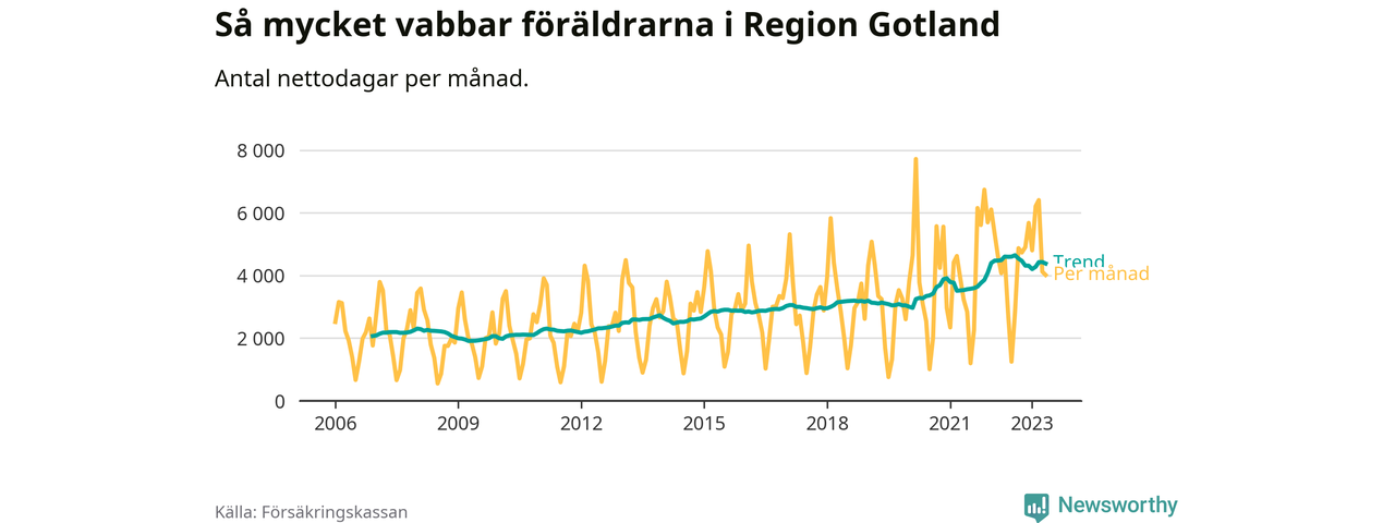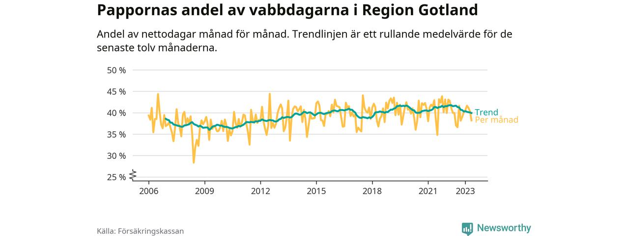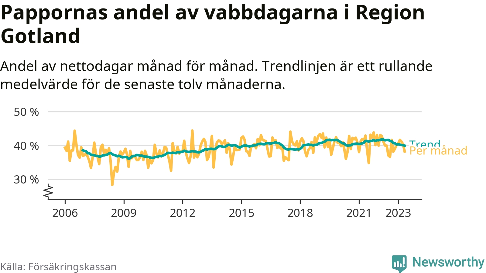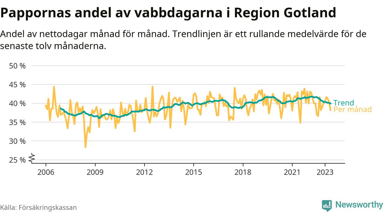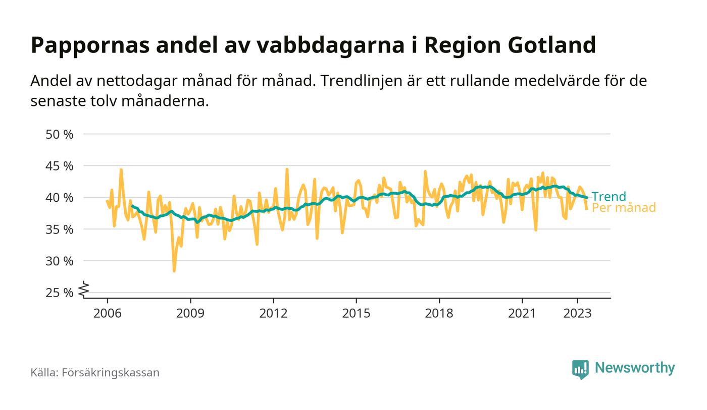 I Region Gotland peakade pappornas uttag våren 2022 då kommunens fäder var uppe i 42 procent av vabbdagarna 1. Under de senaste tolv månaderna har männen stått för 40 procent av vabb i kommunen.