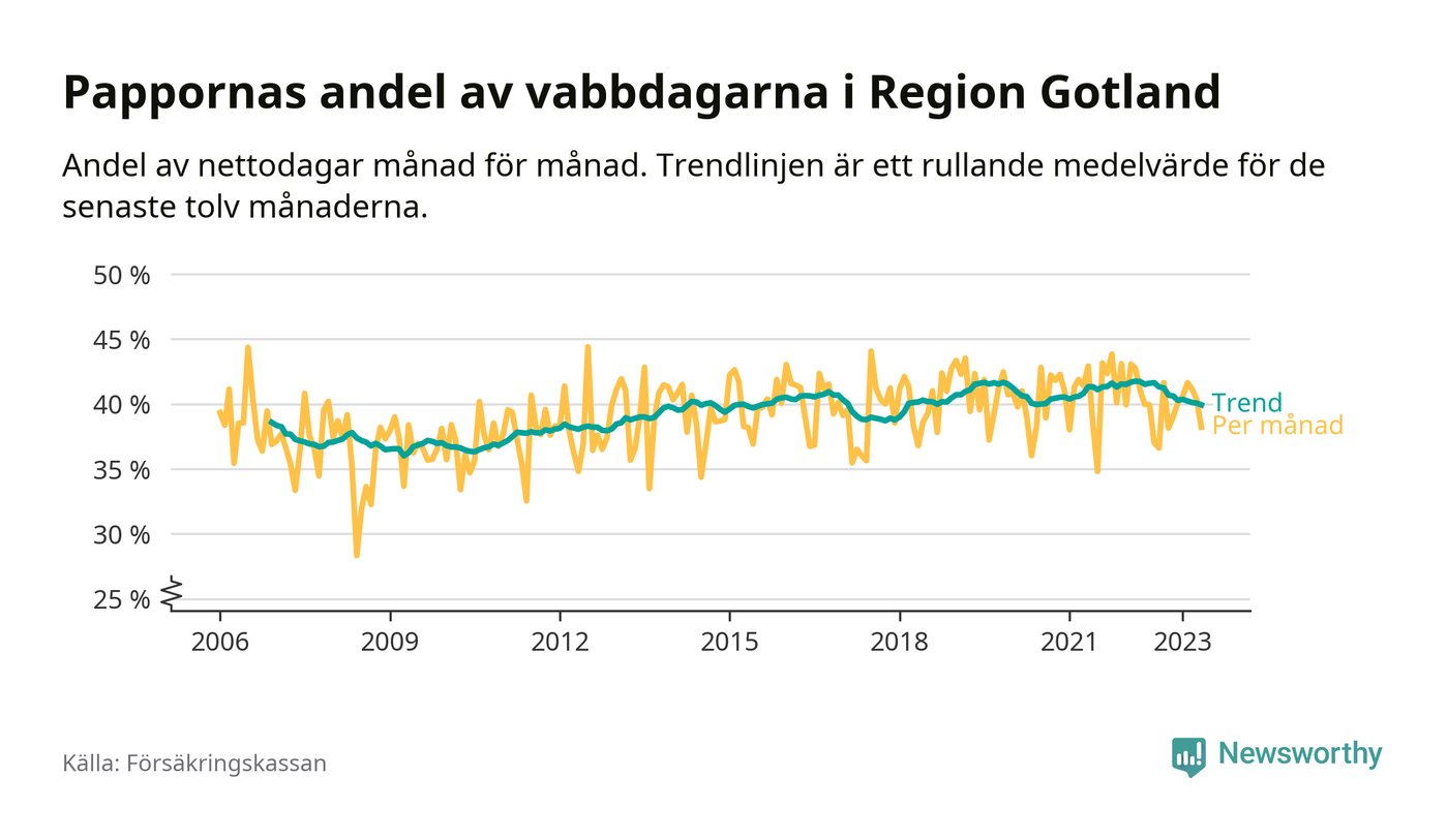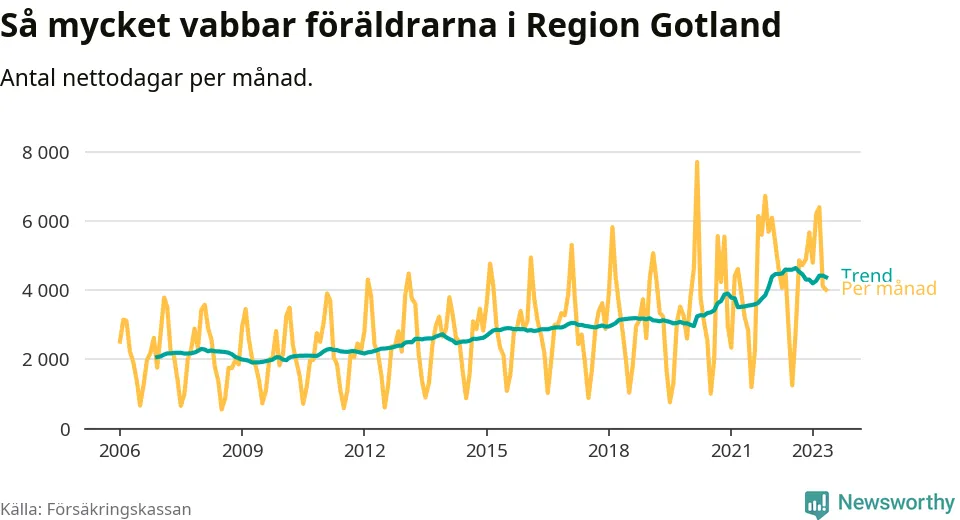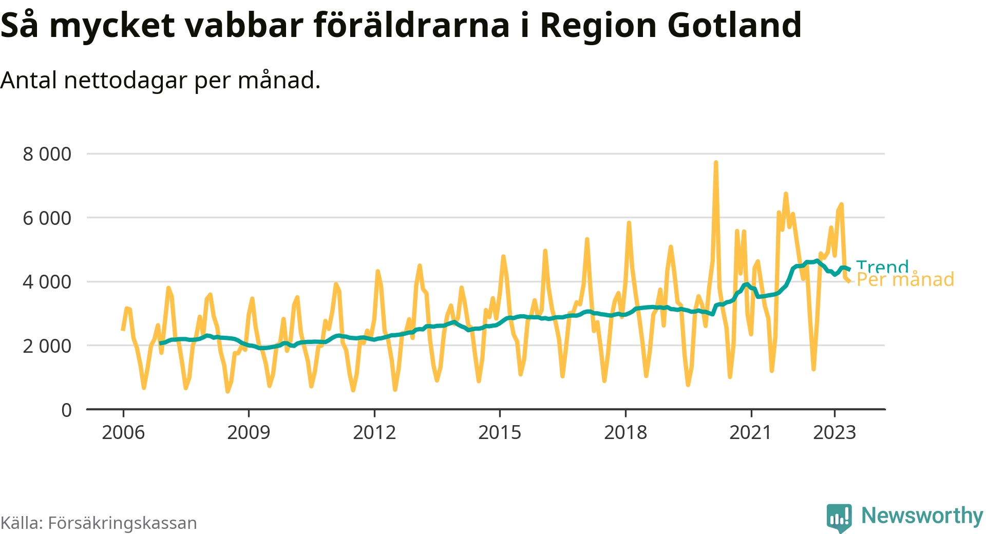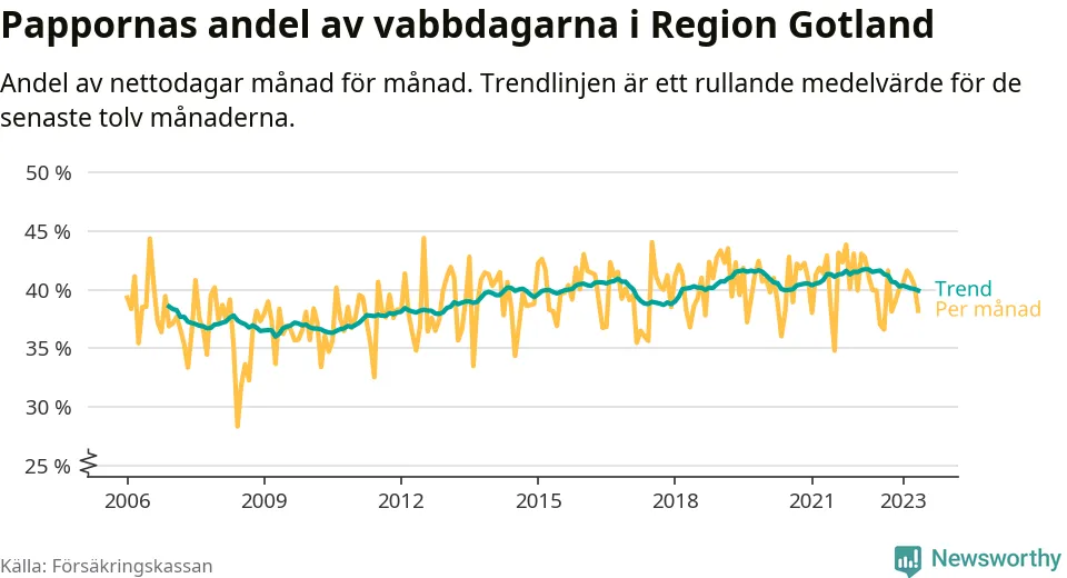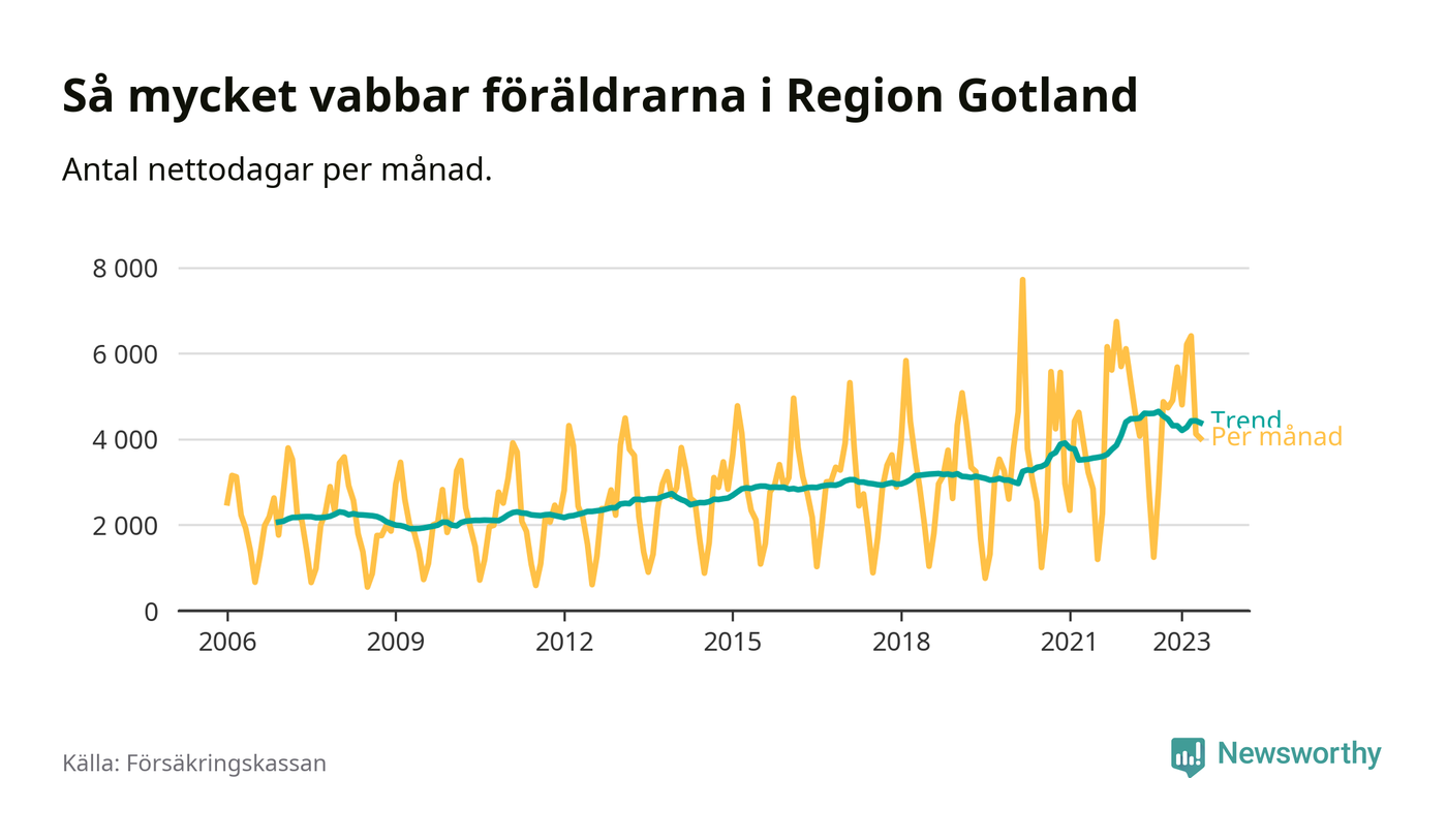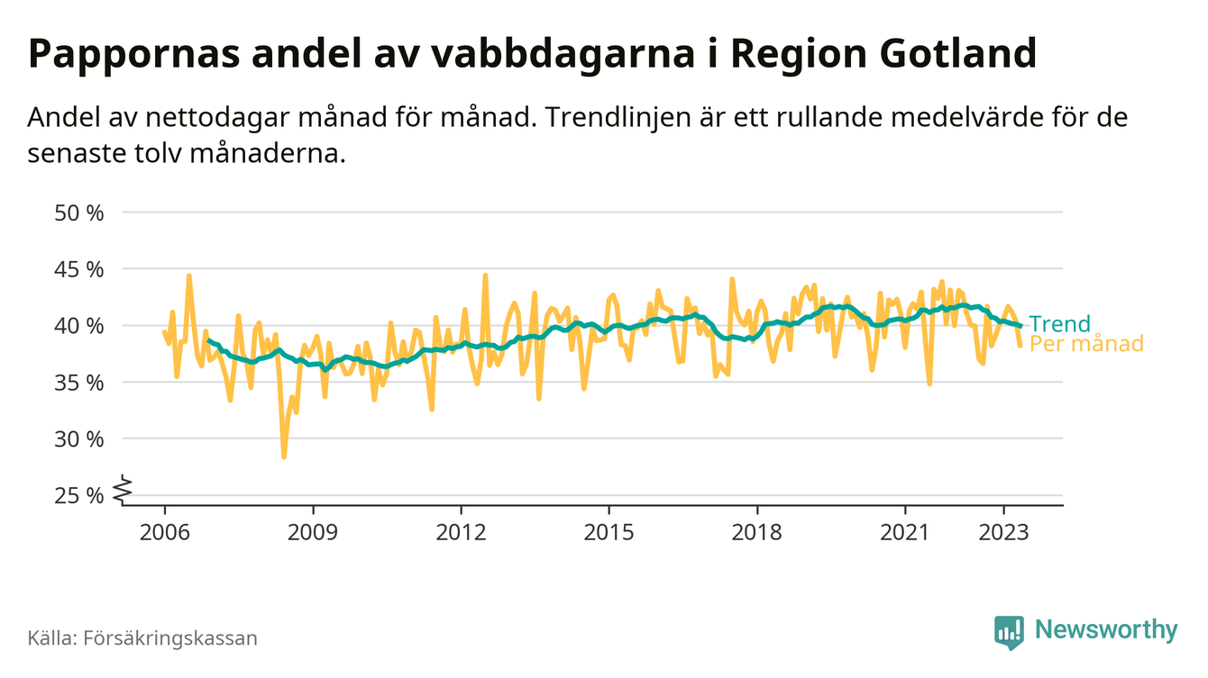 I Region Gotland peakade pappornas uttag våren 2022 då kommunens fäder var uppe i 42 procent av vabbdagarna 1. Under de senaste tolv månaderna har männen stått för 40 procent av vabb i kommunen.