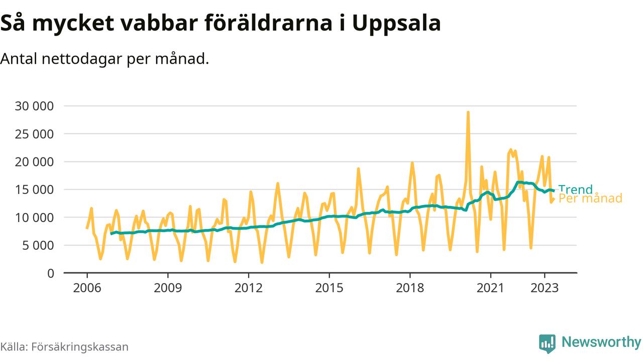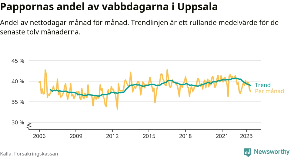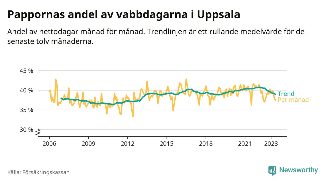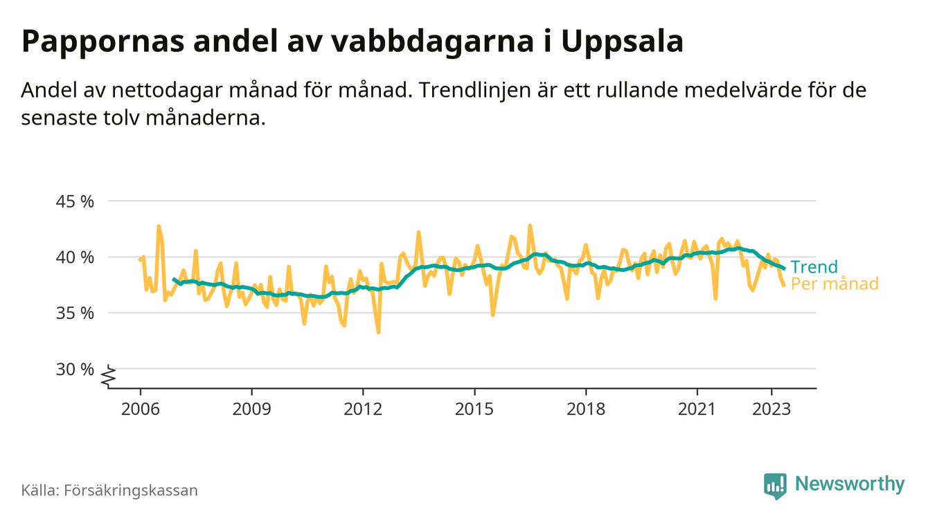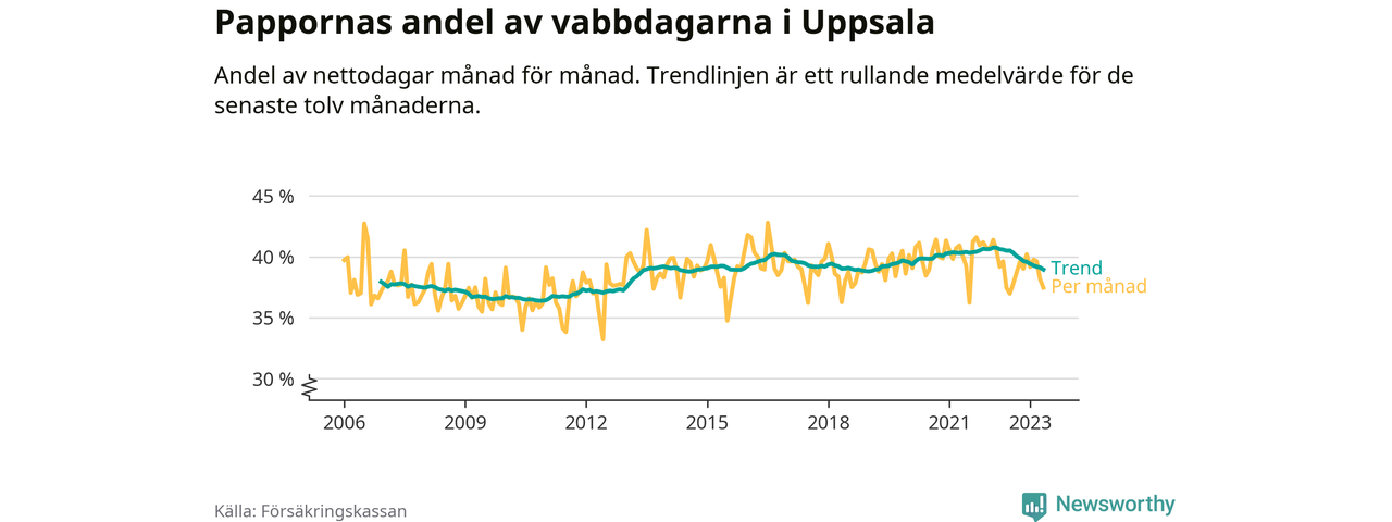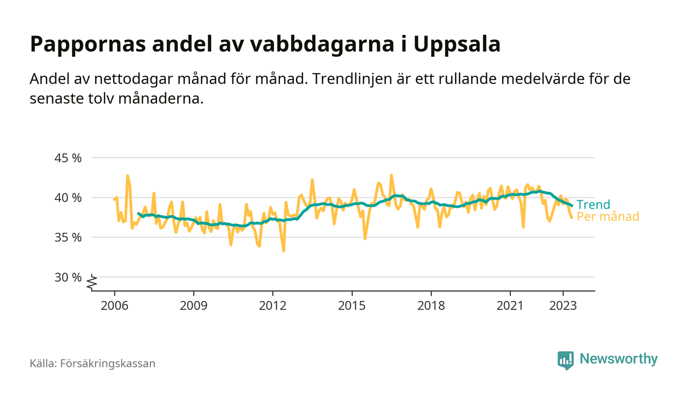 I Uppsala kommun peakade pappornas uttag vintern 2022 då kommunens fäder var uppe i 41 procent av vabbdagarna 1. Under de senaste tolv månaderna har männen stått för 39 procent av vabb i kommunen.