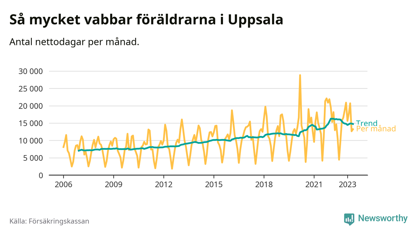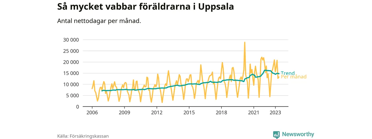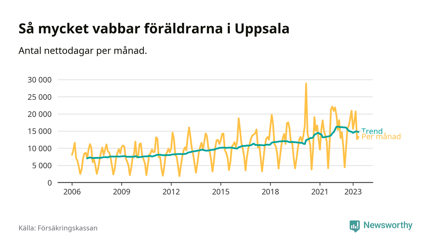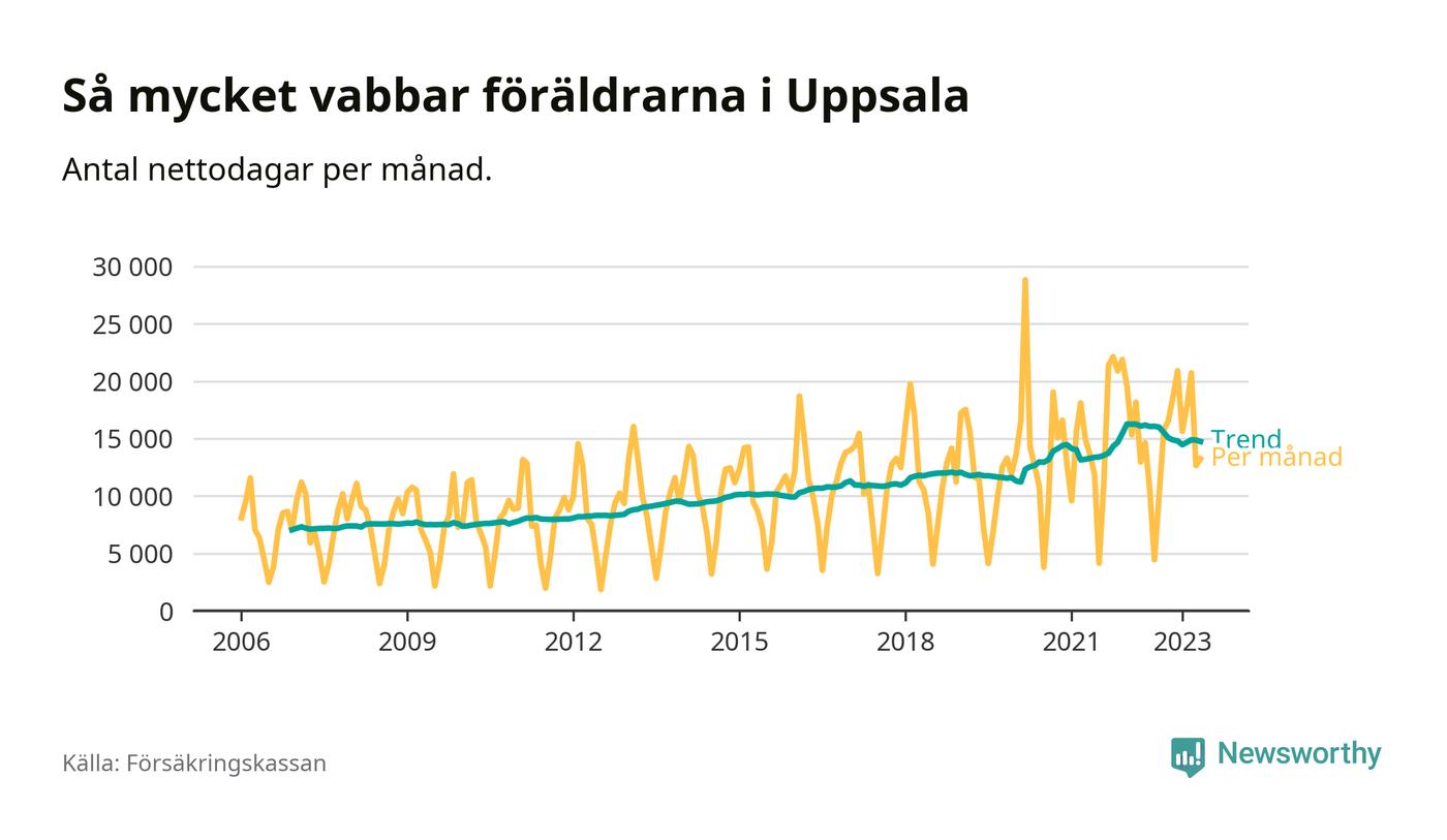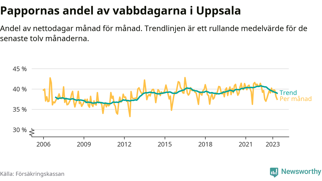 I Uppsala kommun peakade pappornas uttag vintern 2022 då kommunens fäder var uppe i 41 procent av vabbdagarna 1. Under de senaste tolv månaderna har männen stått för 39 procent av vabb i kommunen.