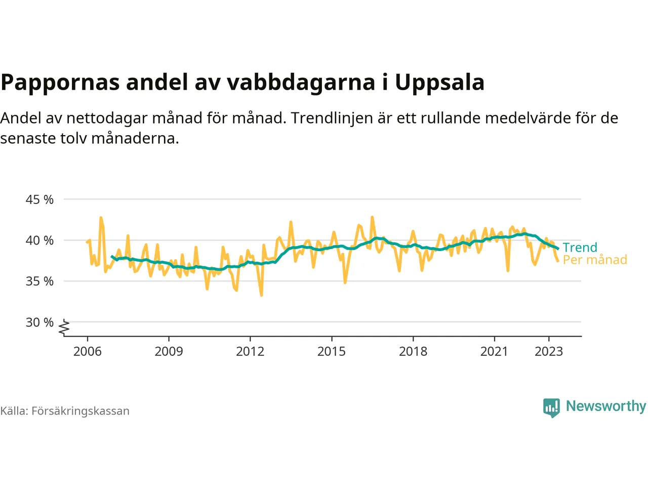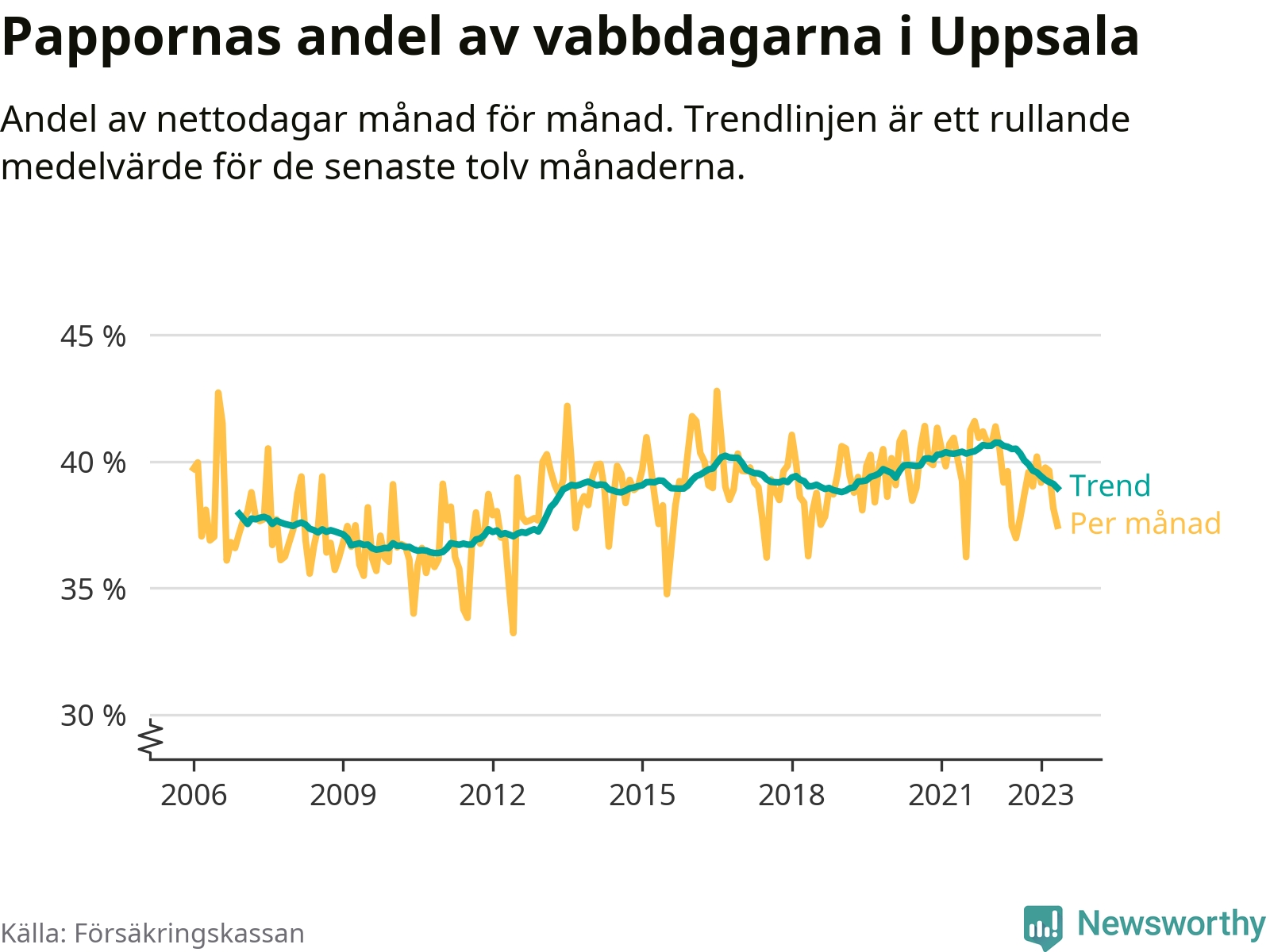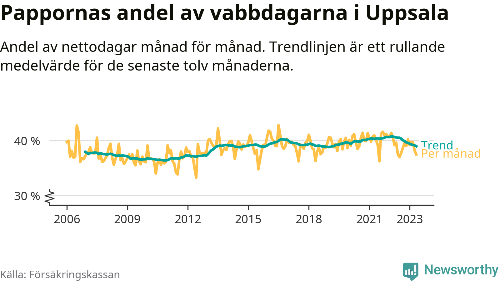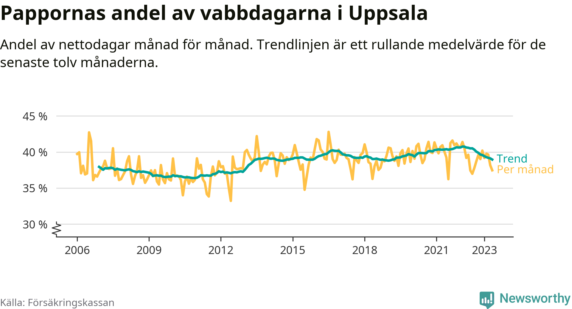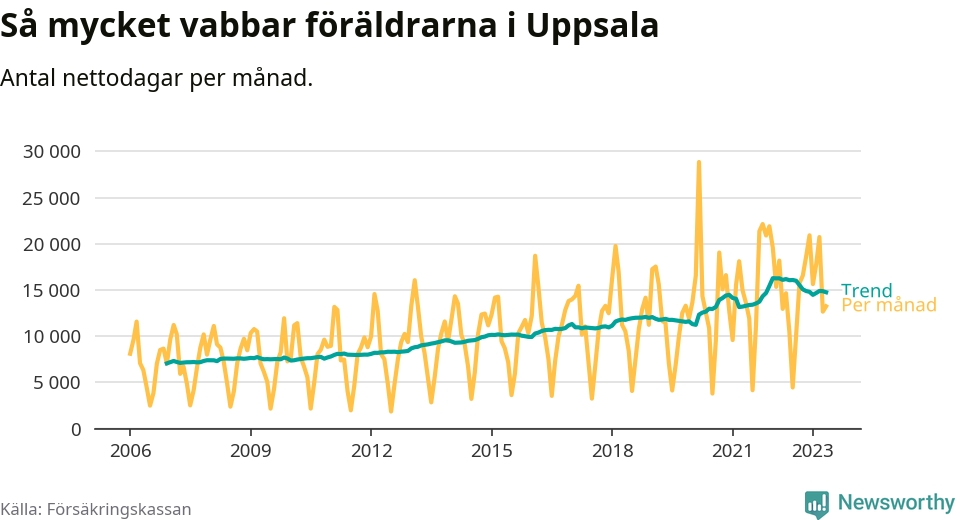 I Uppsala kommun peakade pappornas uttag vintern 2022 då kommunens fäder var uppe i 41 procent av vabbdagarna 1. Under de senaste tolv månaderna har männen stått för 39 procent av vabb i kommunen.