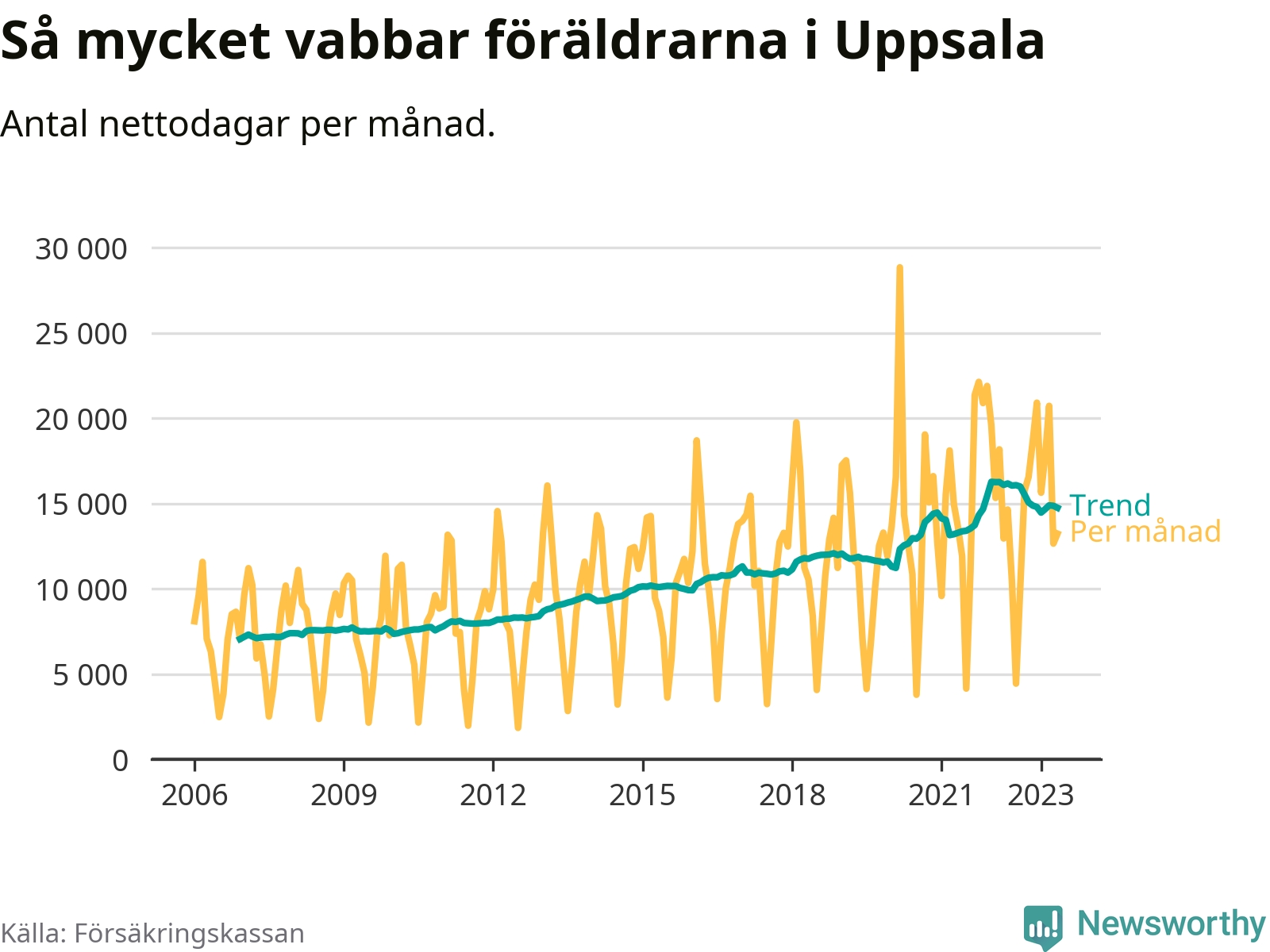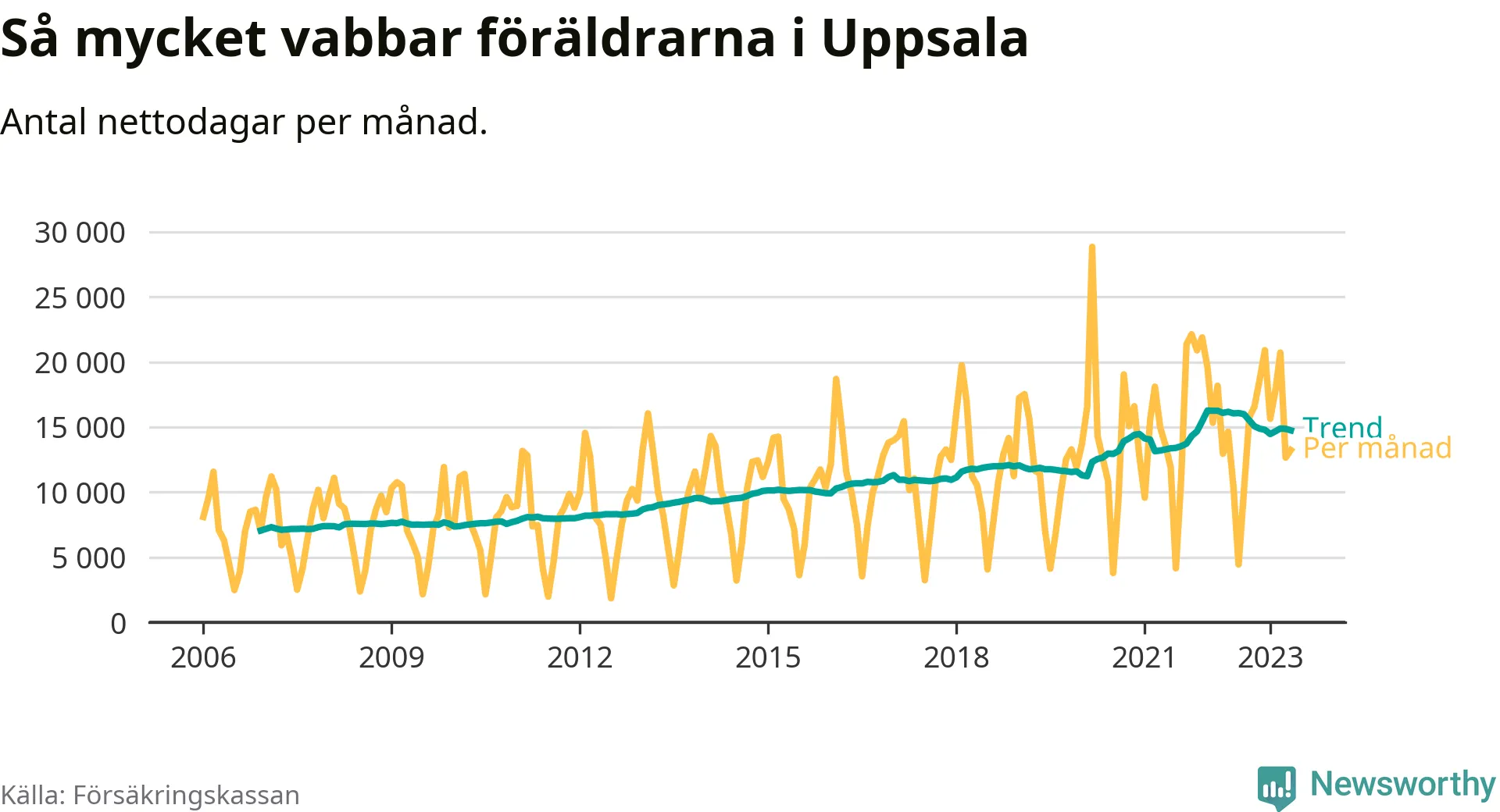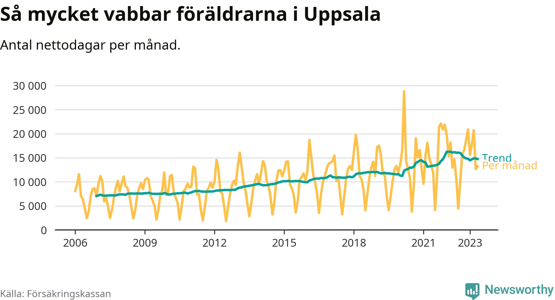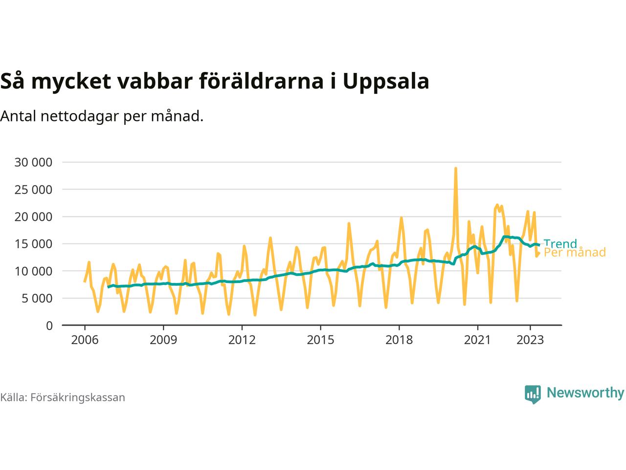I Uppsala kommun peakade pappornas uttag vintern 2022 då kommunens fäder var uppe i 41 procent av vabbdagarna 1. Under de senaste tolv månaderna har männen stått för 39 procent av vabb i kommunen.