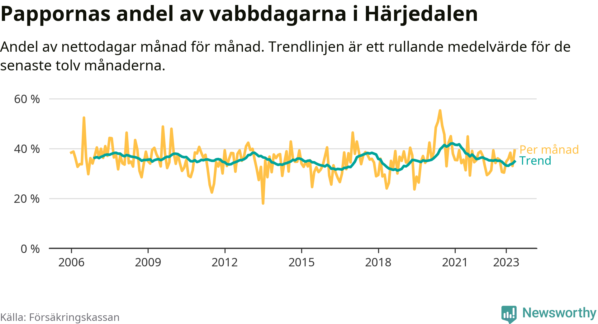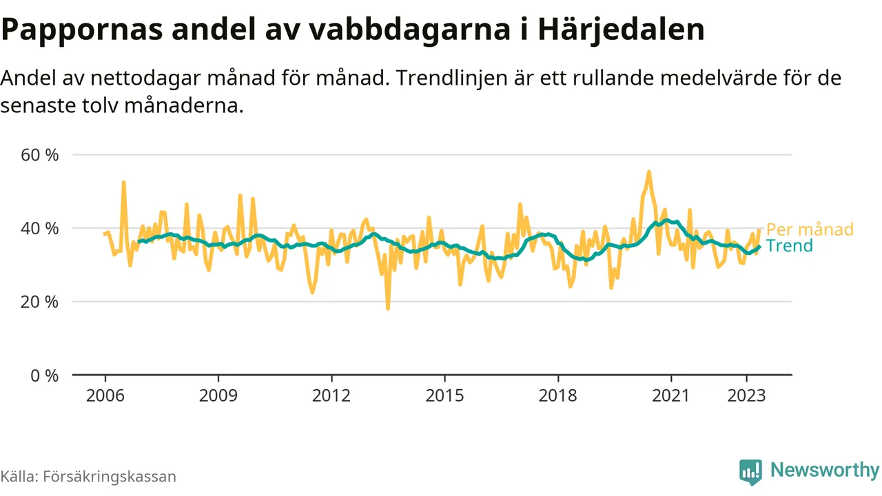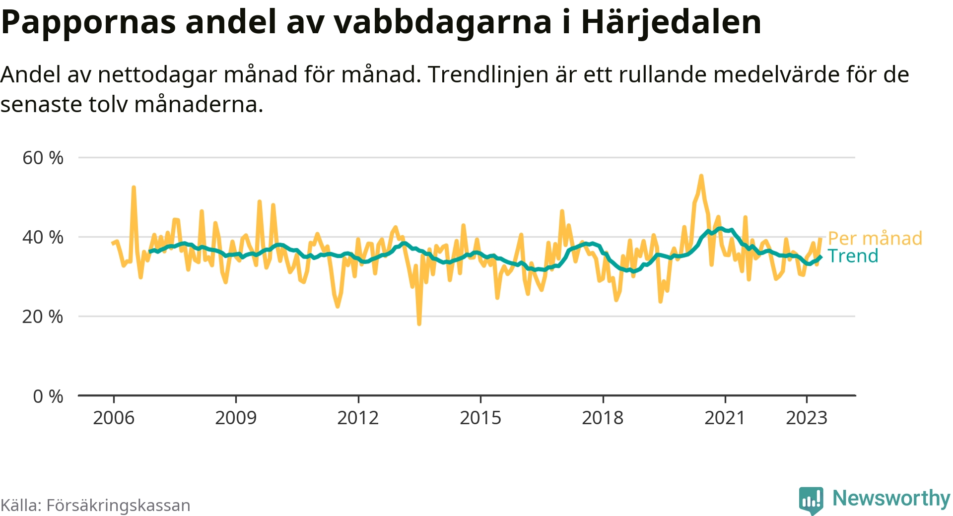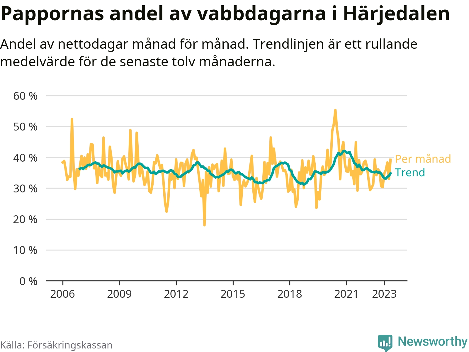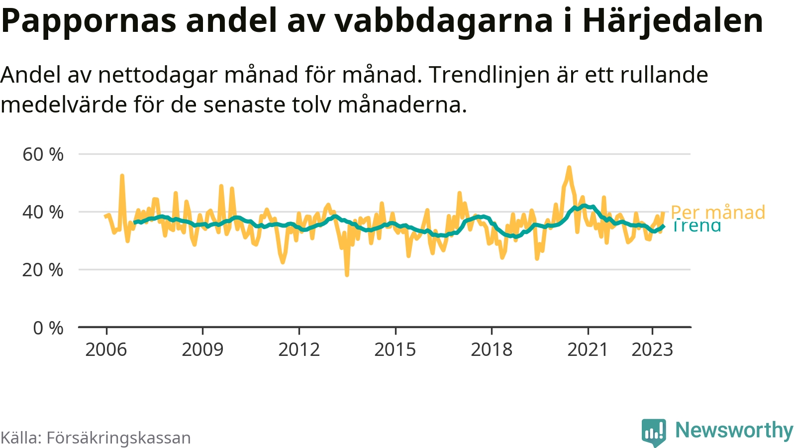 I Härjedalens kommun peakade pappornas uttag vintern 2020 då kommunens fäder var uppe i 42 procent av vabbdagarna 1. Under de senaste tolv månaderna har männen stått för 35 procent av vabb i kommunen.